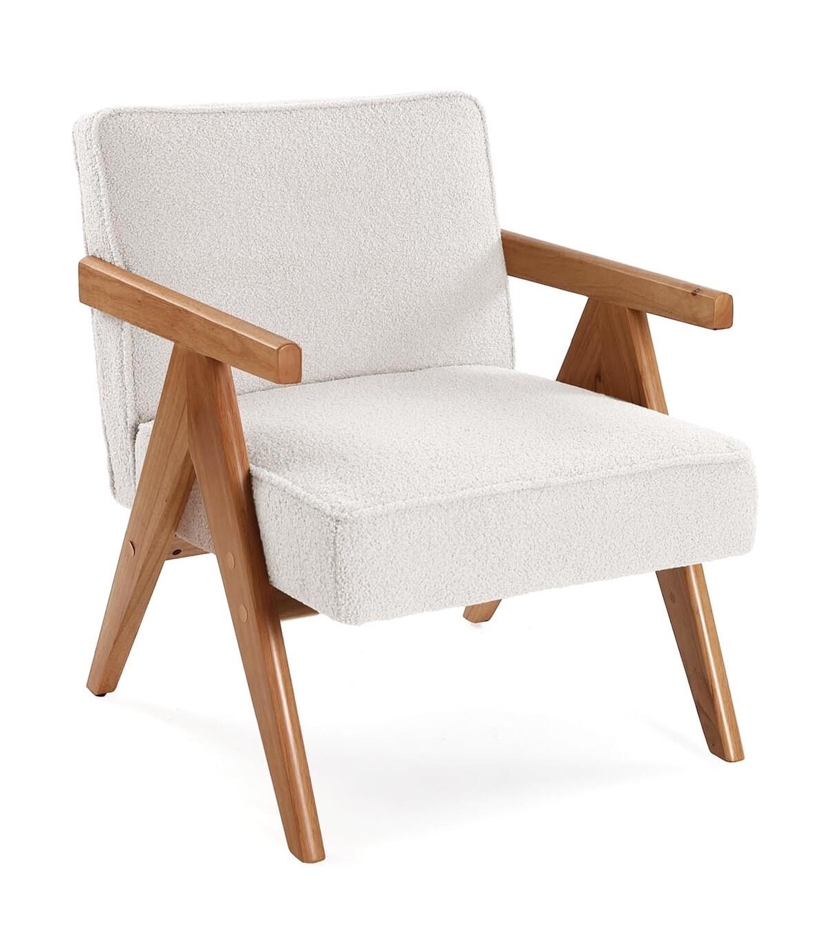 ❄️ Sillón Tapizado en Bouclé Blanco con Madera Cerezo – Estilo Nórdico Natural 🪵