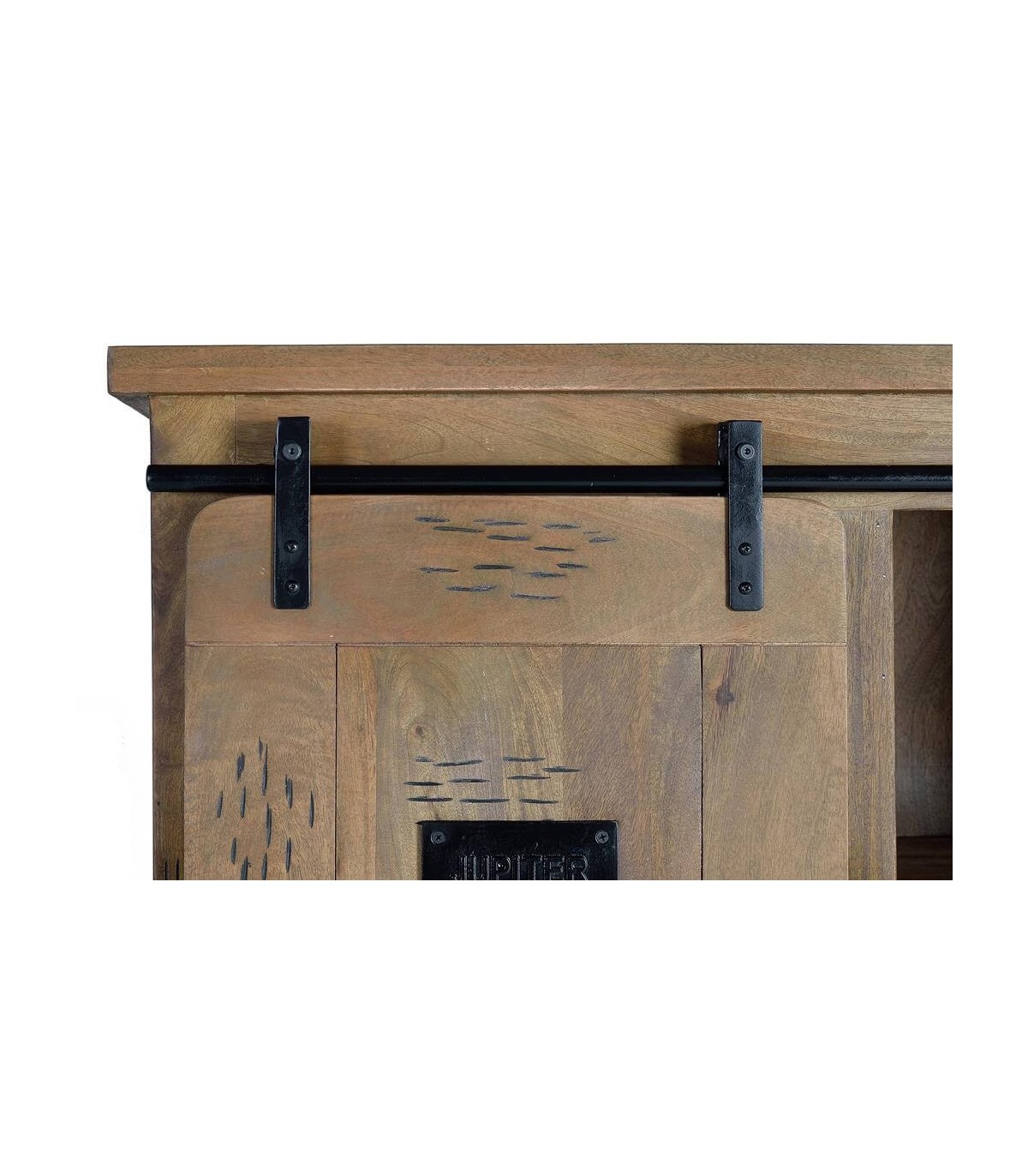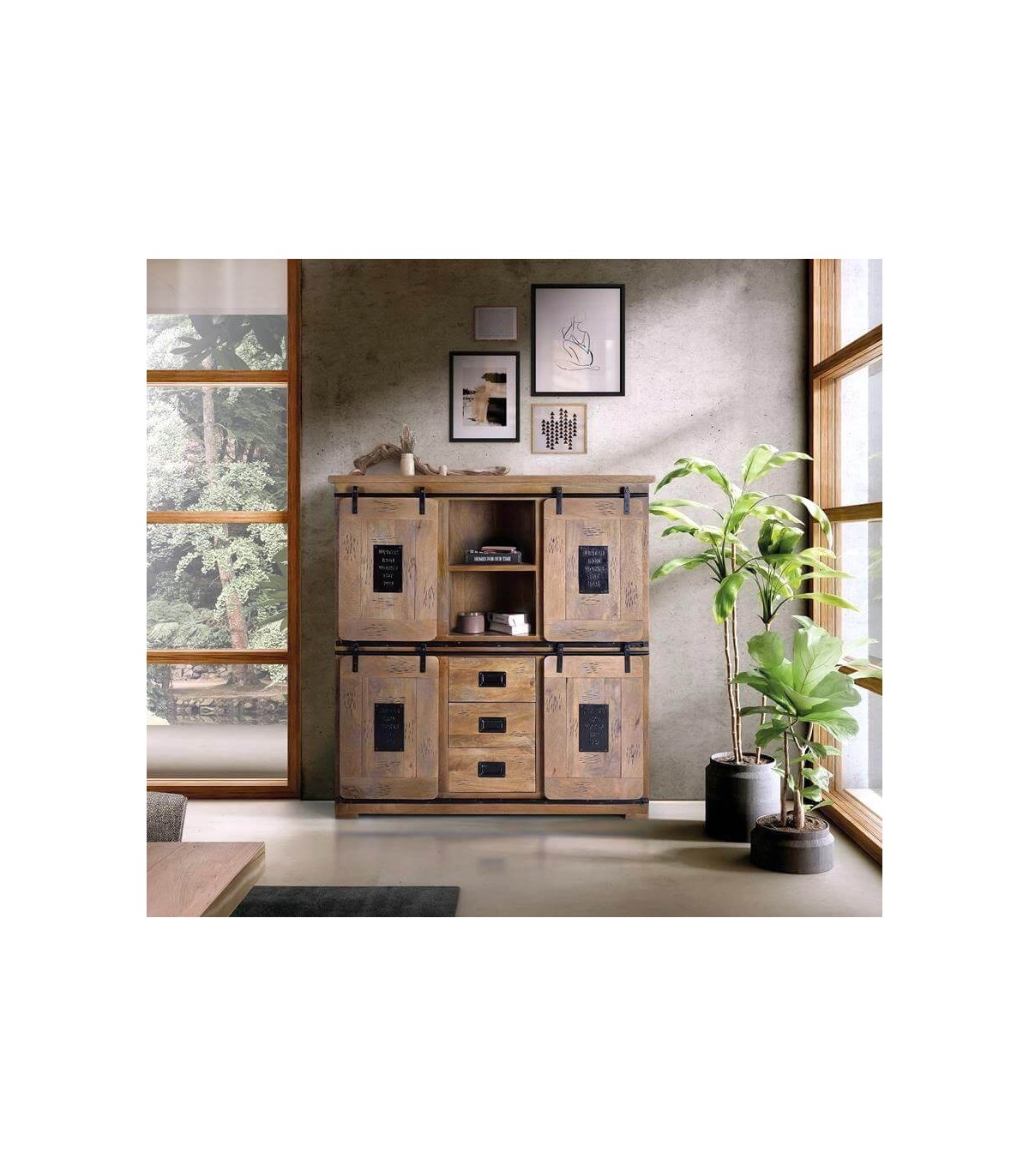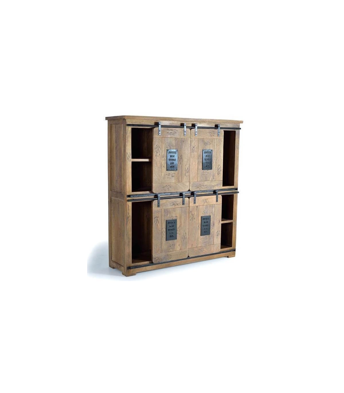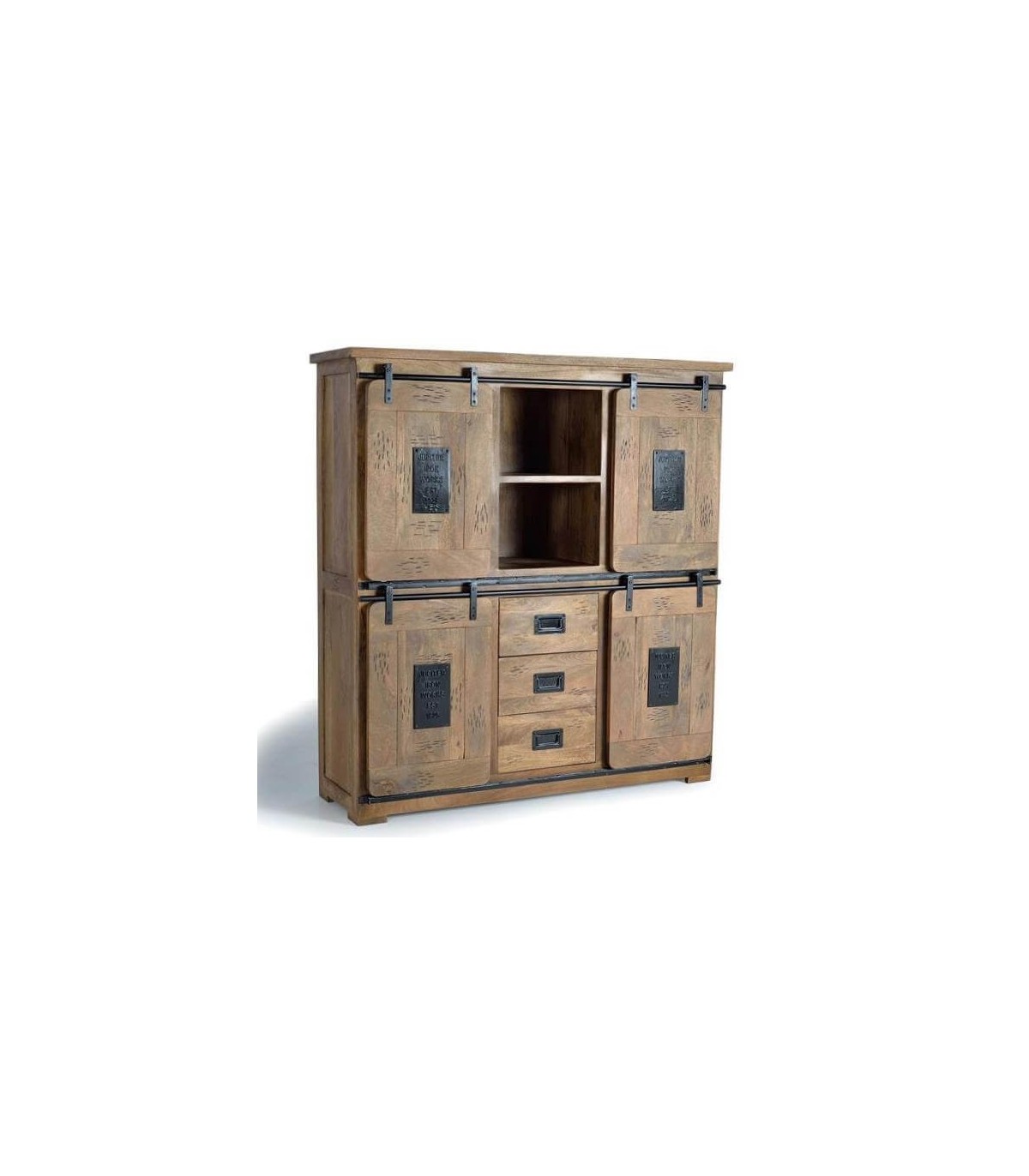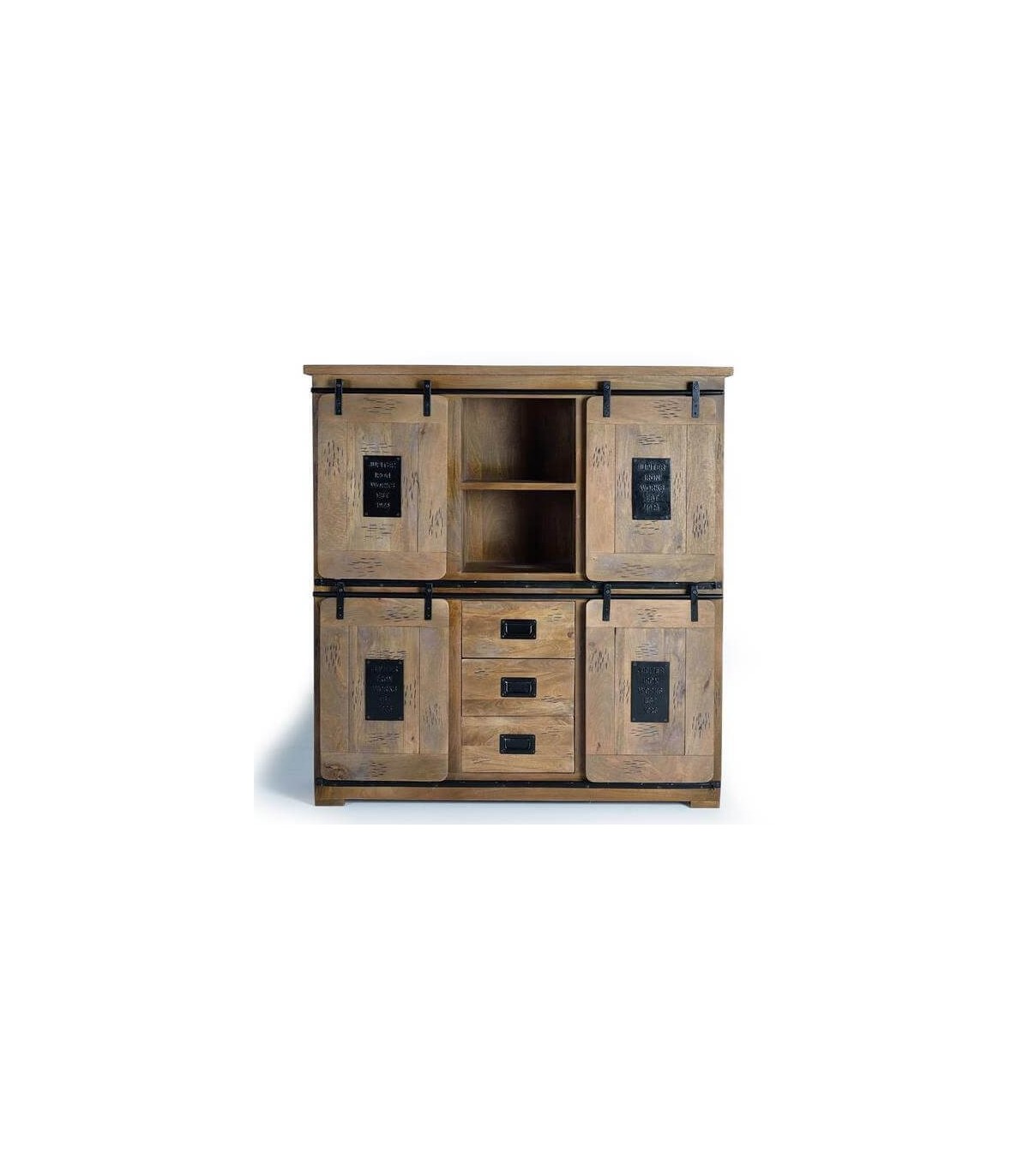 Armario alacena de nuestra colección de muebles Chicago, una colección puramente industrial, realizada en madera maciza de mango, jugando con los contrastes de la madera y el metal y con esa puerta corredera tan característica, que aparte de funcionalidad hace de la colección un mueble indispensable para los amantes del estilo industrial.