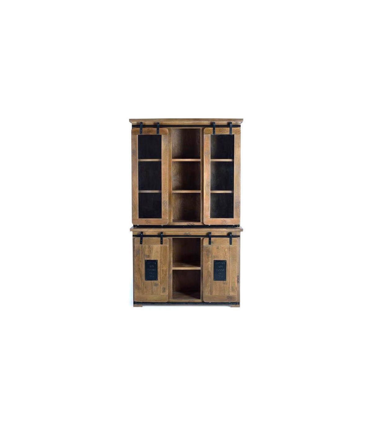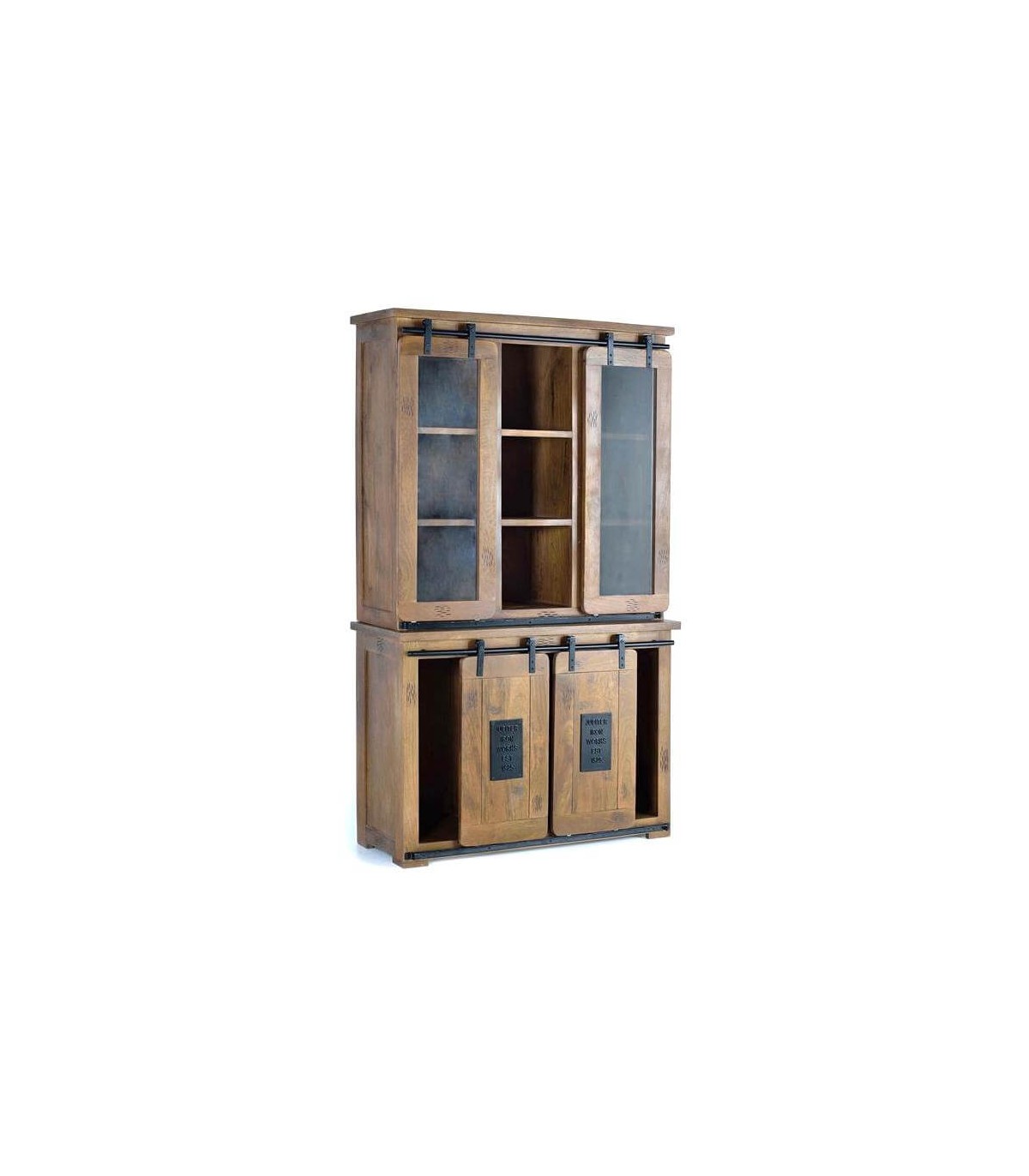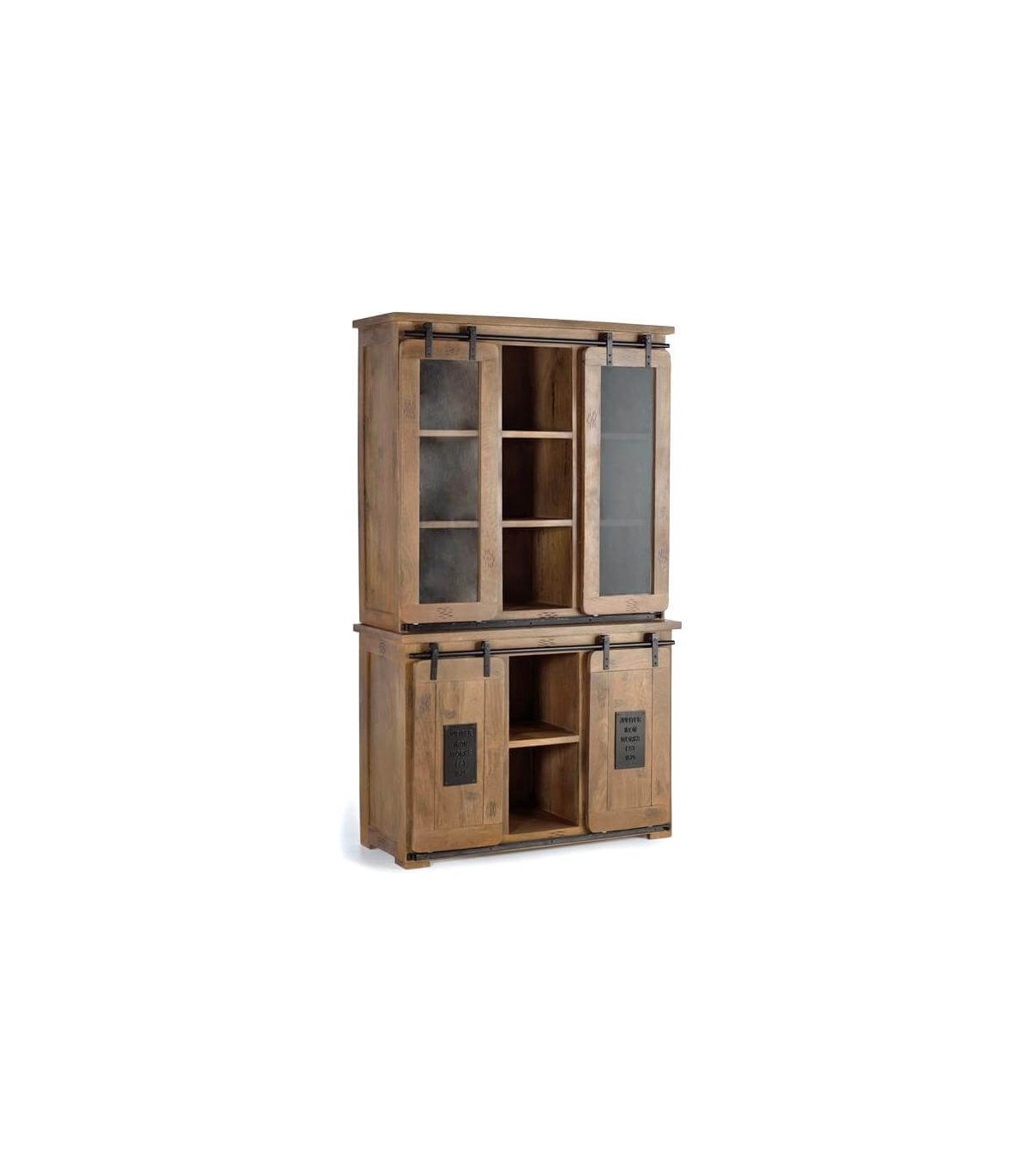 Vitrina de nuestra colección de muebles Chicago, una colección puramente industrial, realizada en madera maciza de mango, jugando con los contrastes de la madera y el metal y con esa puerta corredera tan característica, que aparte de funcionalidad hace de la colección un mueble indispensable para los amantes del estilo industrial.
