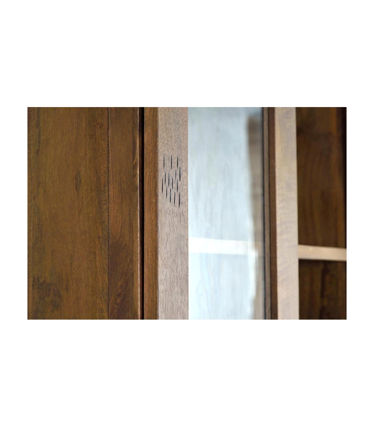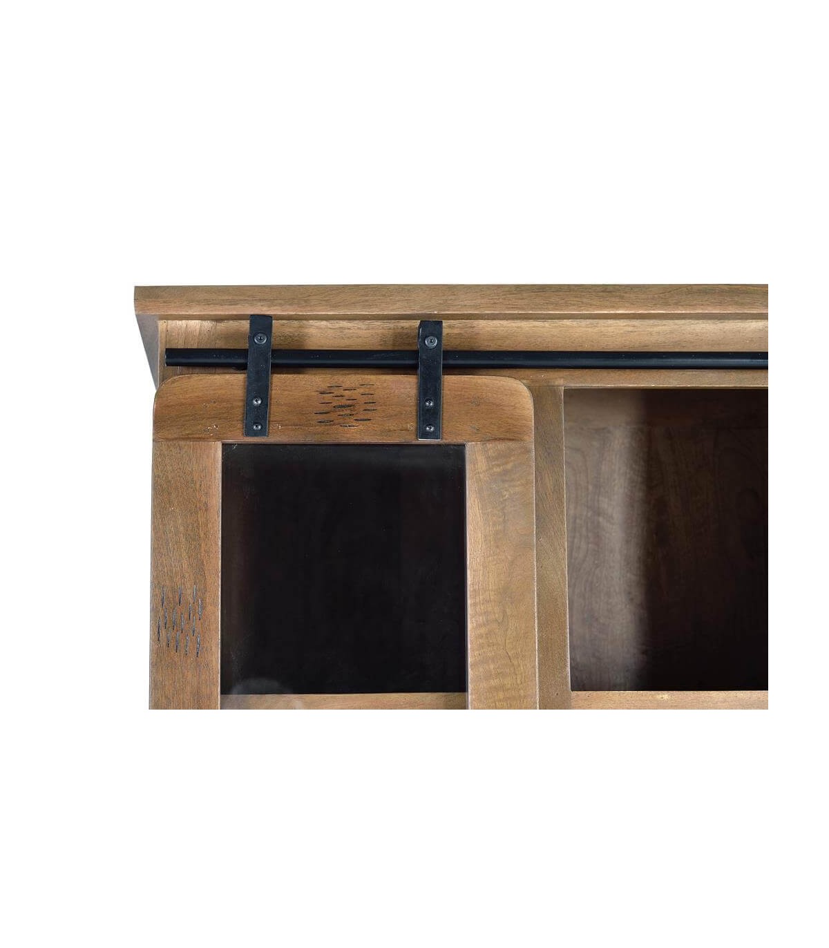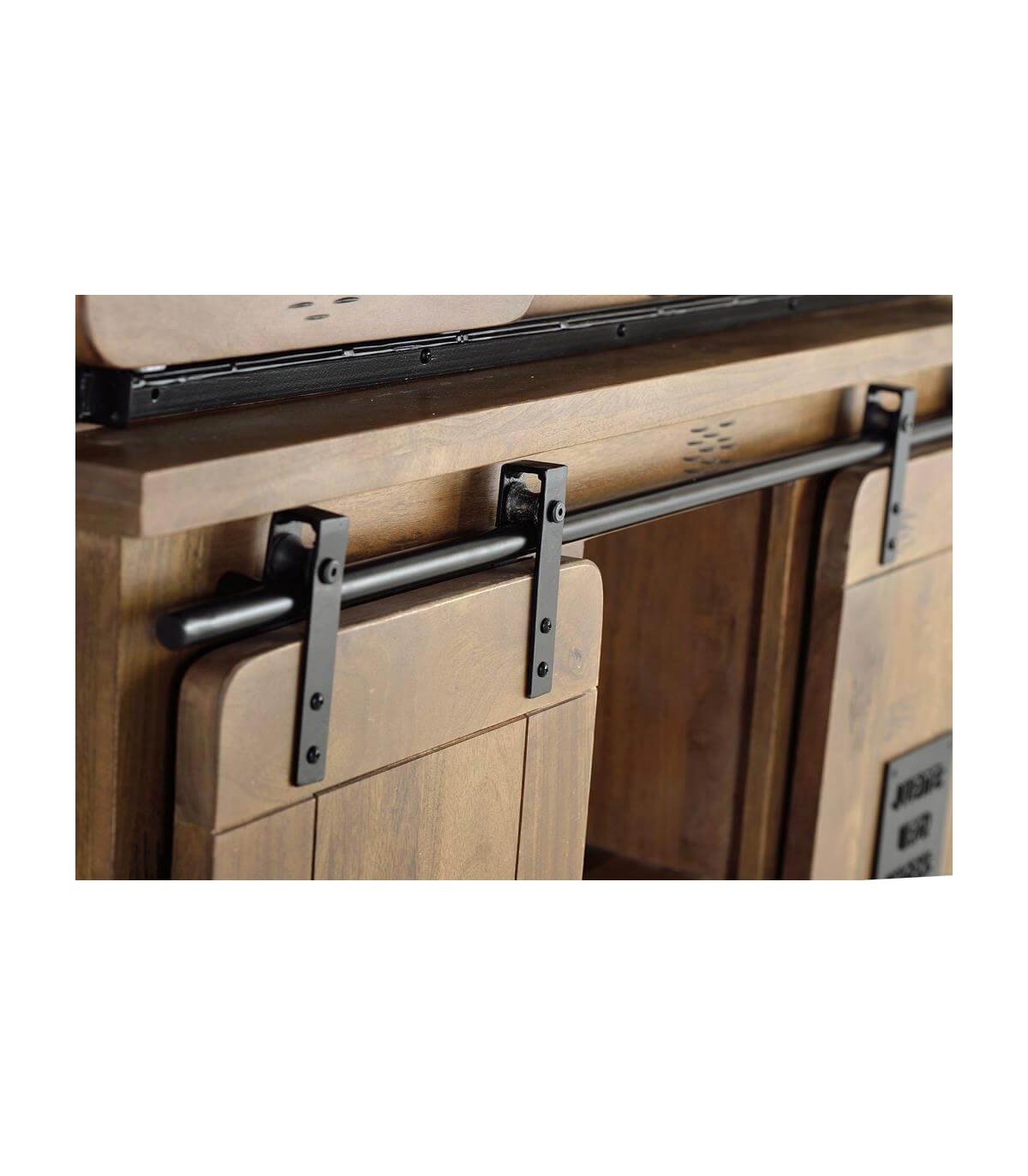 Vitrina de nuestra colección de muebles Chicago, una colección puramente industrial, realizada en madera maciza de mango, jugando con los contrastes de la madera y el metal y con esa puerta corredera tan característica, que aparte de funcionalidad hace de la colección un mueble indispensable para los amantes del estilo industrial.