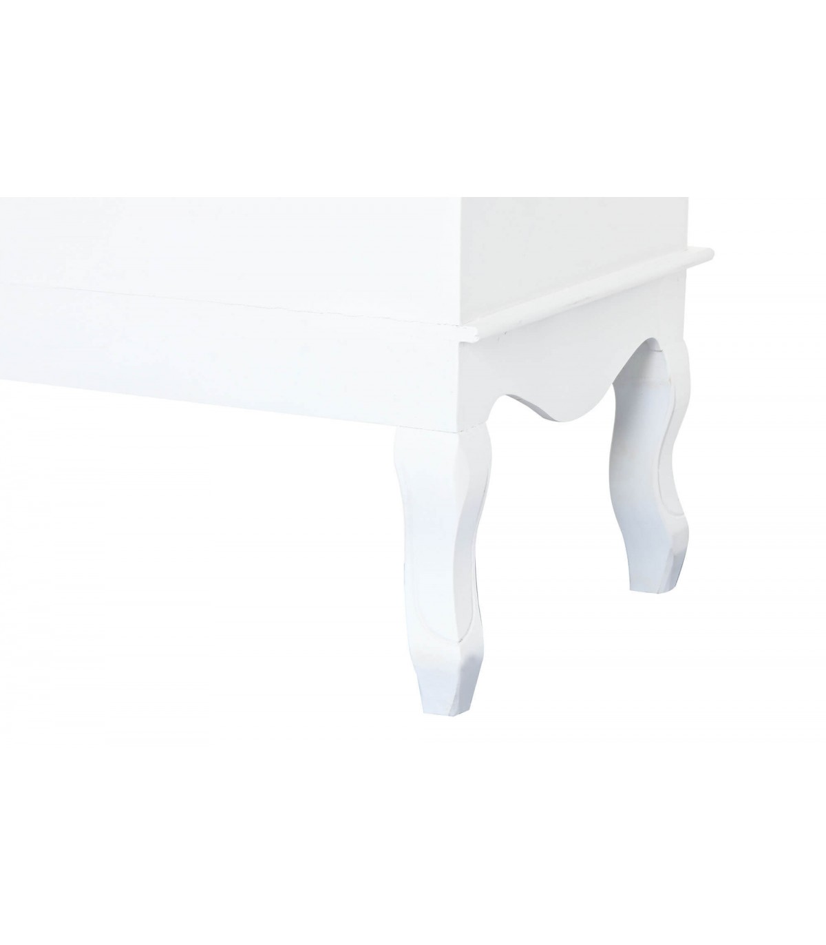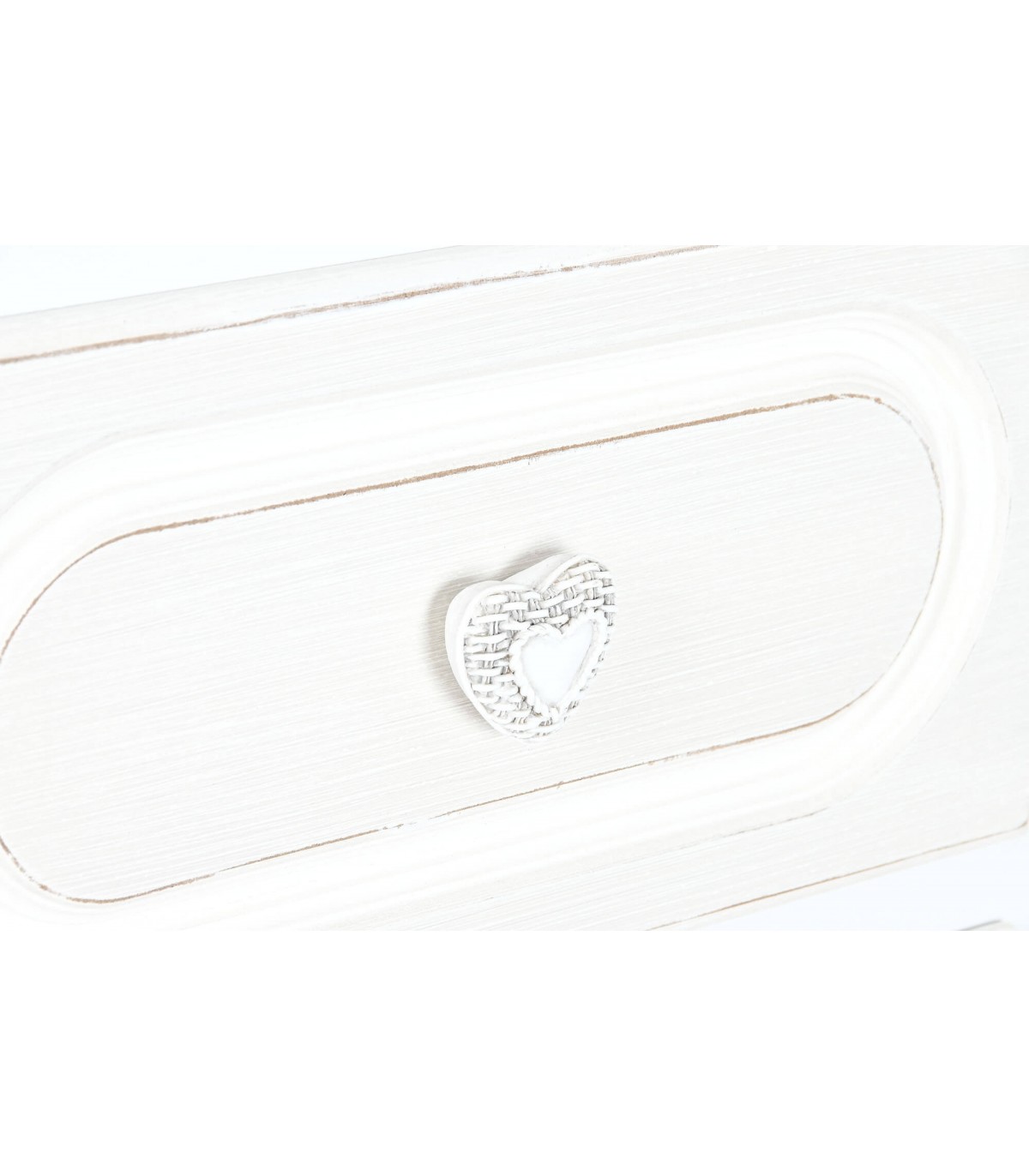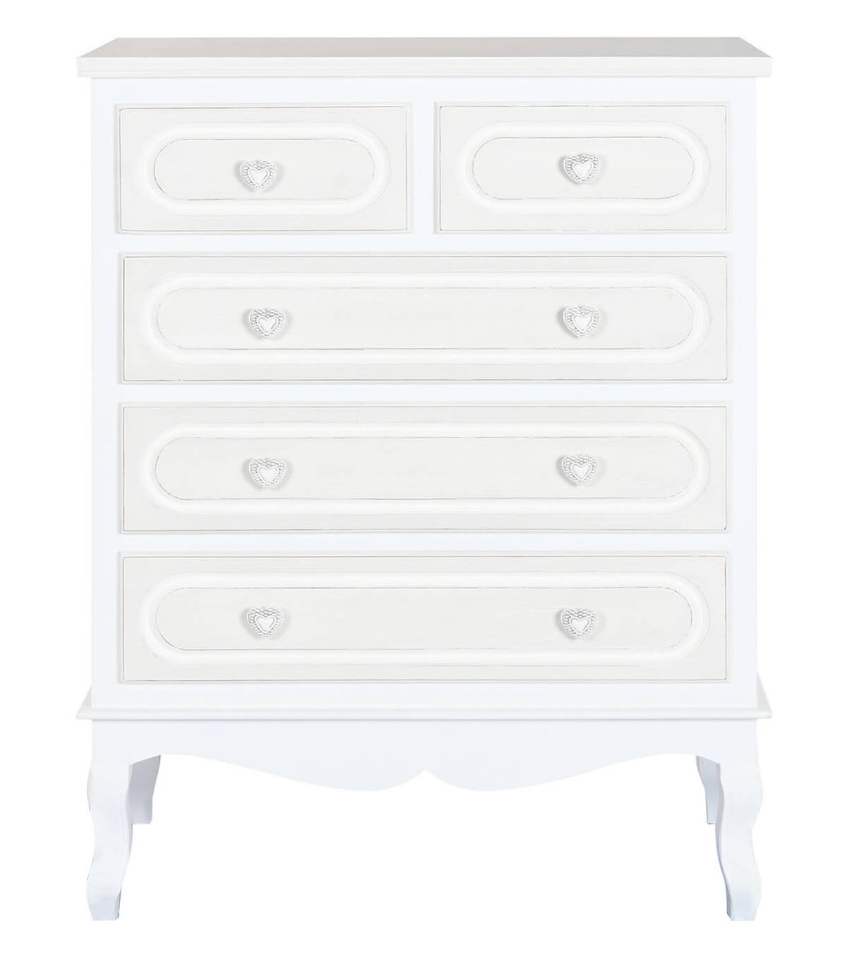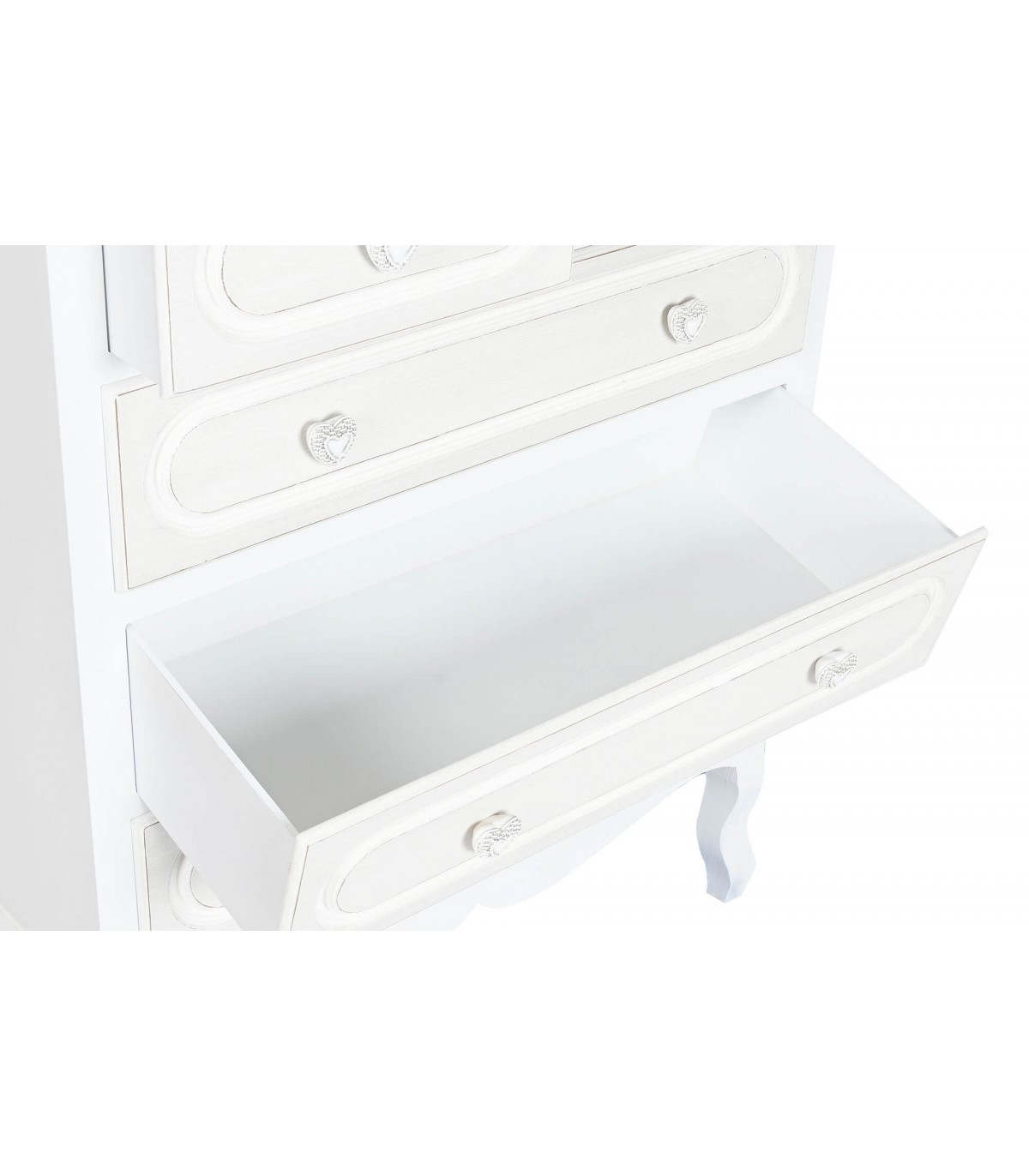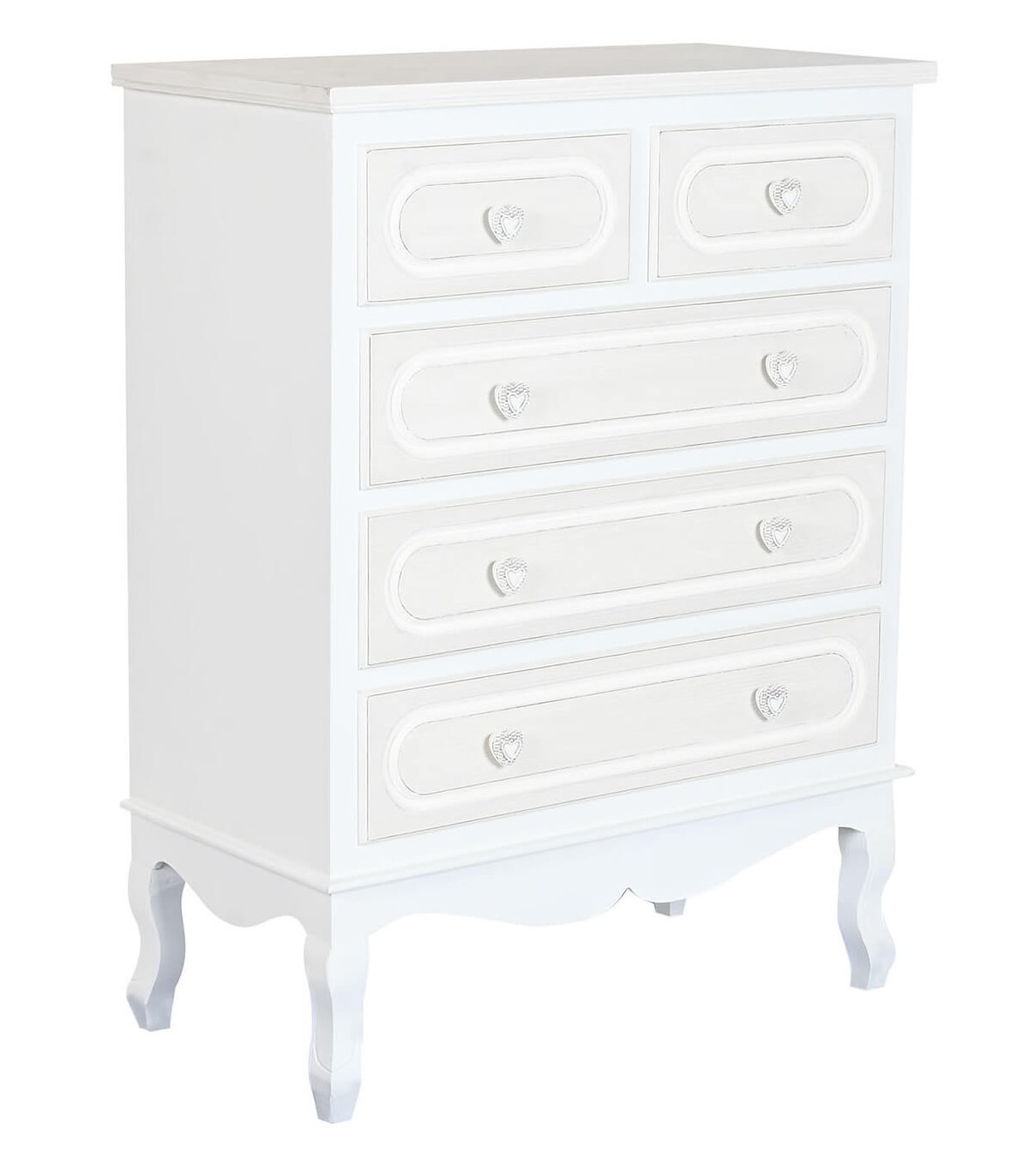 Dale un toque dulce y delicado a tu espacio con esta encantadora cómoda alta de estilo romántico. Con cinco cajones espaciosos y tiradores decorativos en forma de corazón, esta pieza combina funcionalidad y estética en un diseño ideal para dormitorios o habitaciones infantiles. Fabricada en MDF lacado en blanco con detalles en beige, destaca por su silueta clásica con patas curvadas y molduras suaves que evocan un aire femenino y atemporal.