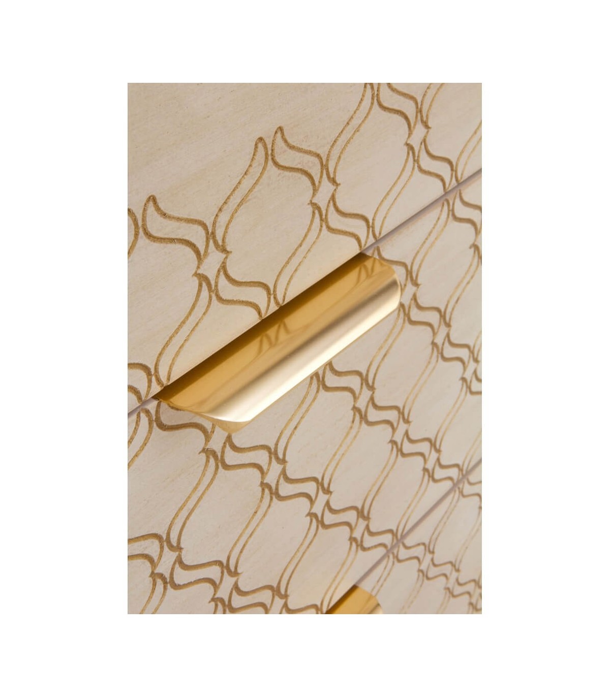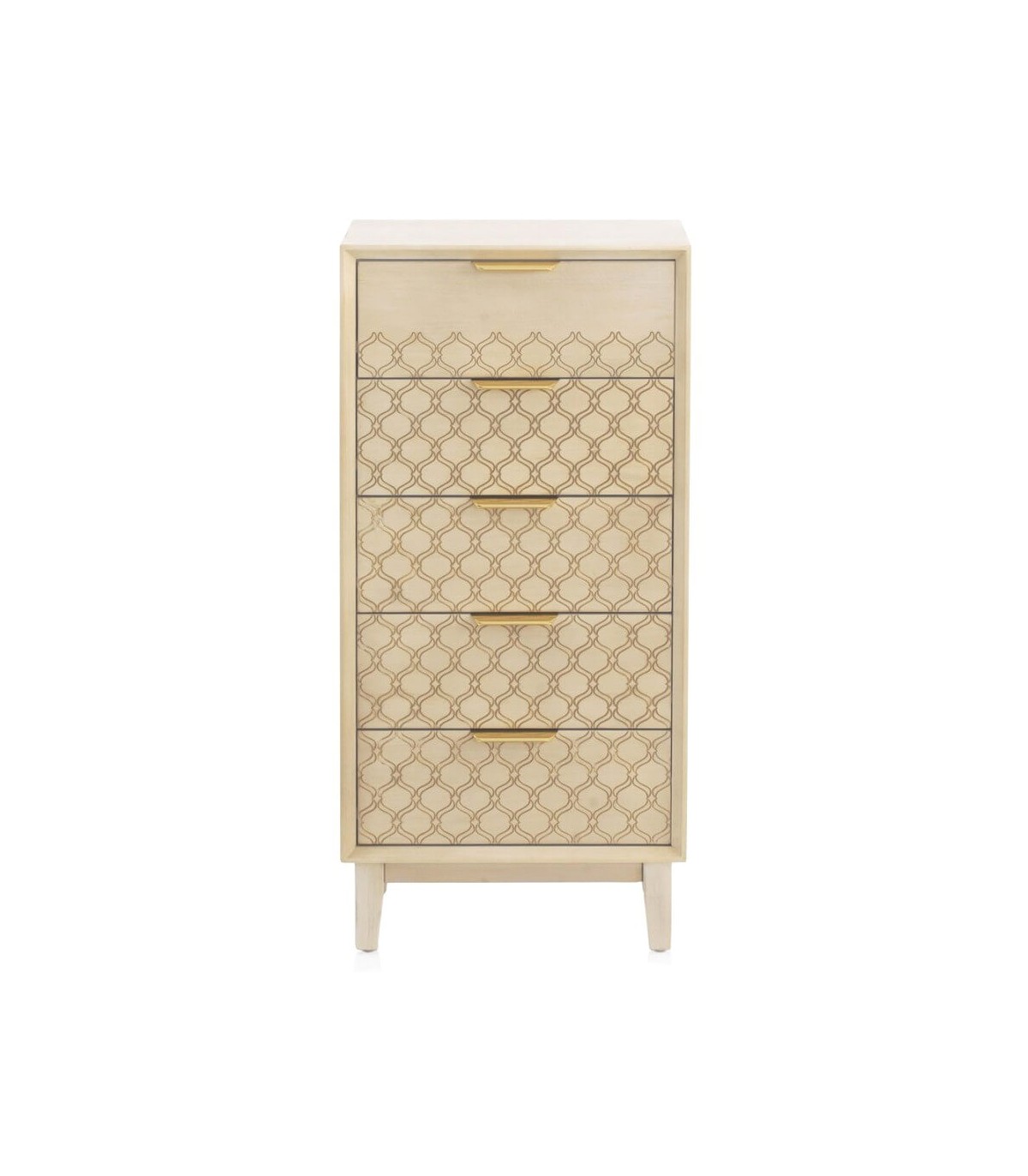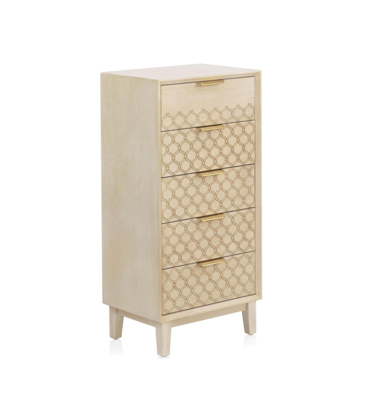 Sinfonier de 5 cajones de nuestra colección Bastian, una colección que se caracteriza por la chapa de roble natural color marfil, con los frentes labrados y los tiradores en metal dorado, una colección de muebles de estilo nórdico con un punto chic, perfecta par tu dormitorio o tu salón.