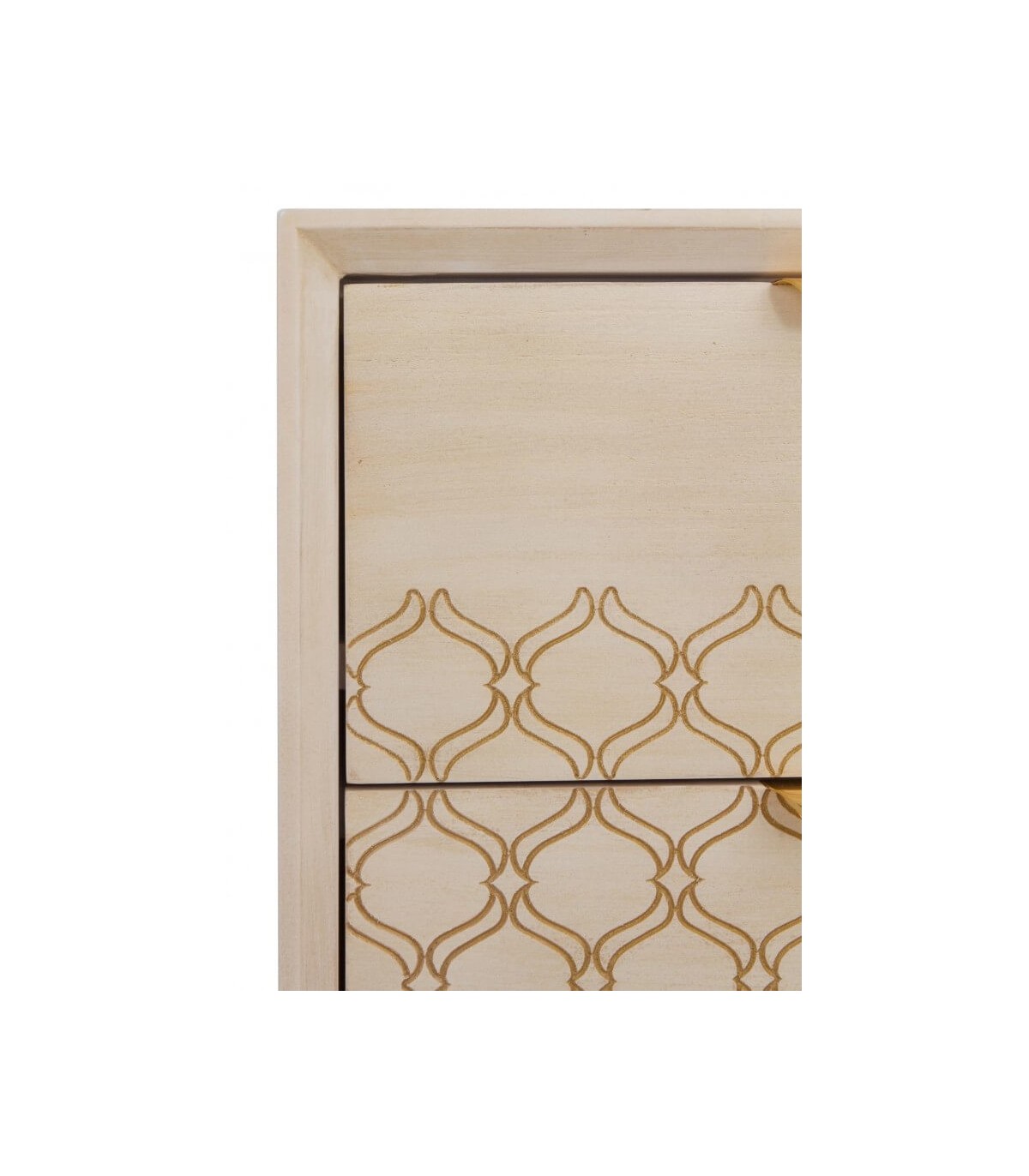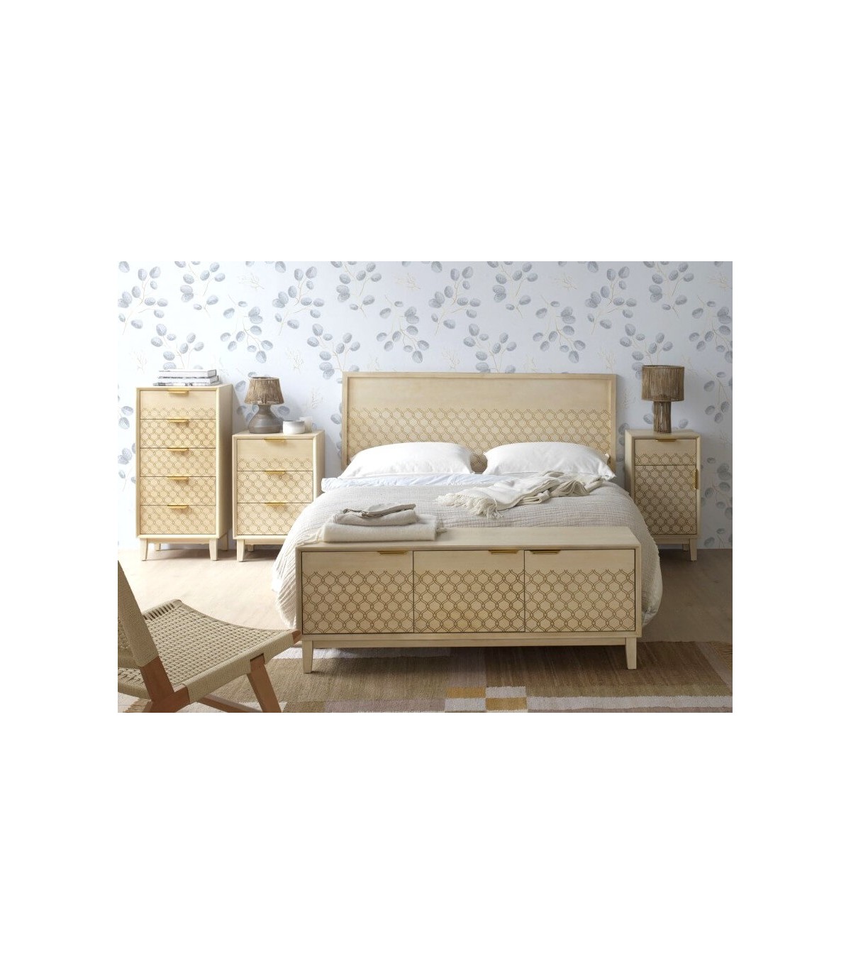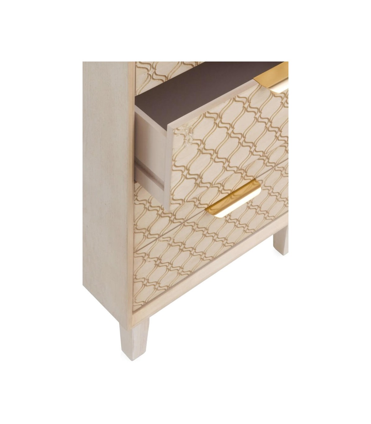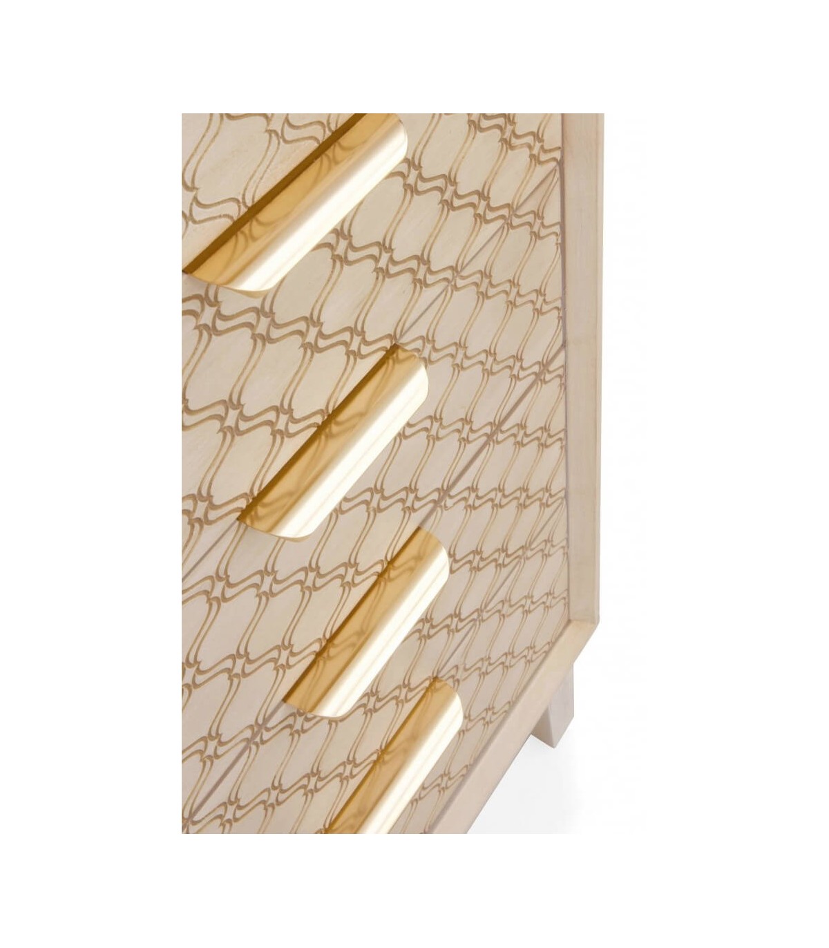 Sinfonier de 5 cajones de nuestra colección Bastian, una colección que se caracteriza por la chapa de roble natural color marfil, con los frentes labrados y los tiradores en metal dorado, una colección de muebles de estilo nórdico con un punto chic, perfecta par tu dormitorio o tu salón.