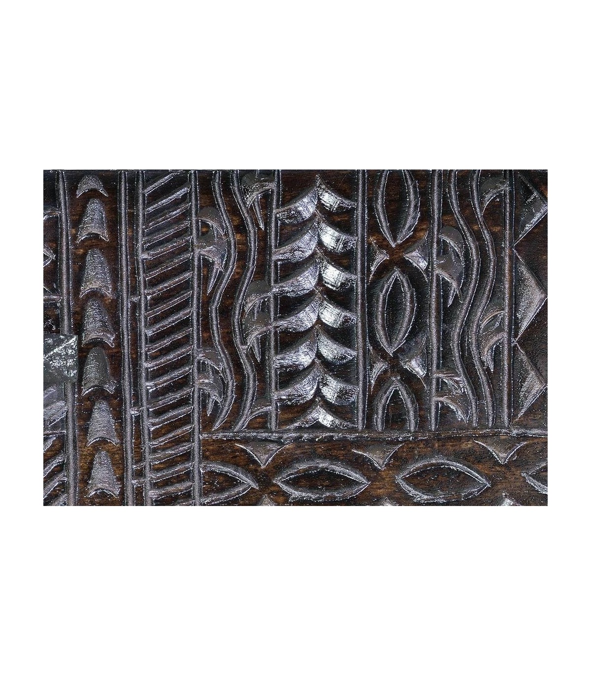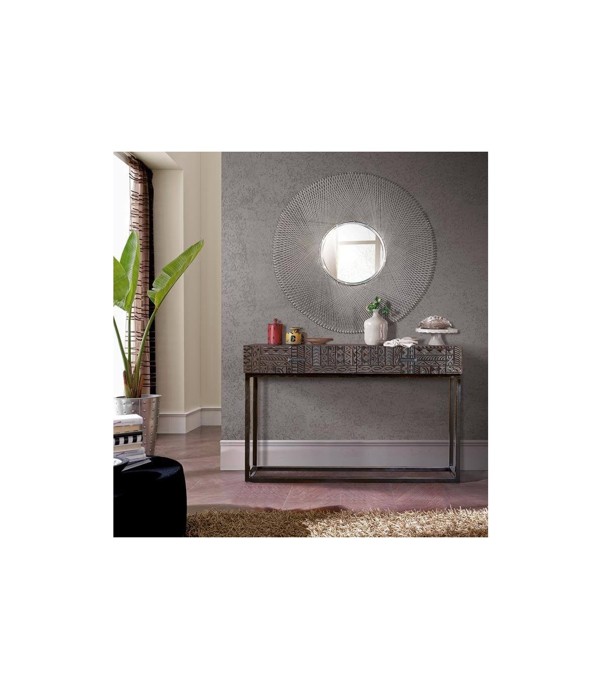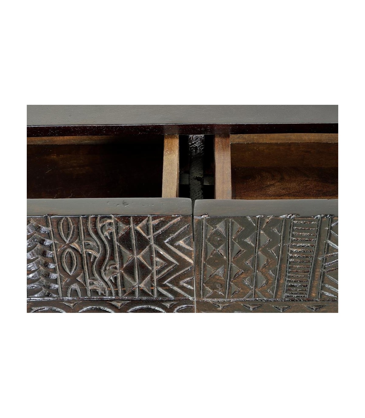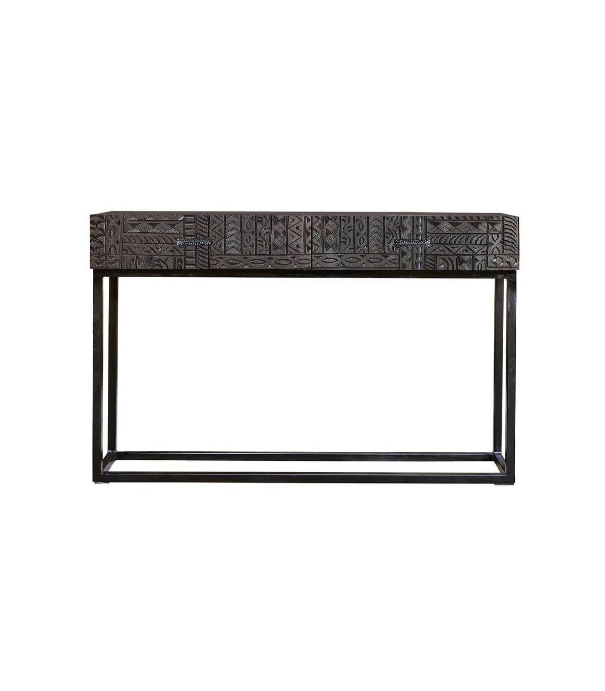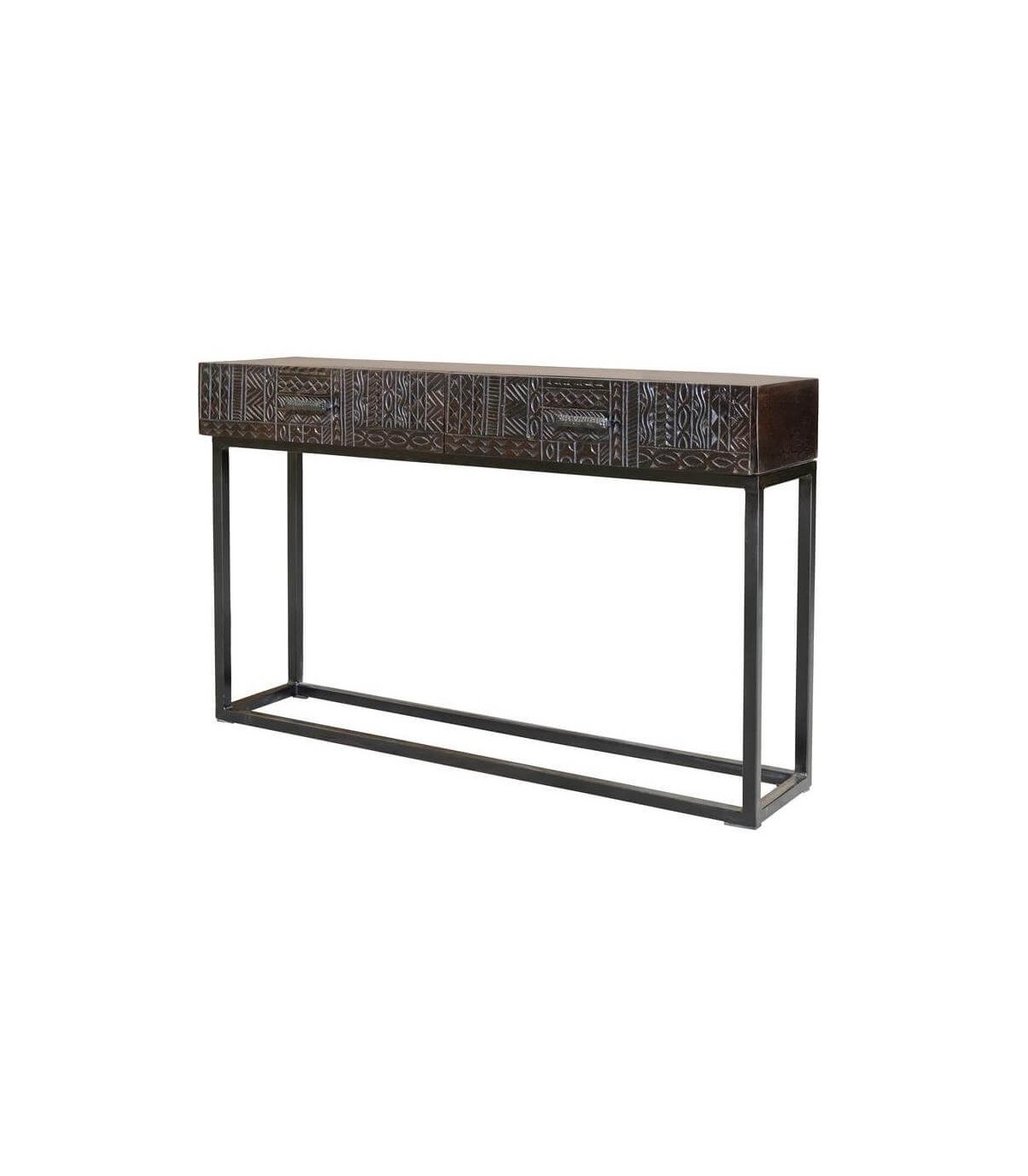 Consola de nuestra colección de muebles Azteca, una colección realizada en madera maciza de mango con las tallas hechas a mano artesanalmente y la base y los tiradores específicos para la colección en hierro forjado acabado negro, una colección muy racial y con carácter que le dará mucho sabor a tu decoración.