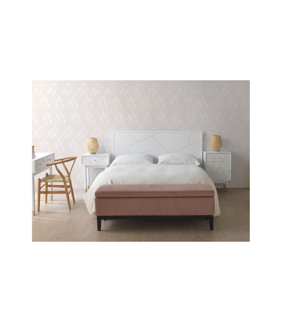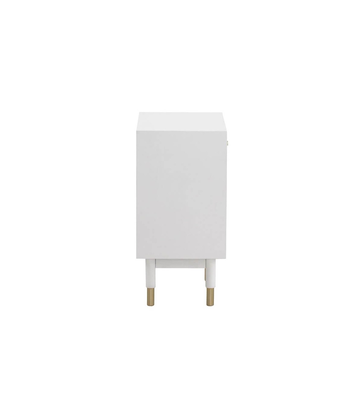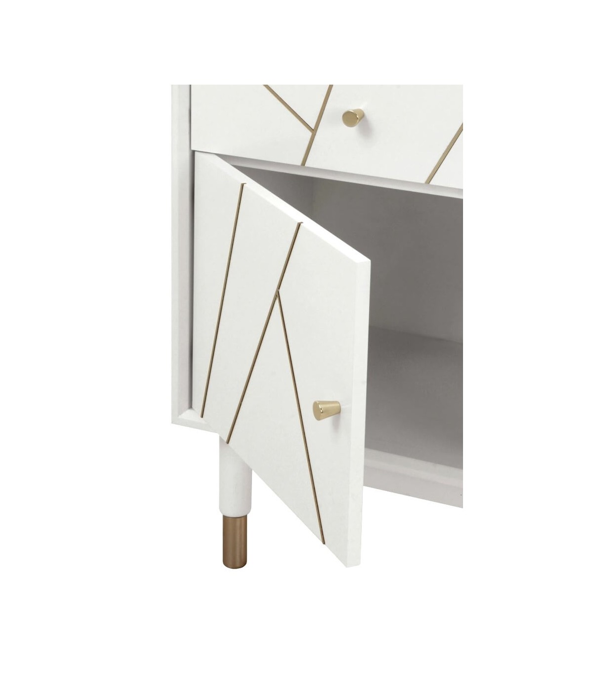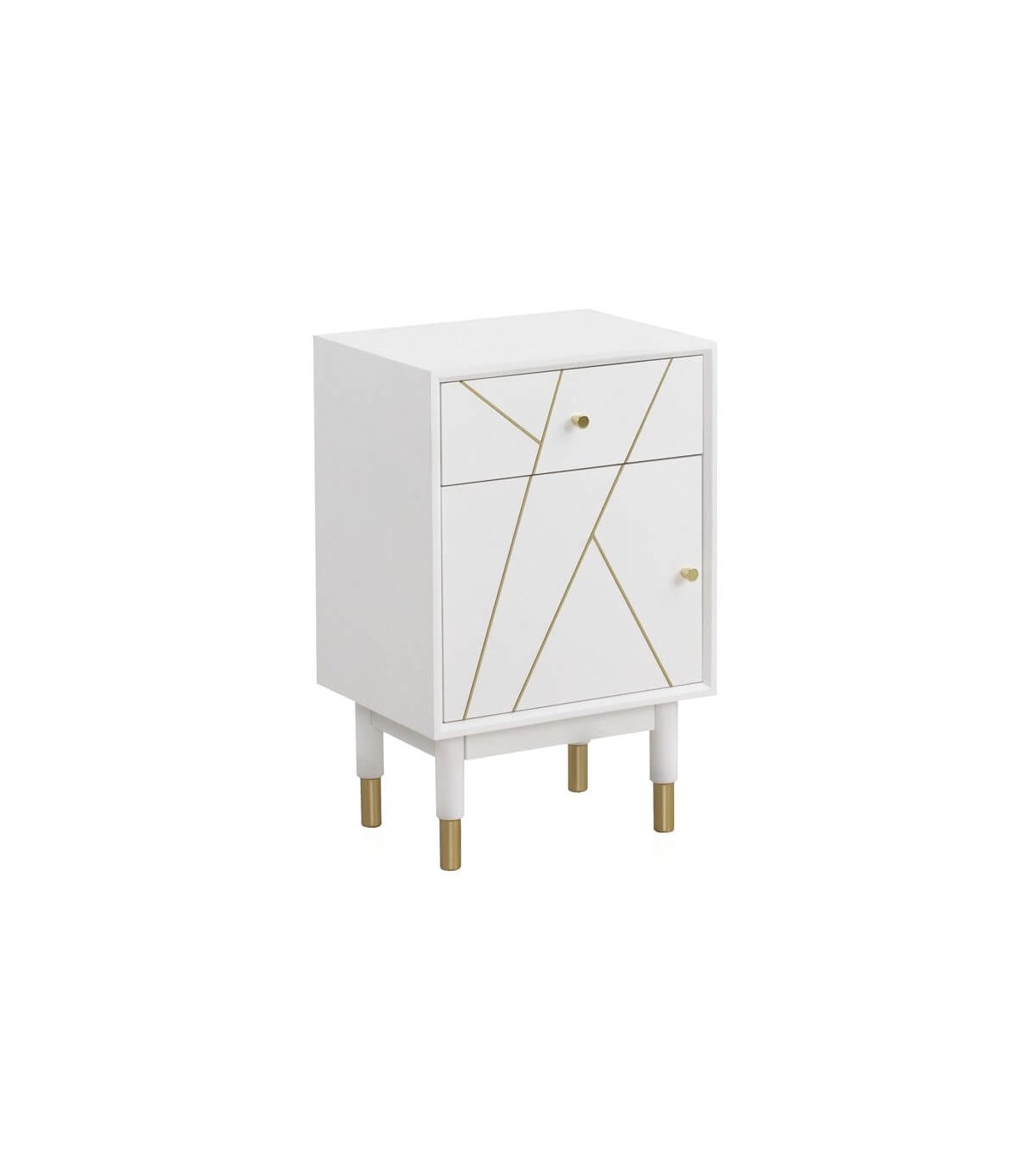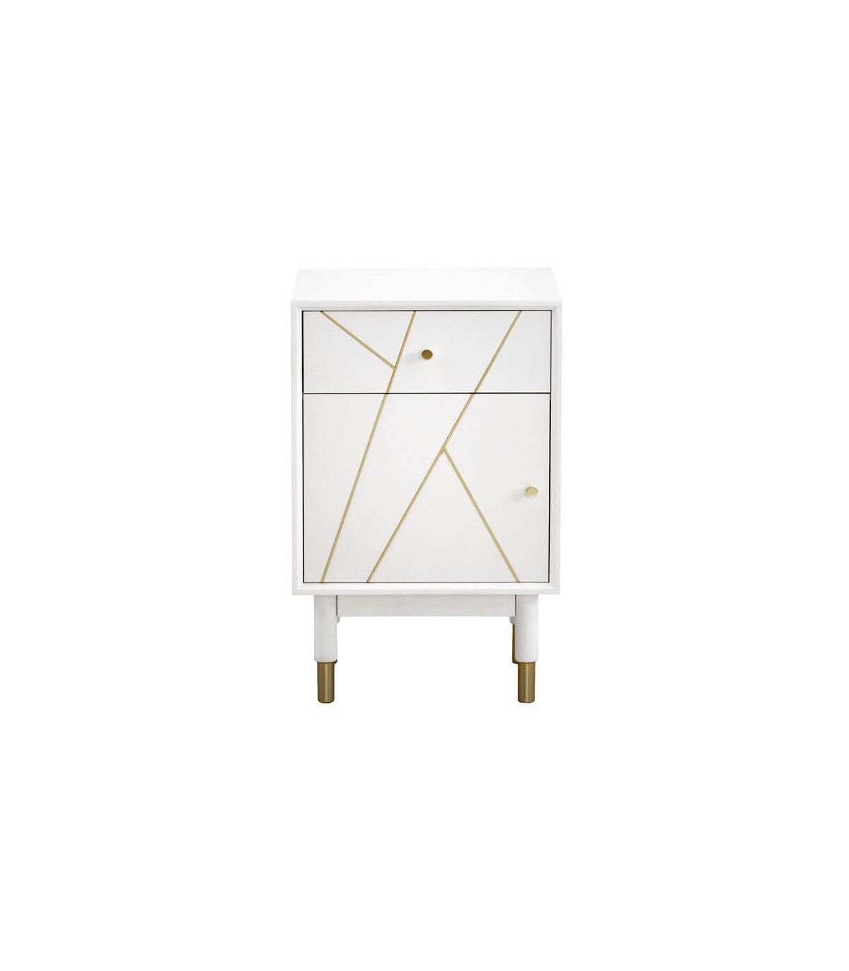 Mesita de noche con 1 cajón y 1 puerta de nuestra colección Clarky, una colección que se caracteriza por su luminosidad, lacada en blanco mate con incrustaciones metálicas acabado oro, una colección de muebles de estilo art decó con un punto chic, perfecta para tu dormitorio o tu salón.
