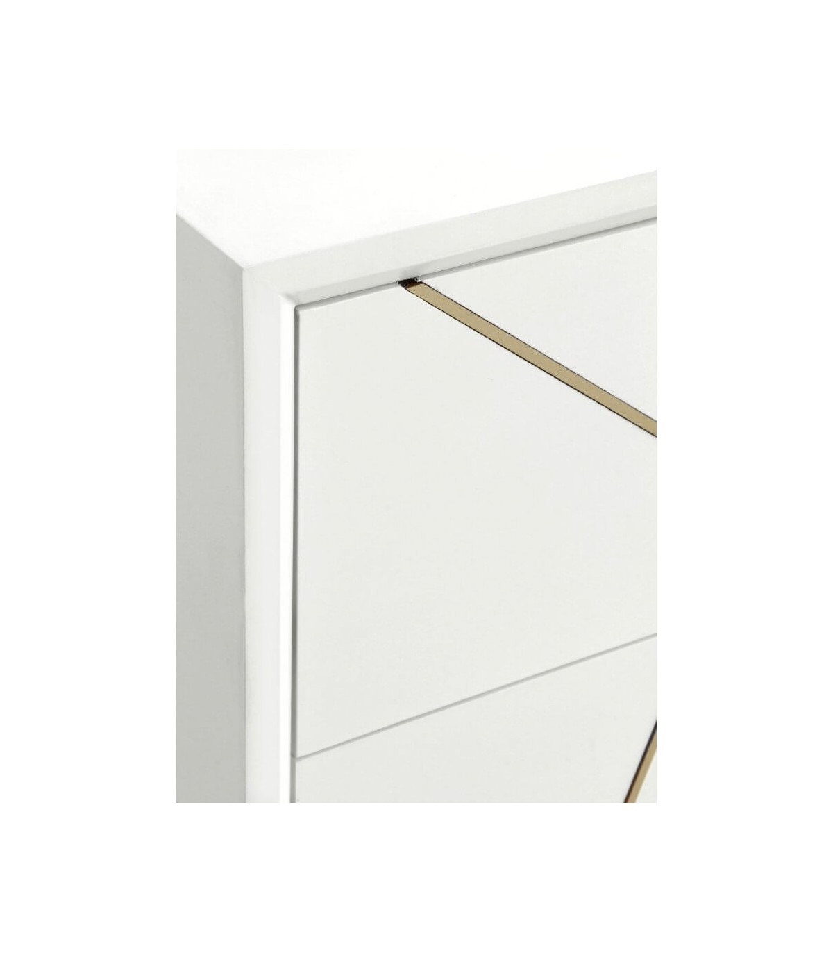 Acabado, madera lacada en blanco mate, tiradores e incrustaciones metálicas acabado dorado.