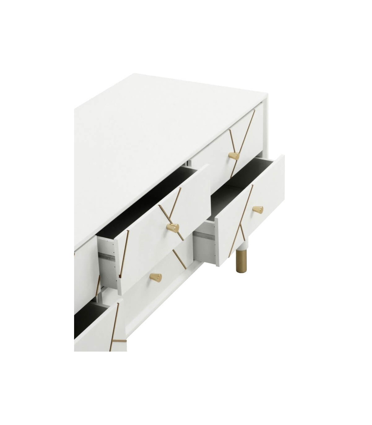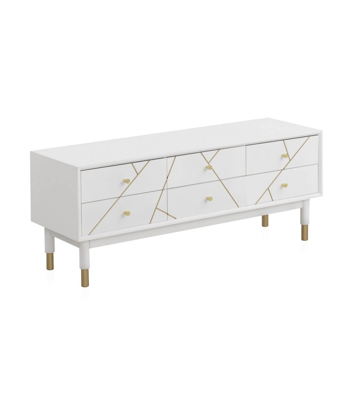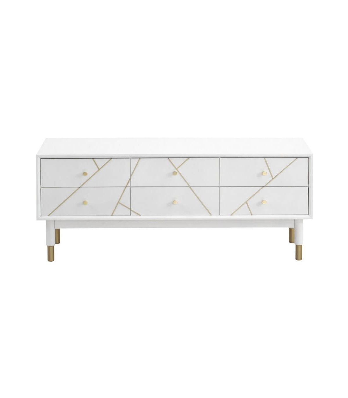 Mueble de TV 6 cajones de nuestra colección Clarky, una colección que se caracteriza por su luminosidad, lacada en blanco mate con incrustaciones metálicas acabado oro, una colección de muebles de estilo art decó con un punto chic, perfecta para tu dormitorio o tu salón.