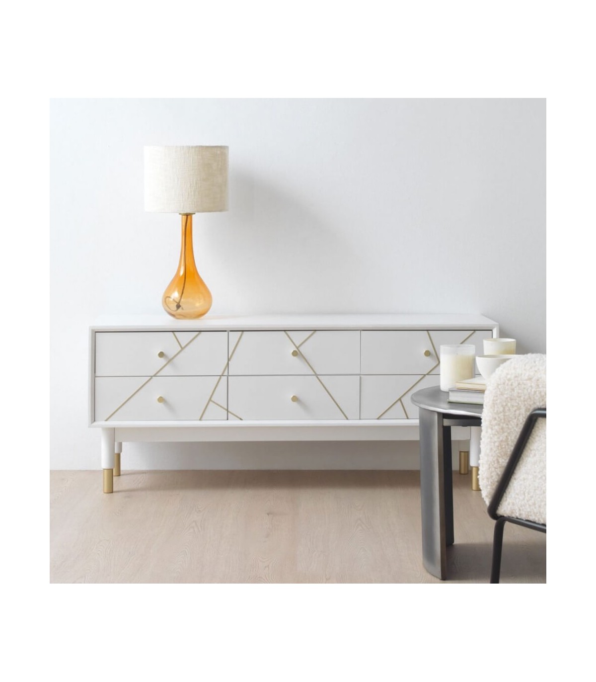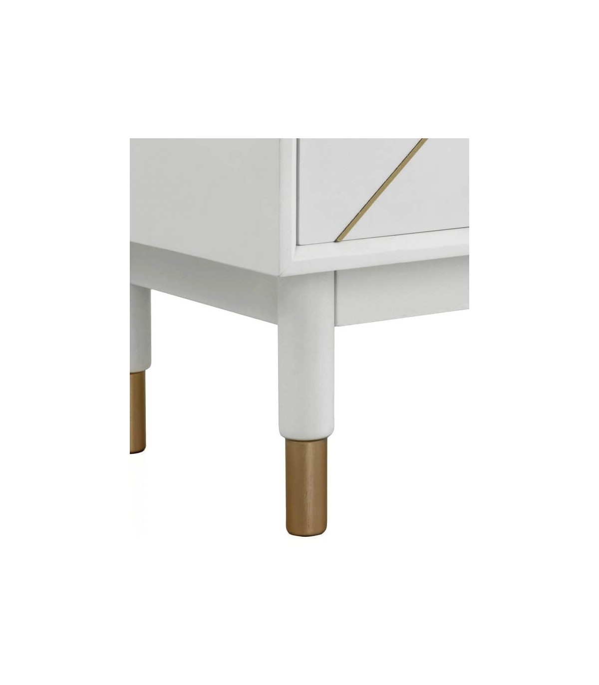 Acabado, madera lacada en blanco mate, tiradores e incrustaciones metálicas acabado dorado.