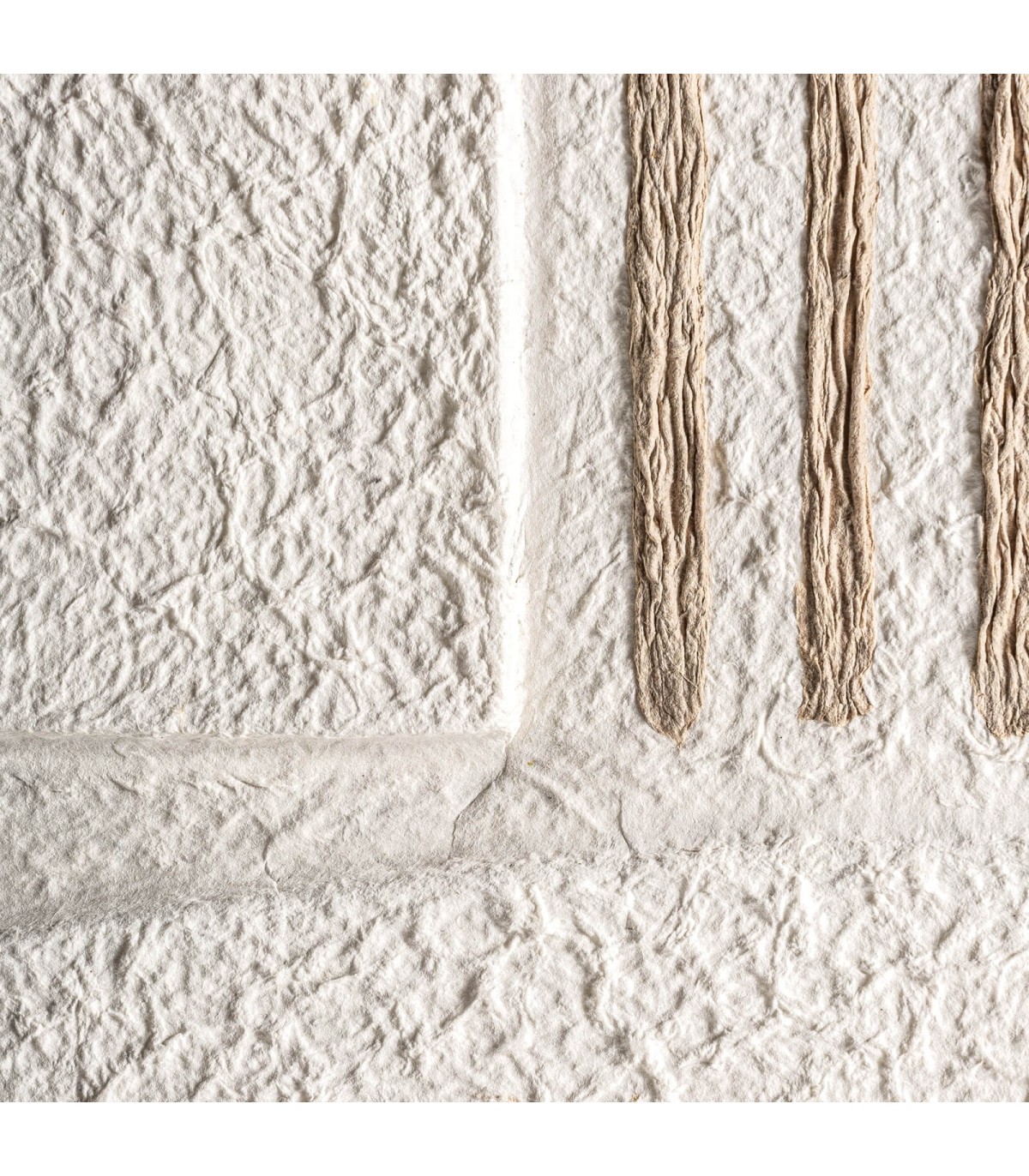 Acabado, artesanal, papel modelado, en color blanco y marrón, marco madera natural.