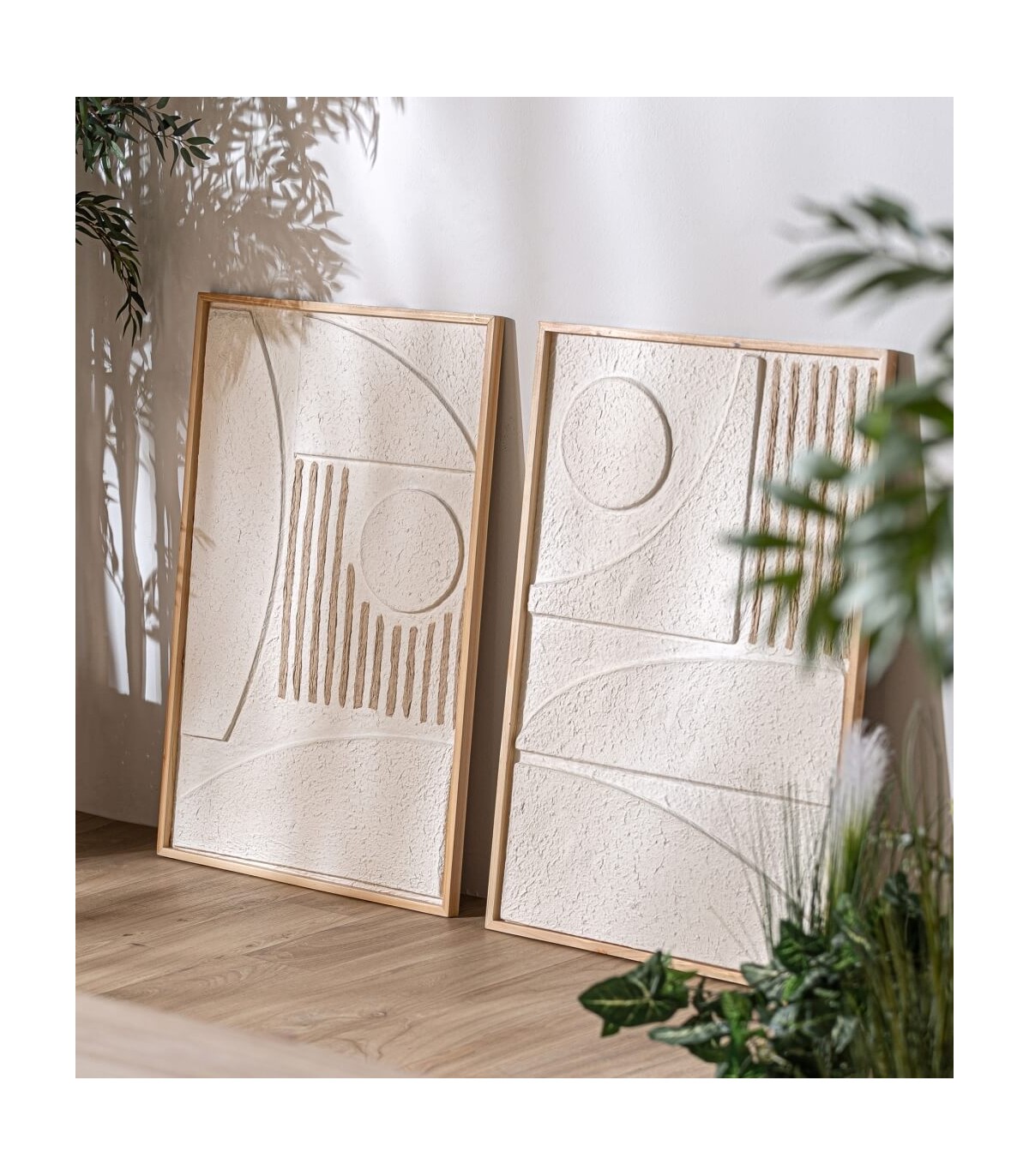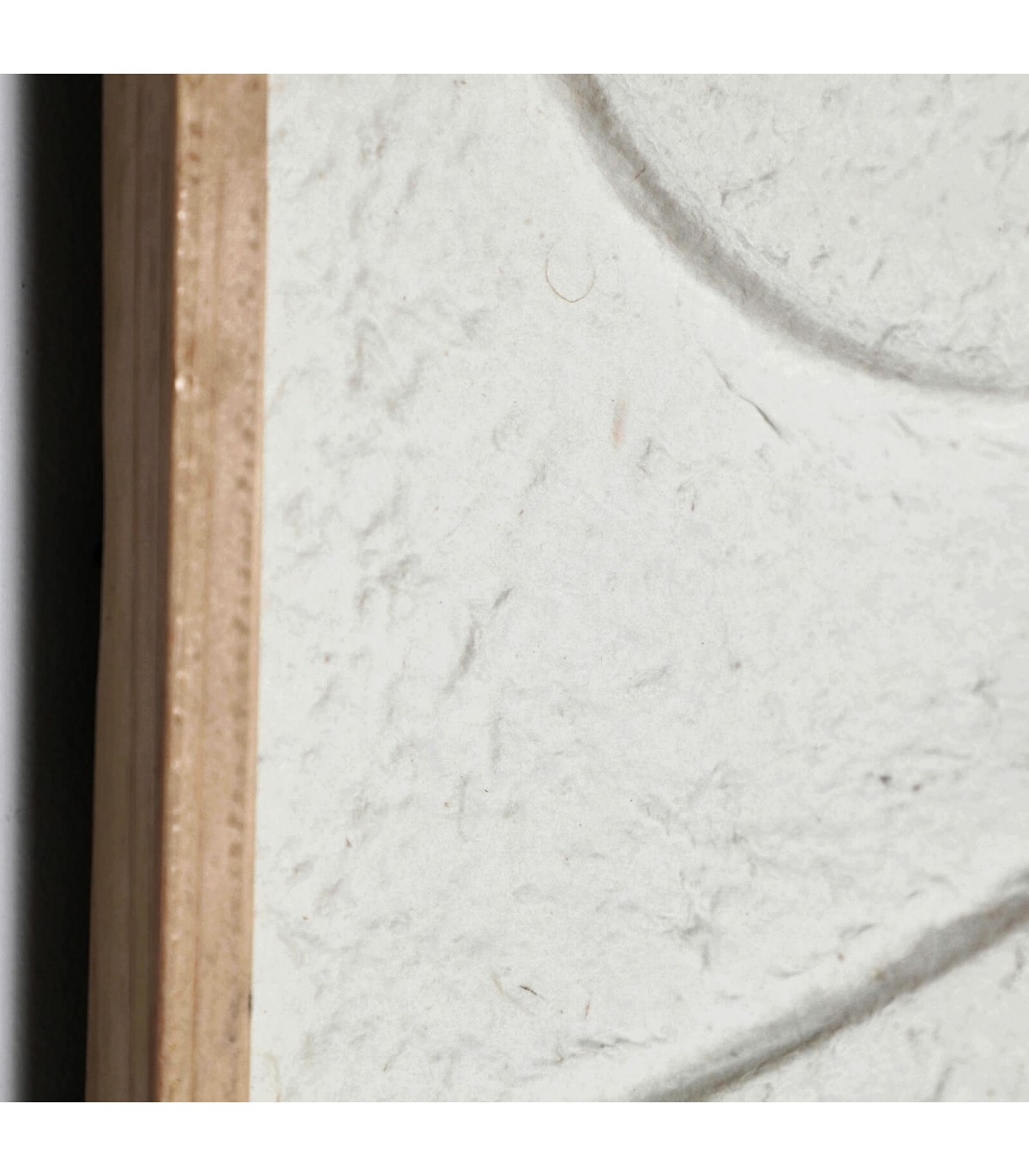 Cuadro de estilo abstracto realizado artesanalmente en papel, acabado en blanco y marrón con relieve, el marco es en madera de paulonia acabado natural, un cuadro que encaja perfectamente en decoraciones nórdicas.