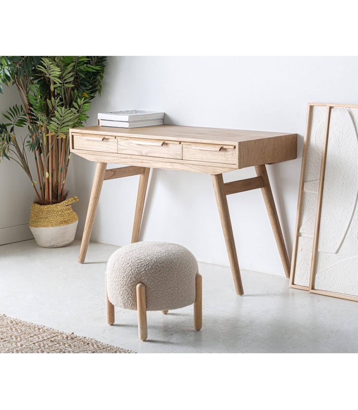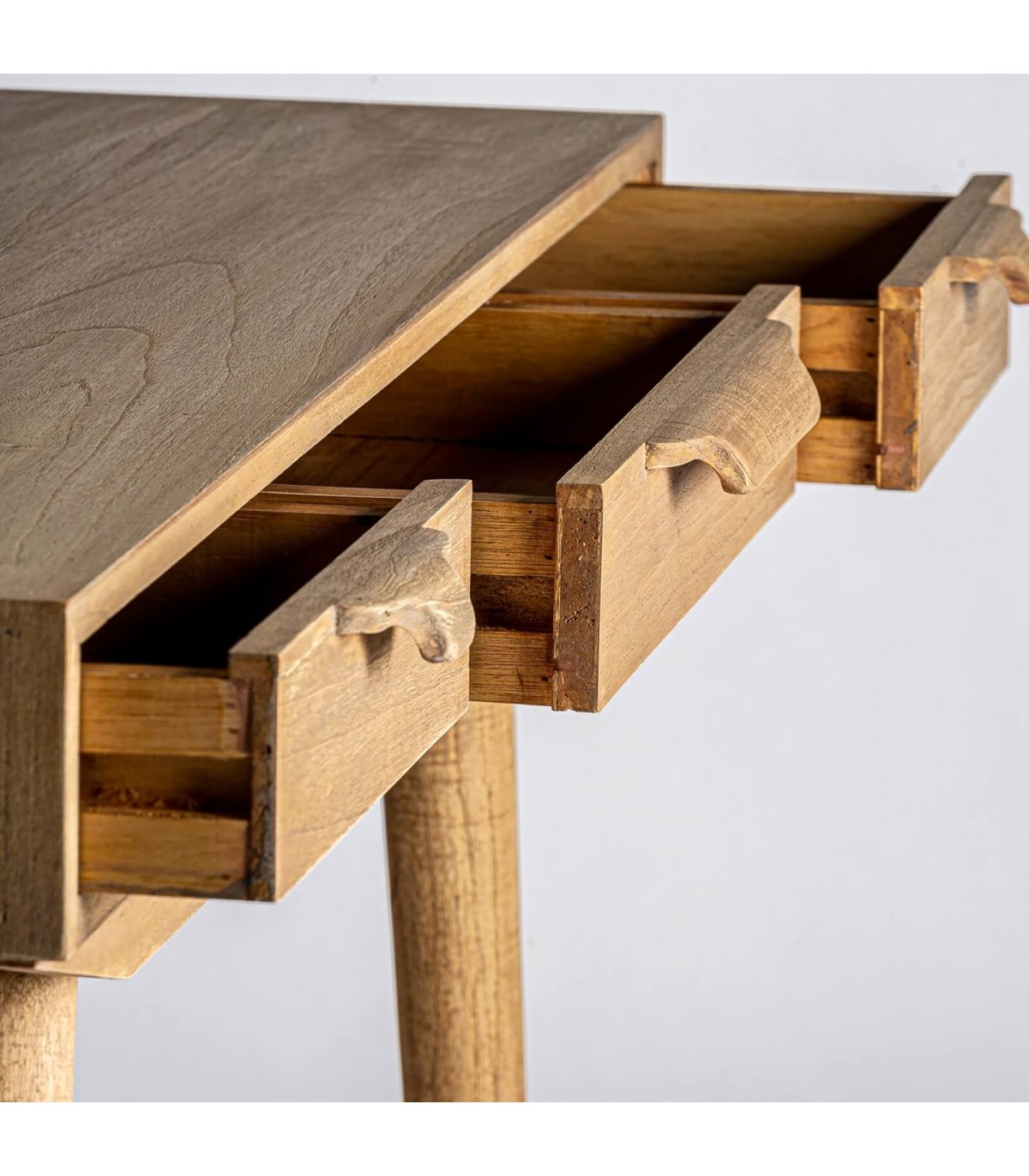 Escritorio de nuestra colección NYRY, una colección realizada en madera maciza de mindi, un muble de estilo nórdico de calidad, con la belleza y la naturalidad de la madera natural, una colección que cuenta muebles para tu salón dormitorio o zonas auxiliares.