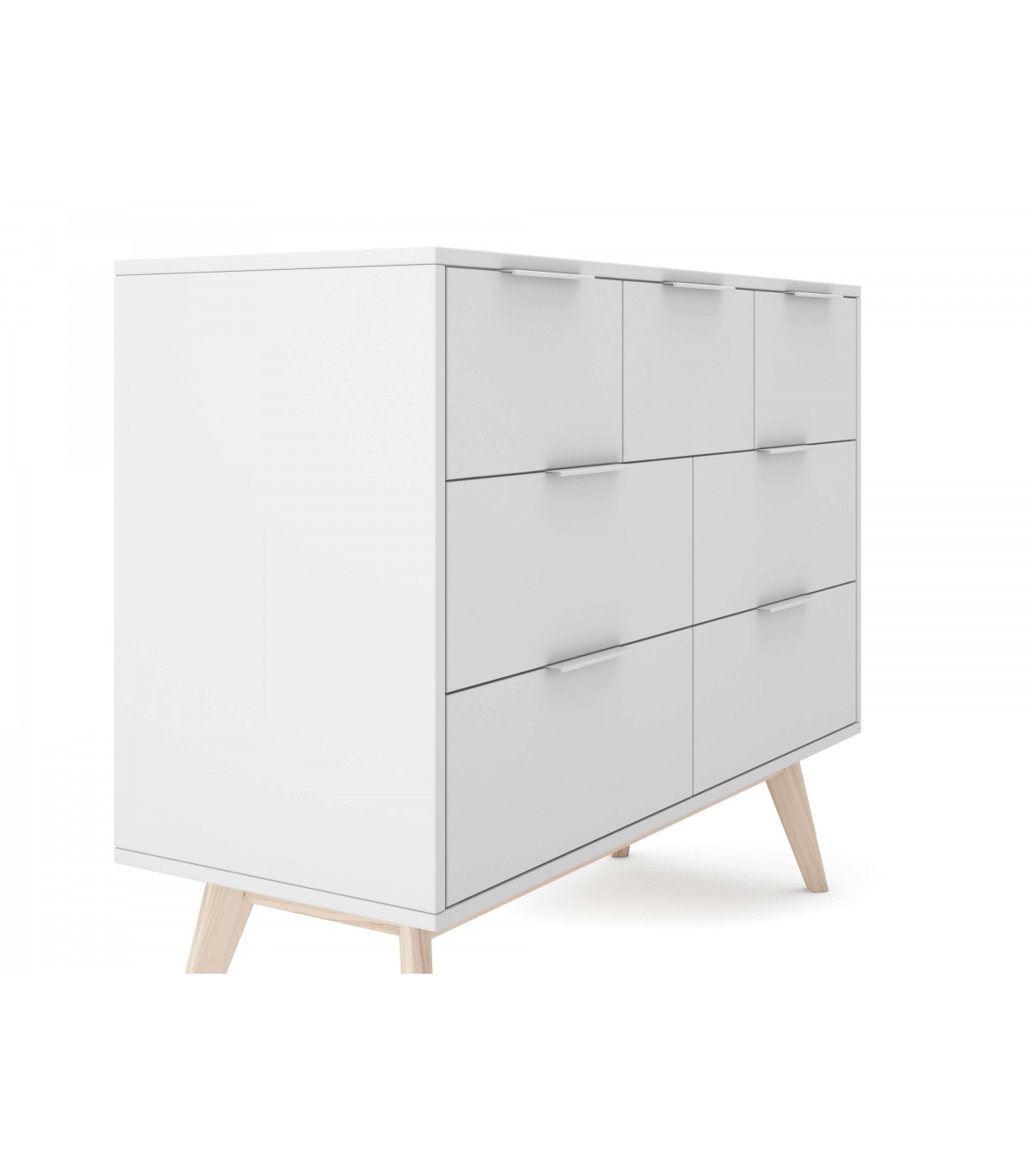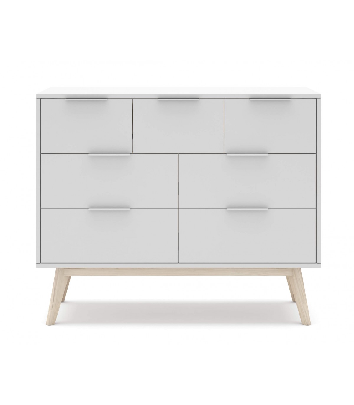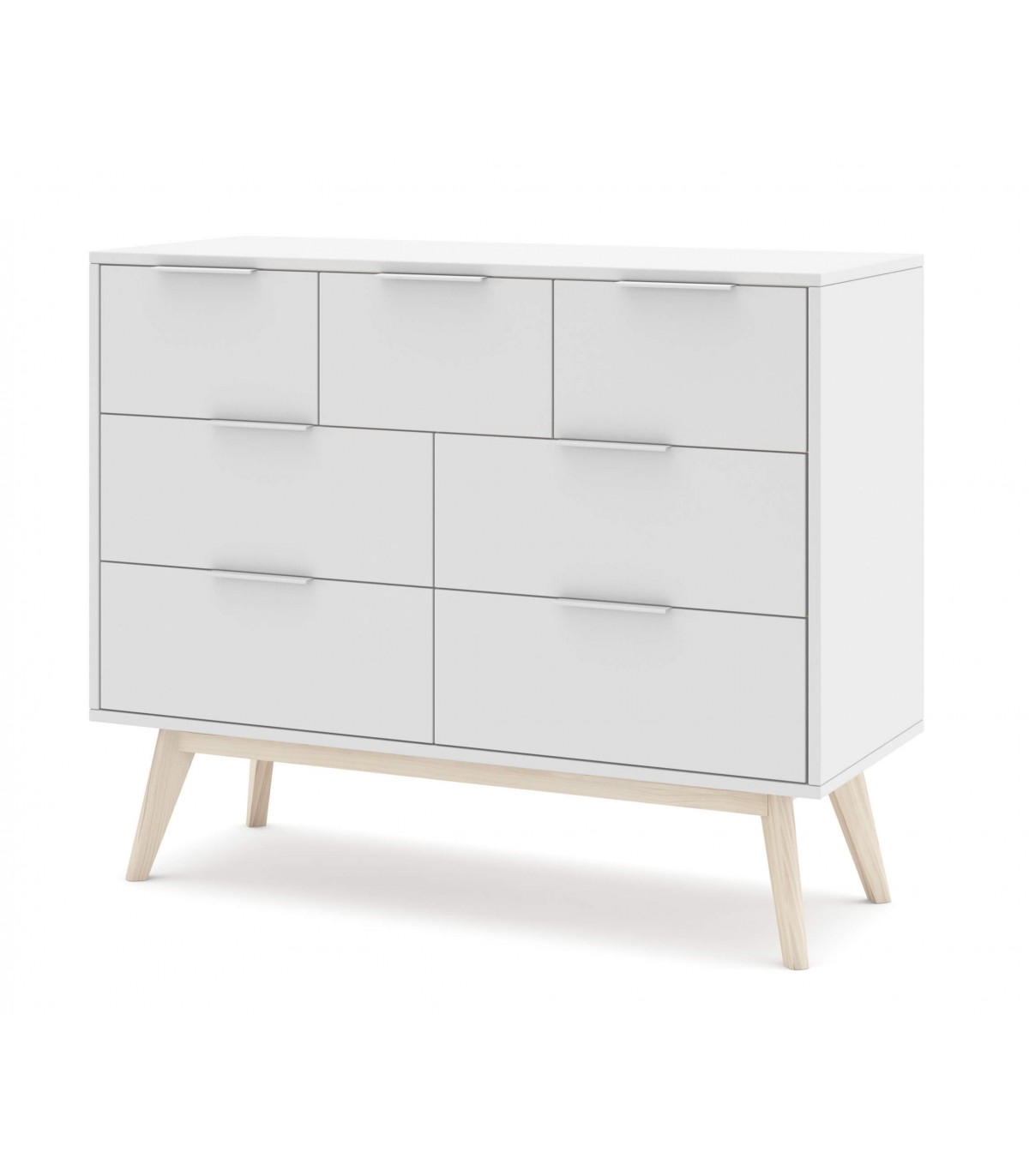 Cómoda grande de línea nórdica lacado en color blanco y madera natural con 7 cajones, de buena presencia y capacidad, el lacado en color blanco y el contraste con la madera natural le da un aspecto muy fresco y actual.