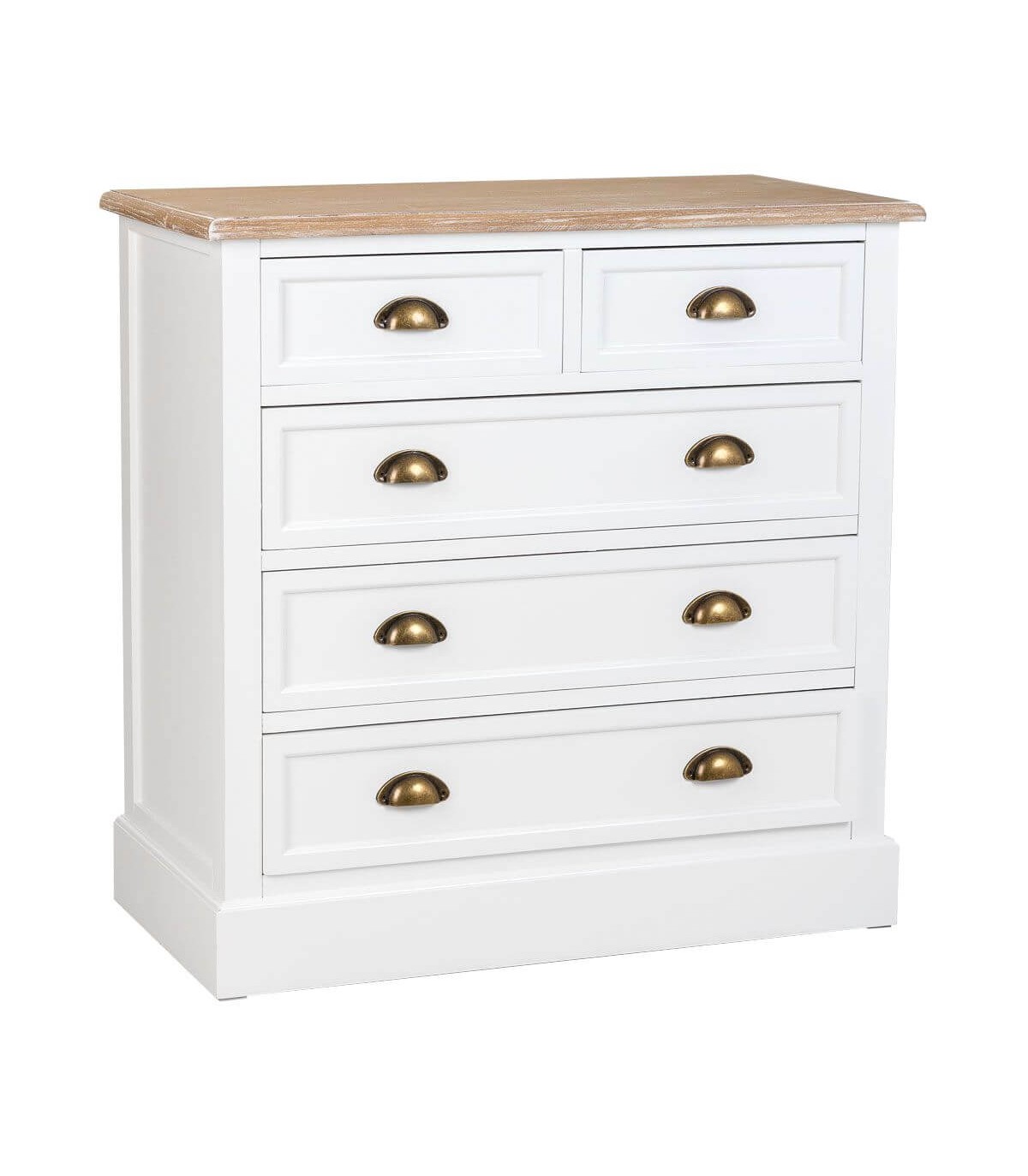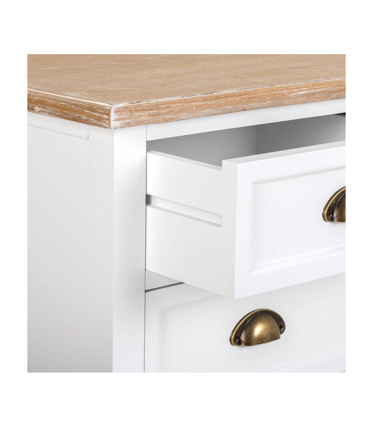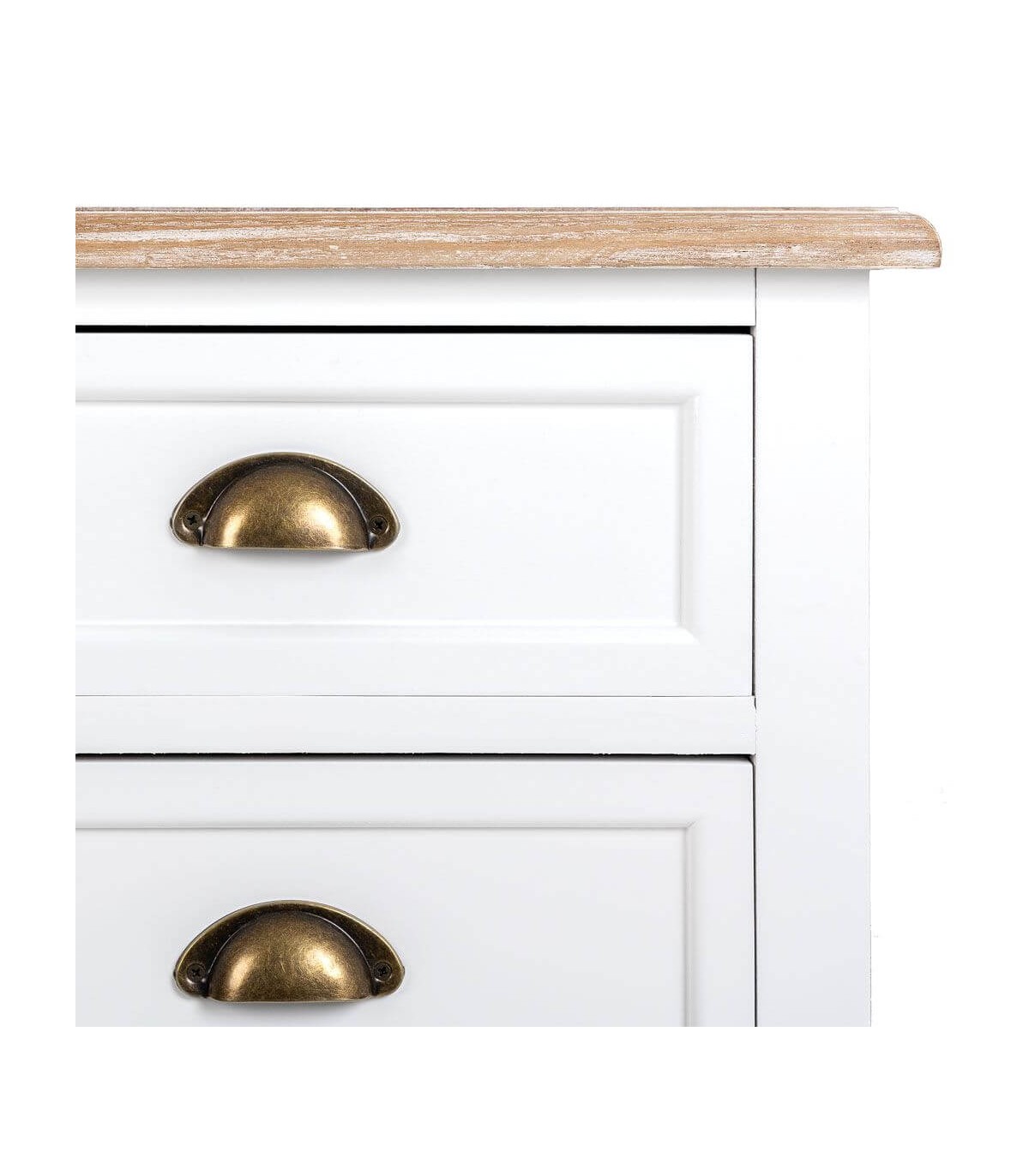 Cómoda de nuestra colección Mirlo, una colección que se caracteriza por su luminosidad, realizada en madera lacada en blanco con la tapa en madera natural patinada en blanco, de líneas rectas con el contraste del tirador tipo concha en metal acabado bronce, una colección de muebles auxiliares con los que podrás darle un toque rústico mediterráneo a cualquier estancia de tu hogar.