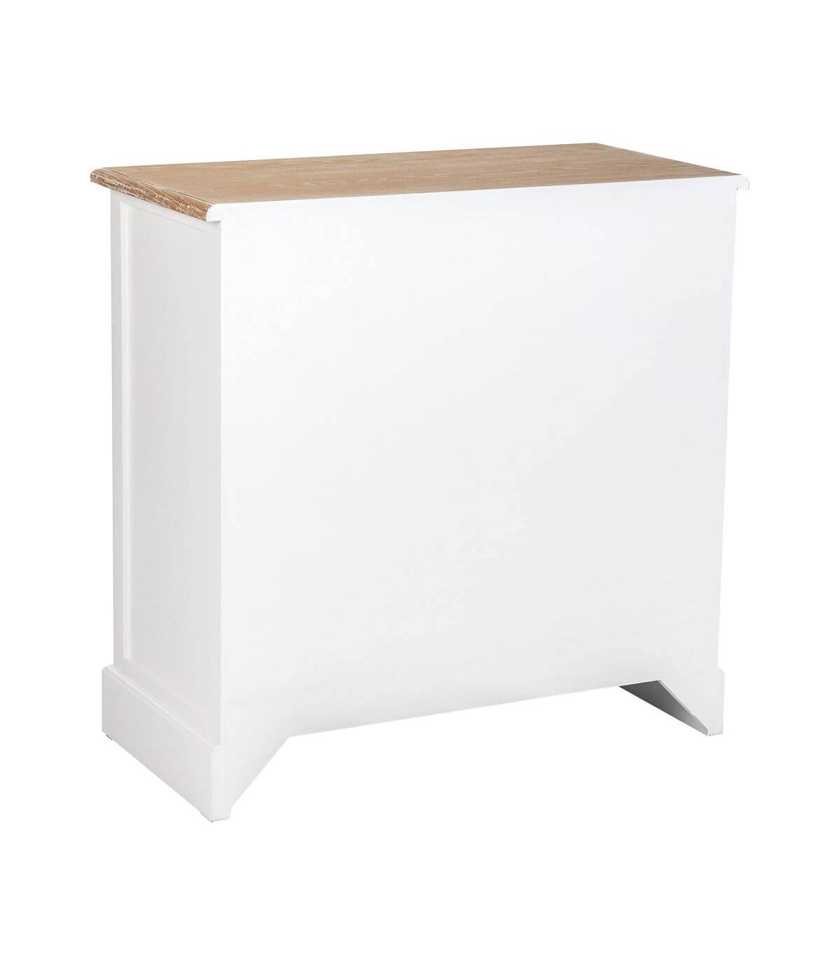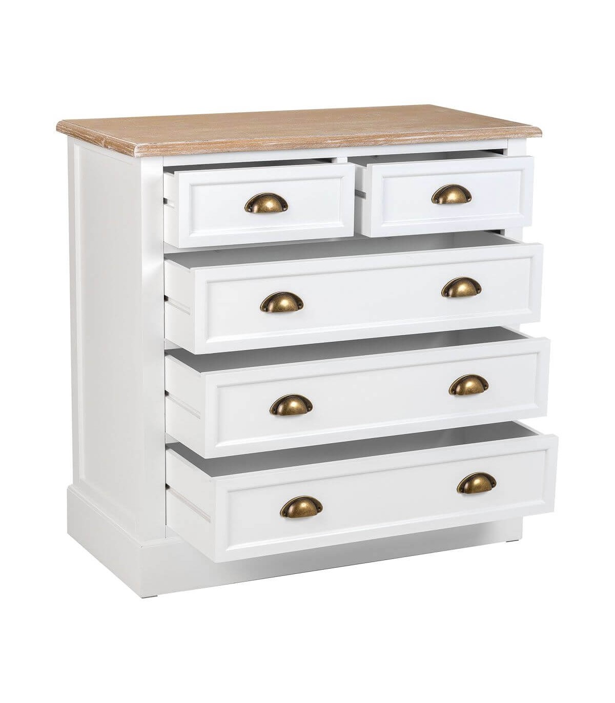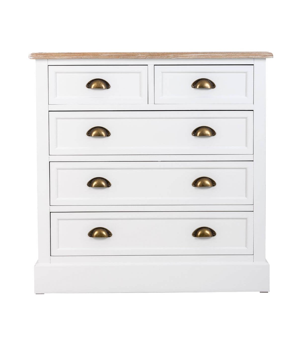 Cómoda de nuestra colección Mirlo, una colección que se caracteriza por su luminosidad, realizada en madera lacada en blanco con la tapa en madera natural patinada en blanco, de líneas rectas con el contraste del tirador tipo concha en metal acabado bronce, una colección de muebles auxiliares con los que podrás darle un toque rústico mediterráneo a cualquier estancia de tu hogar.