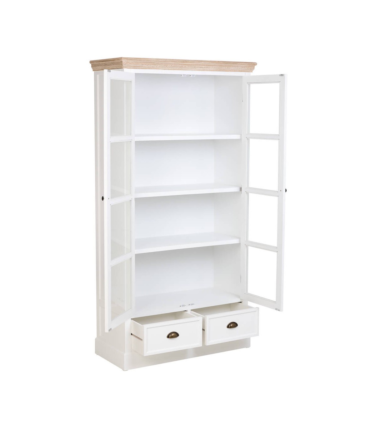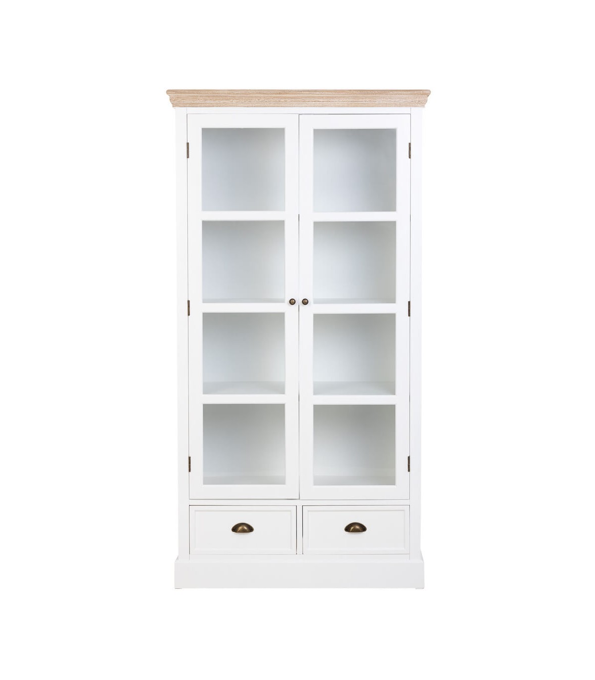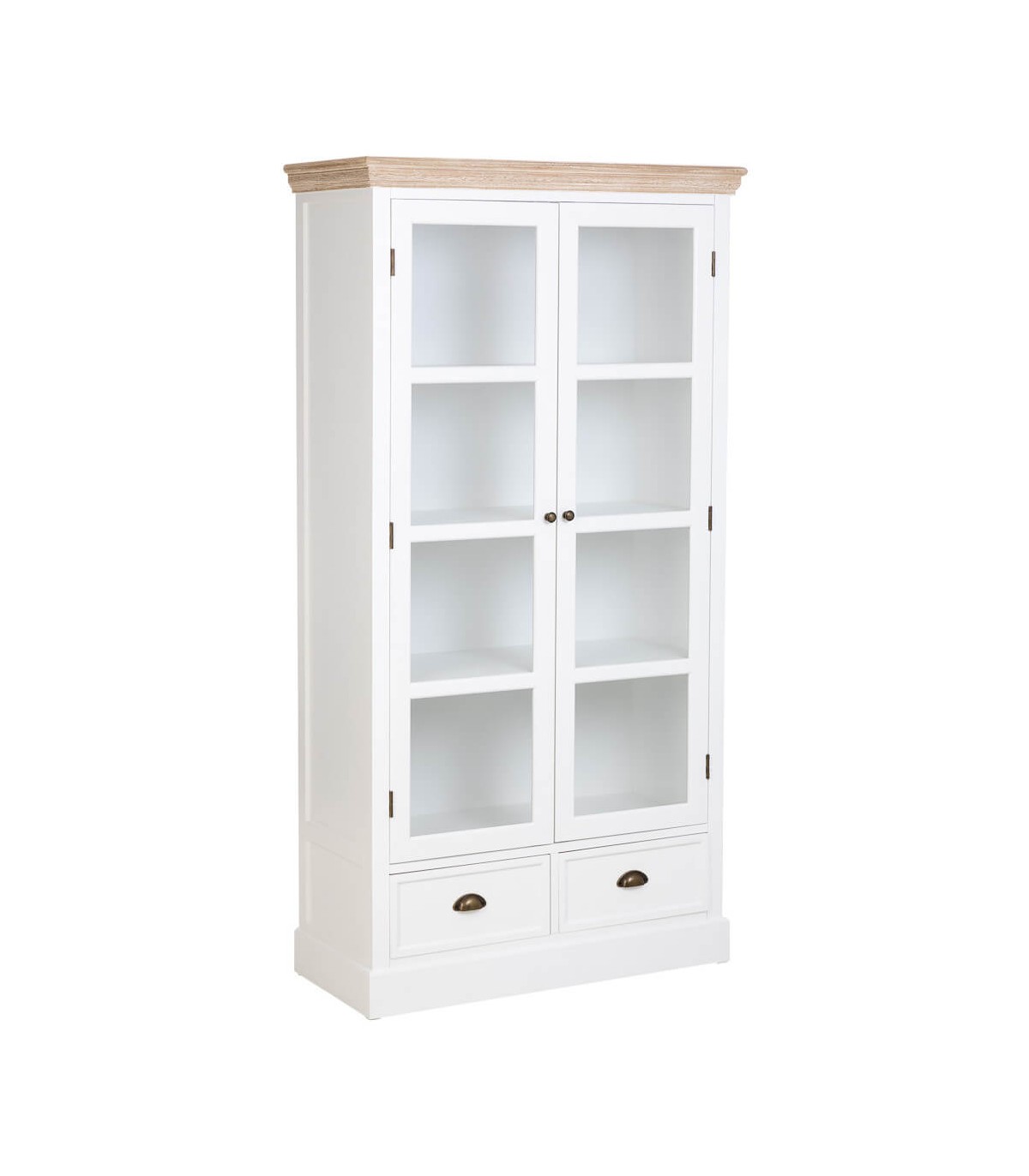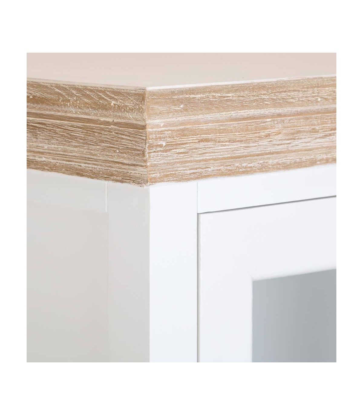 Esta vitrina combina la sencillez del estilo rústico con un aire refinado que realza cualquier espacio. Fabricada en madera de abeto, cuenta con dos puertas acristaladas que permiten lucir la vajilla o piezas decorativas, aportando luminosidad y ligereza visual.