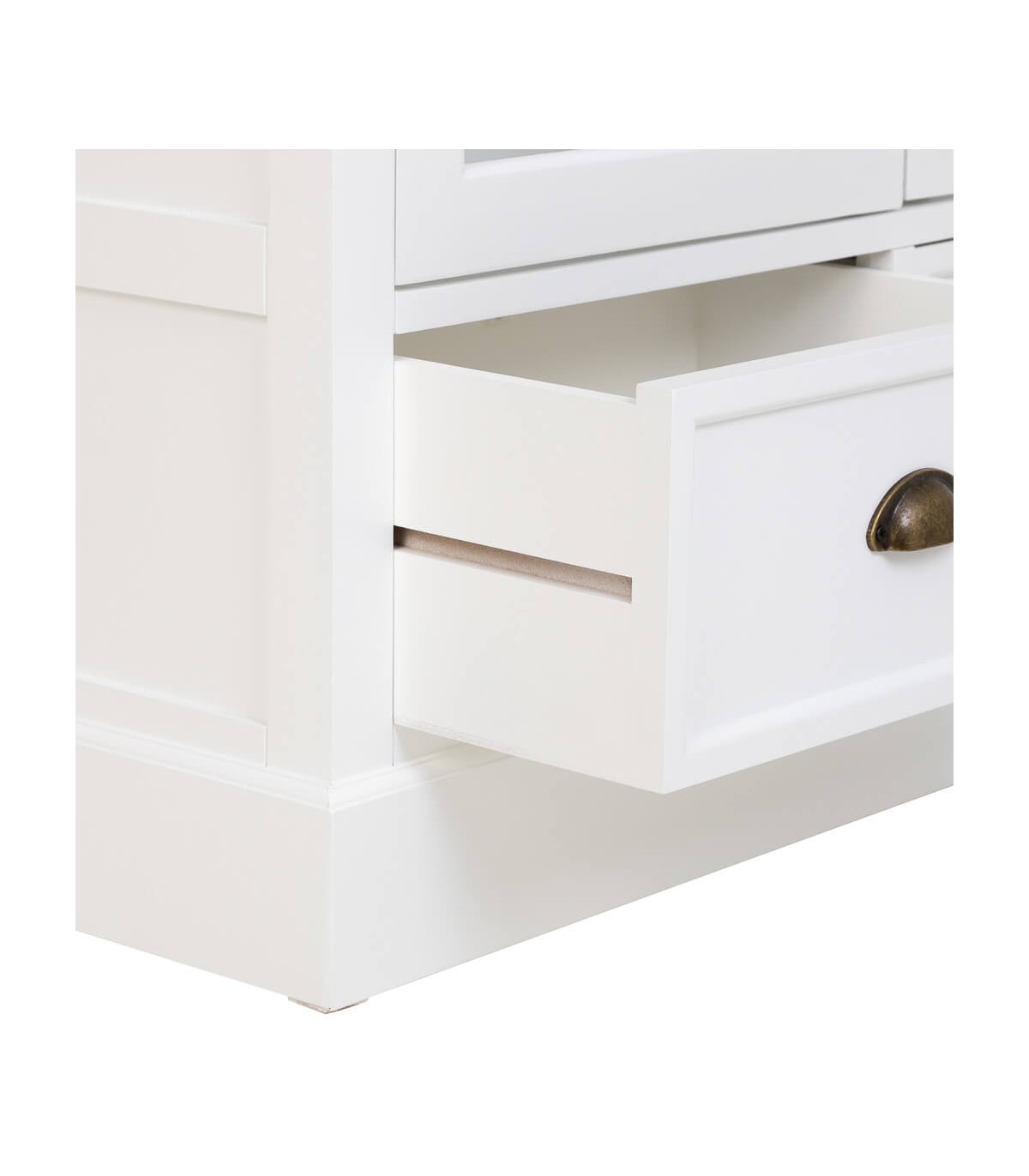 🎨 Acabado: Tapa en madera natural patinada en blanco, cuerpo lacado en blanco, tiradores bronce