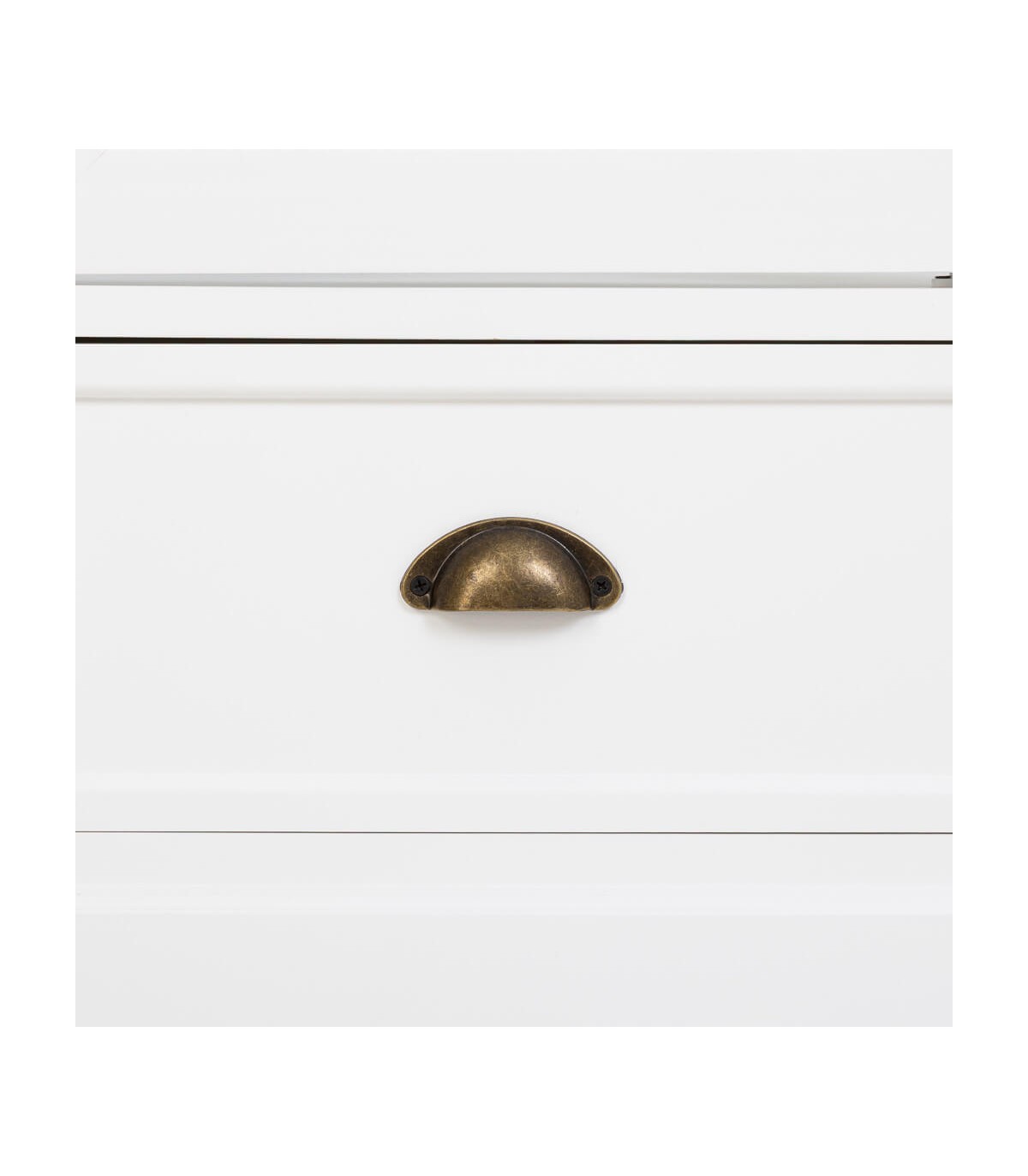 Los dos cajones inferiores resultan prácticos para almacenar utensilios, textiles u objetos de uso diario, mientras que la tapa superior en madera natural patinada añade calidez y autenticidad. Su acabado en blanco contrasta con los tiradores de bronce, creando un equilibrio entre tradición y frescura contemporánea.