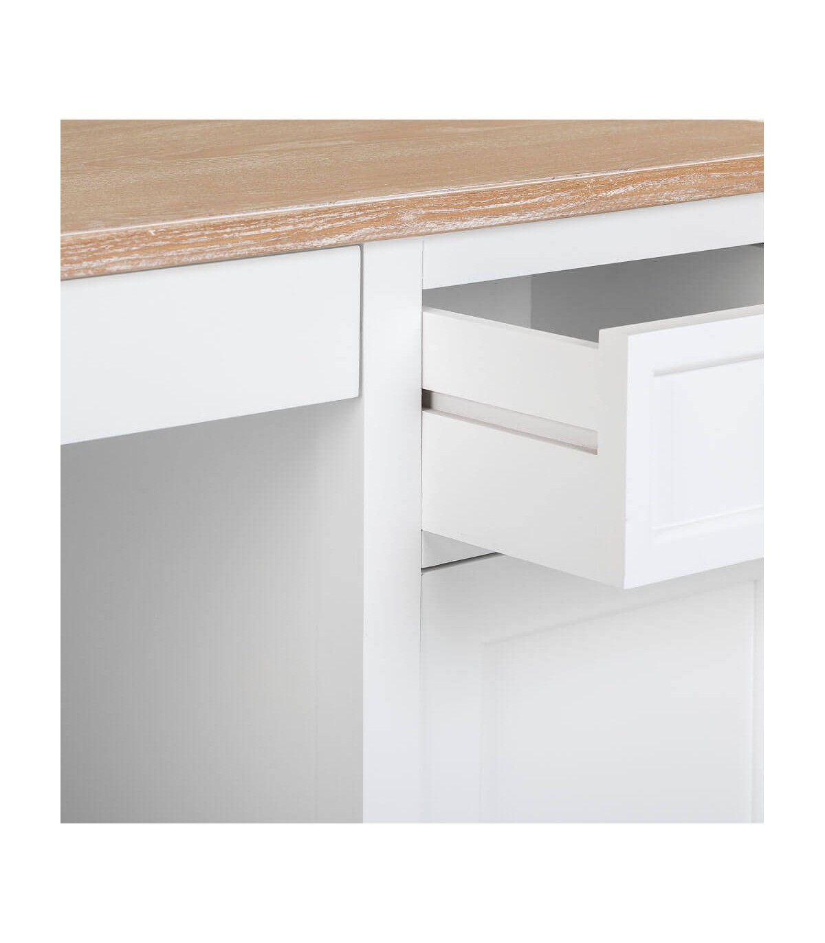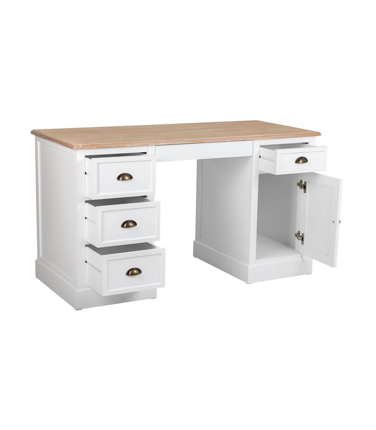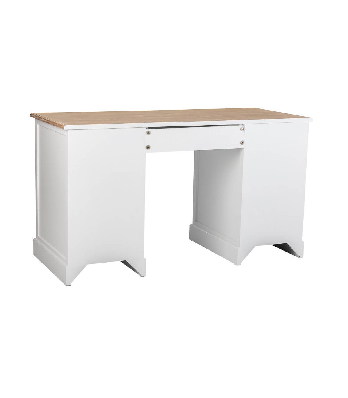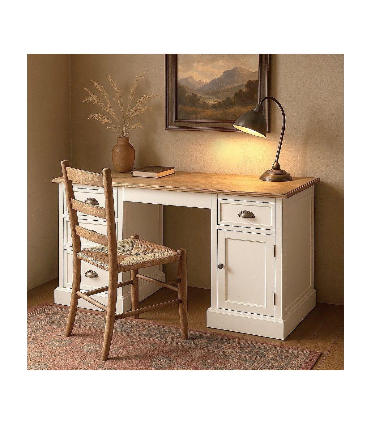 Este escritorio combina la funcionalidad diaria con una estética cálida que viste cualquier espacio de trabajo con encanto. Su tapa en madera natural patinada aporta carácter y textura, mientras el cuerpo blanco lacado aporta luz y ligereza visual.