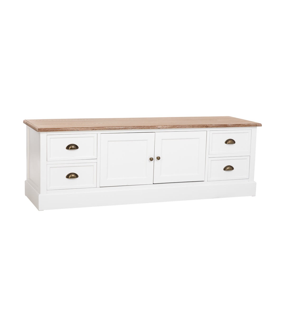Los tiradores en bronce envejecido refuerzan su carácter rústico y artesanal, mientras que las líneas rectas y la base sólida aportan estabilidad y serenidad. Ofrece cuatro cajones laterales y dos puertas centrales que permiten organizar con orden dispositivos y complementos. Una pieza funcional y elegante que viste el salón con encanto y naturalidad.