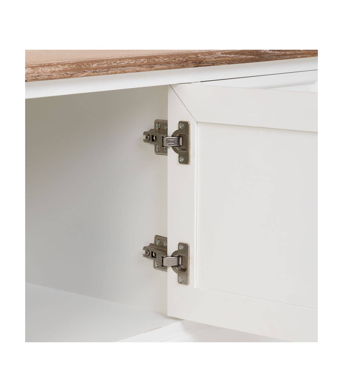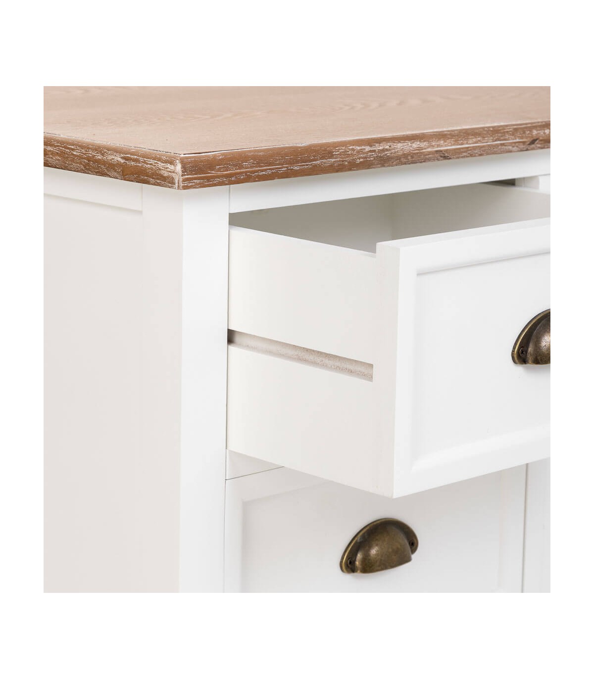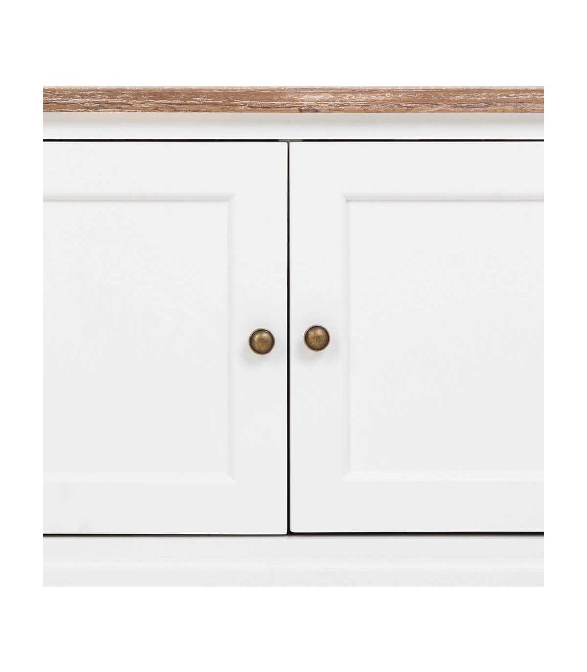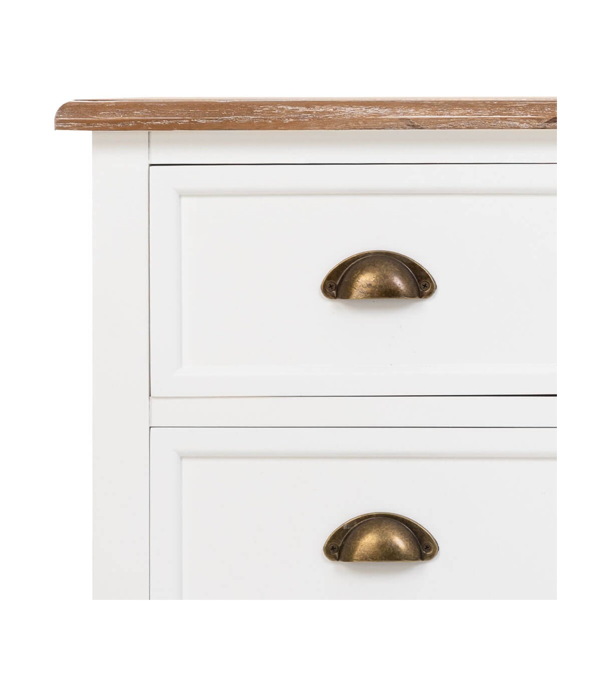 🎨 Acabado: Tapa en madera natural patinada en blanco, cuerpo lacado en blanco, tiradores bronce