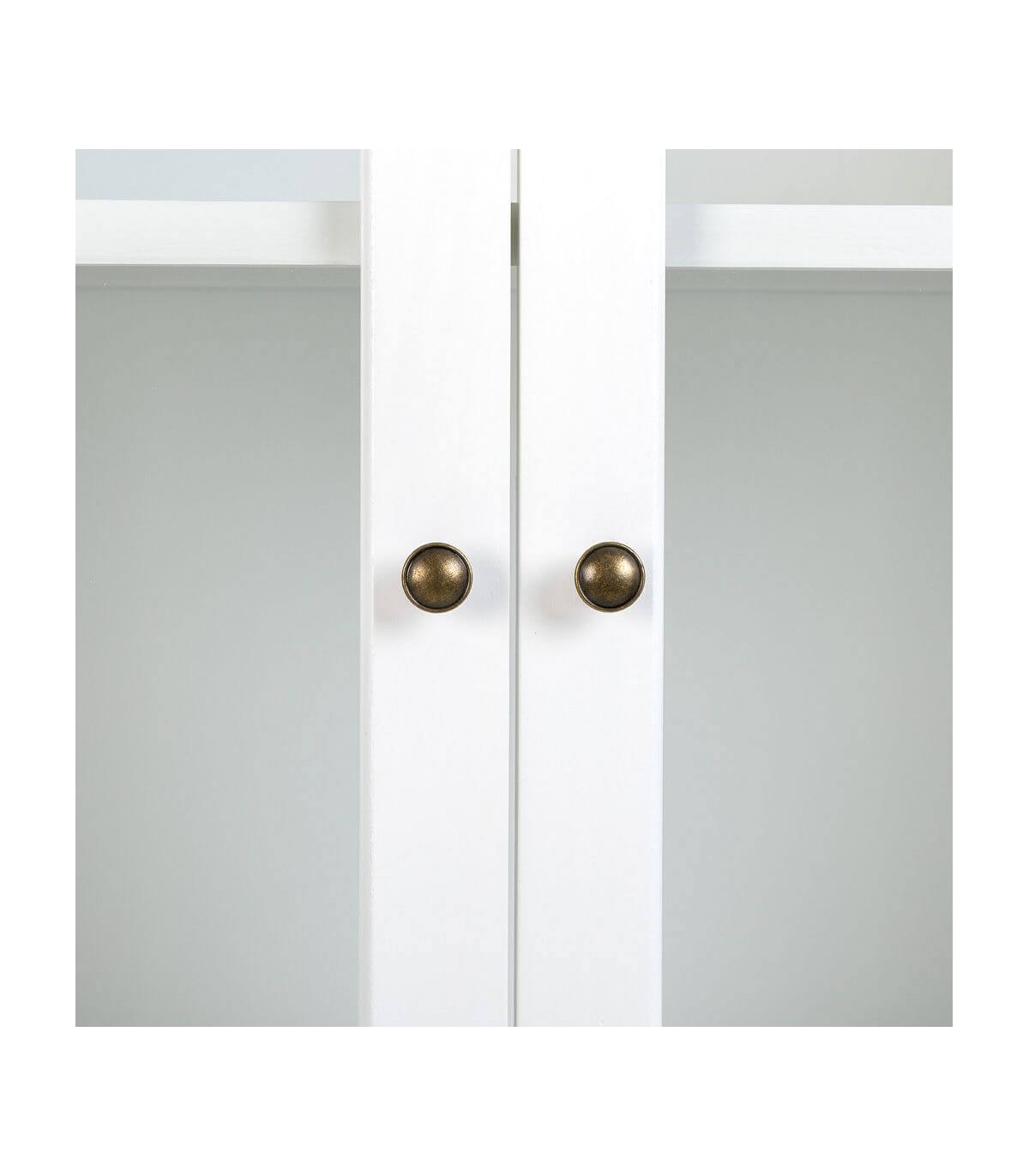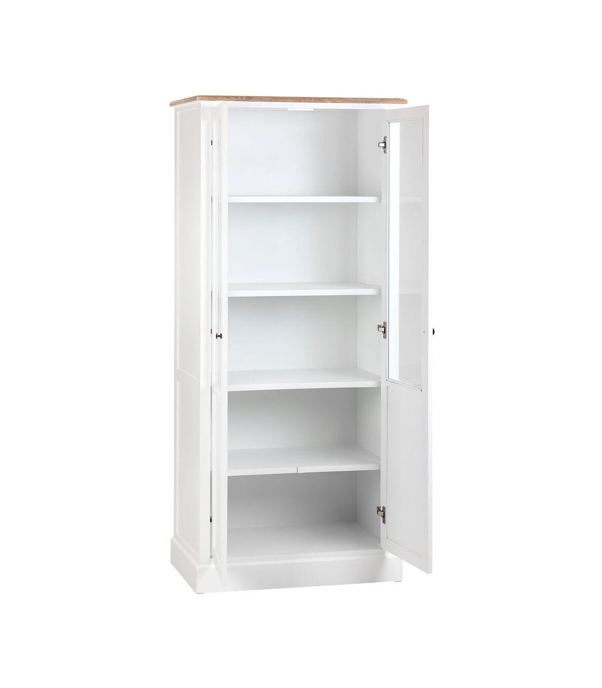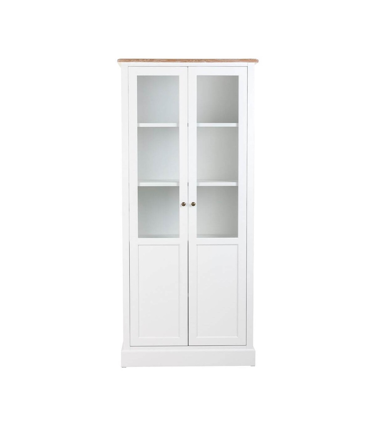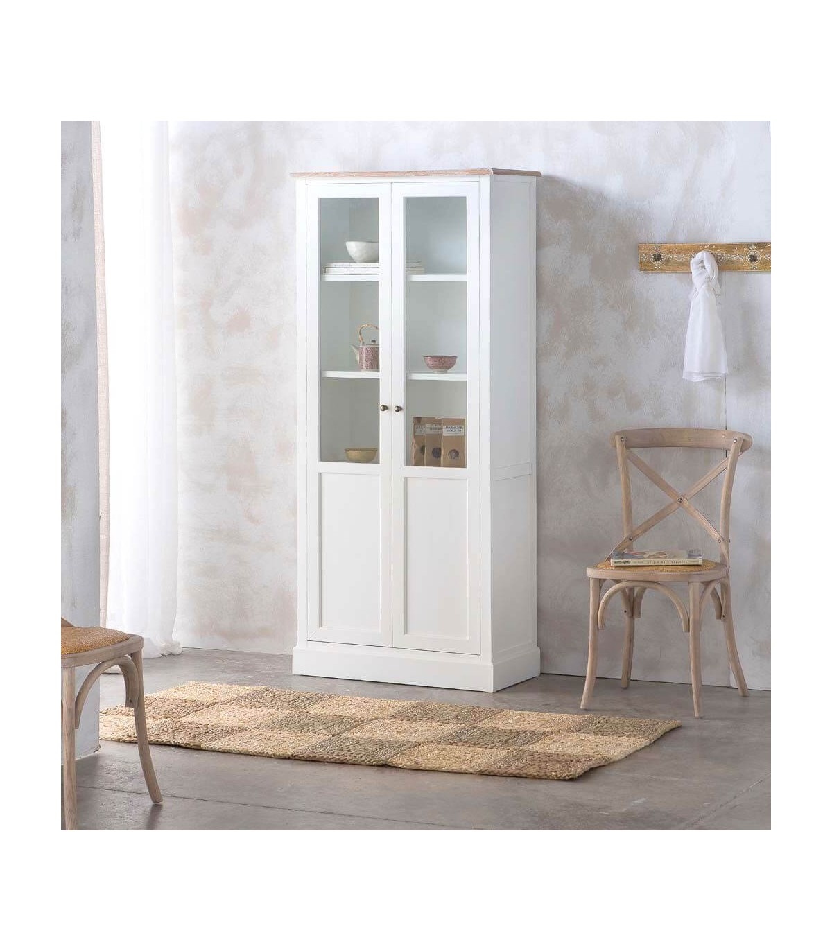 Vitrina de nuestra colección Mirlo, una colección que se caracteriza por su luminosidad, realizada en madera lacada en blanco con la tapa en madera natural patinada en blanco, de líneas rectas con el contraste del tirador tipo concha en metal acabado bronce, una colección de muebles auxiliares con los que podrás darle un toque rústico mediterráneo a cualquier estancia de tu hogar.
