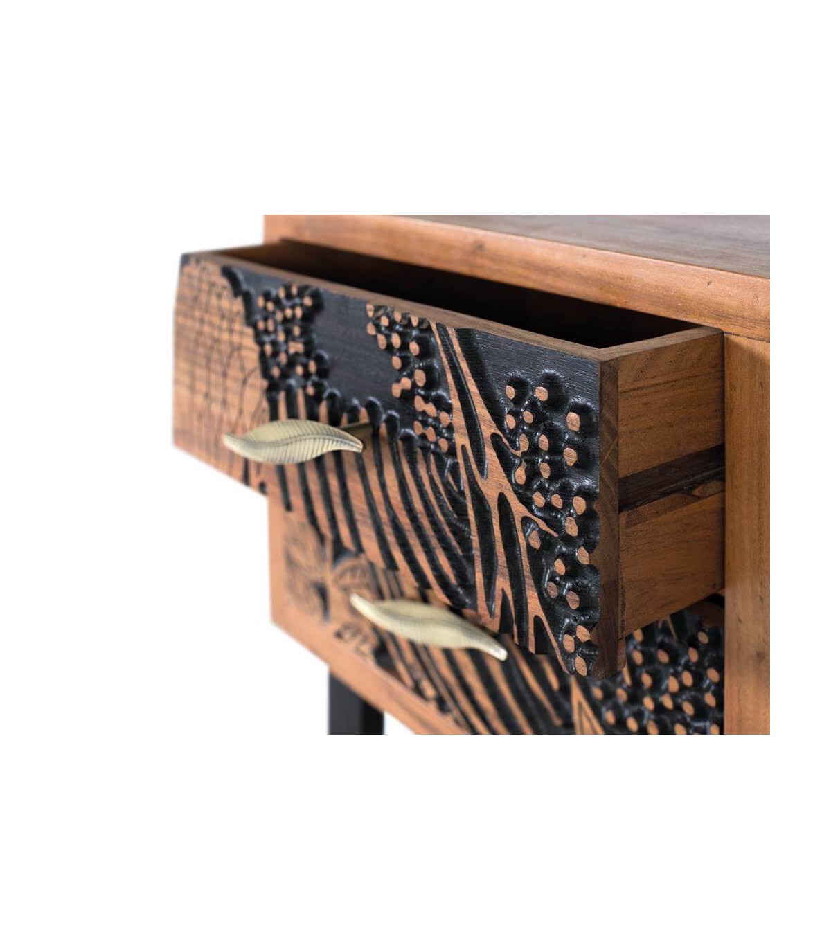 Acabado, madera maciza de acacia natural combinada con negro, patas en metal color negro, tiradores en forma de hoja que hace juego con el frente de los cajones. Fabricación artesanal. entendemos las variaciones de tonalidad, tamaño y forma o ciertas imperfecciones (grietas, nudos, marcas) como un valor añadido que la convierten en pieza única.