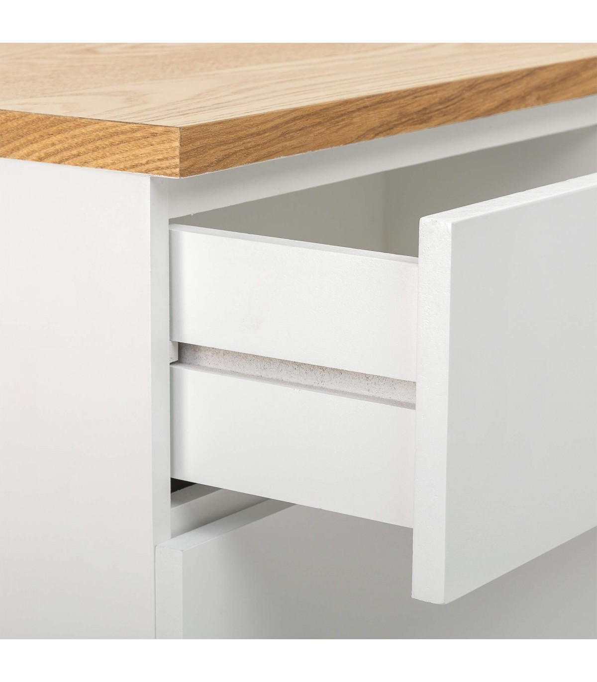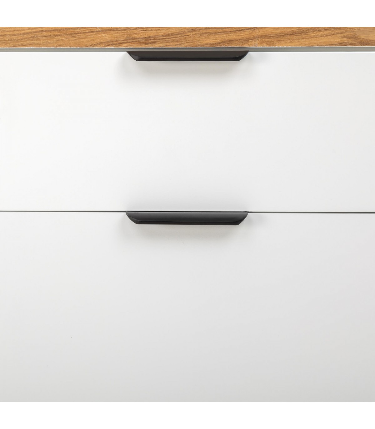 Acabado, tapa madera natural patinada, madera lacada en blanco, tiradores metal negro.