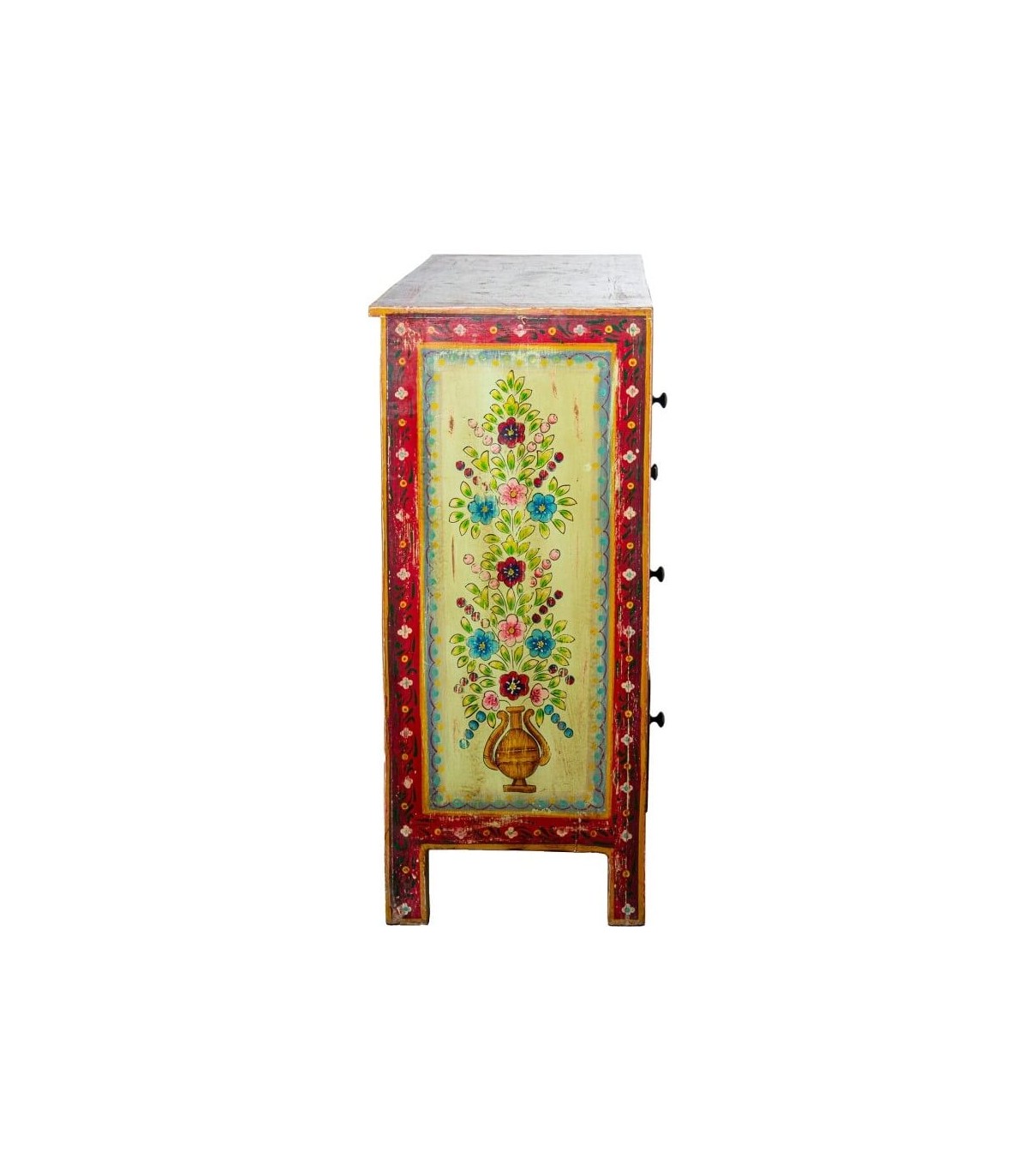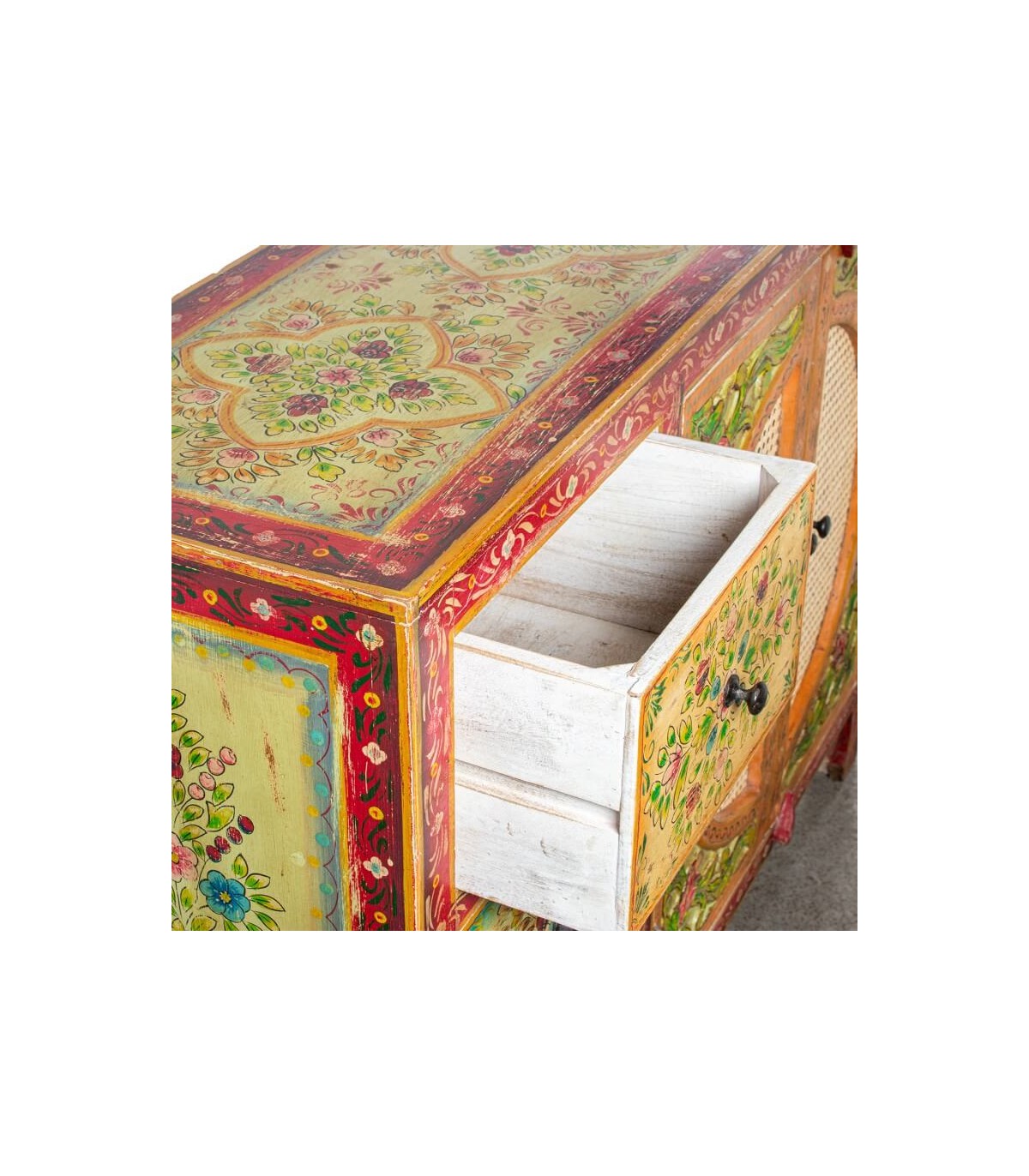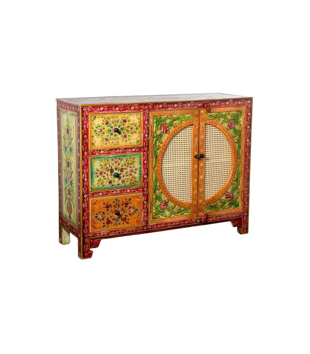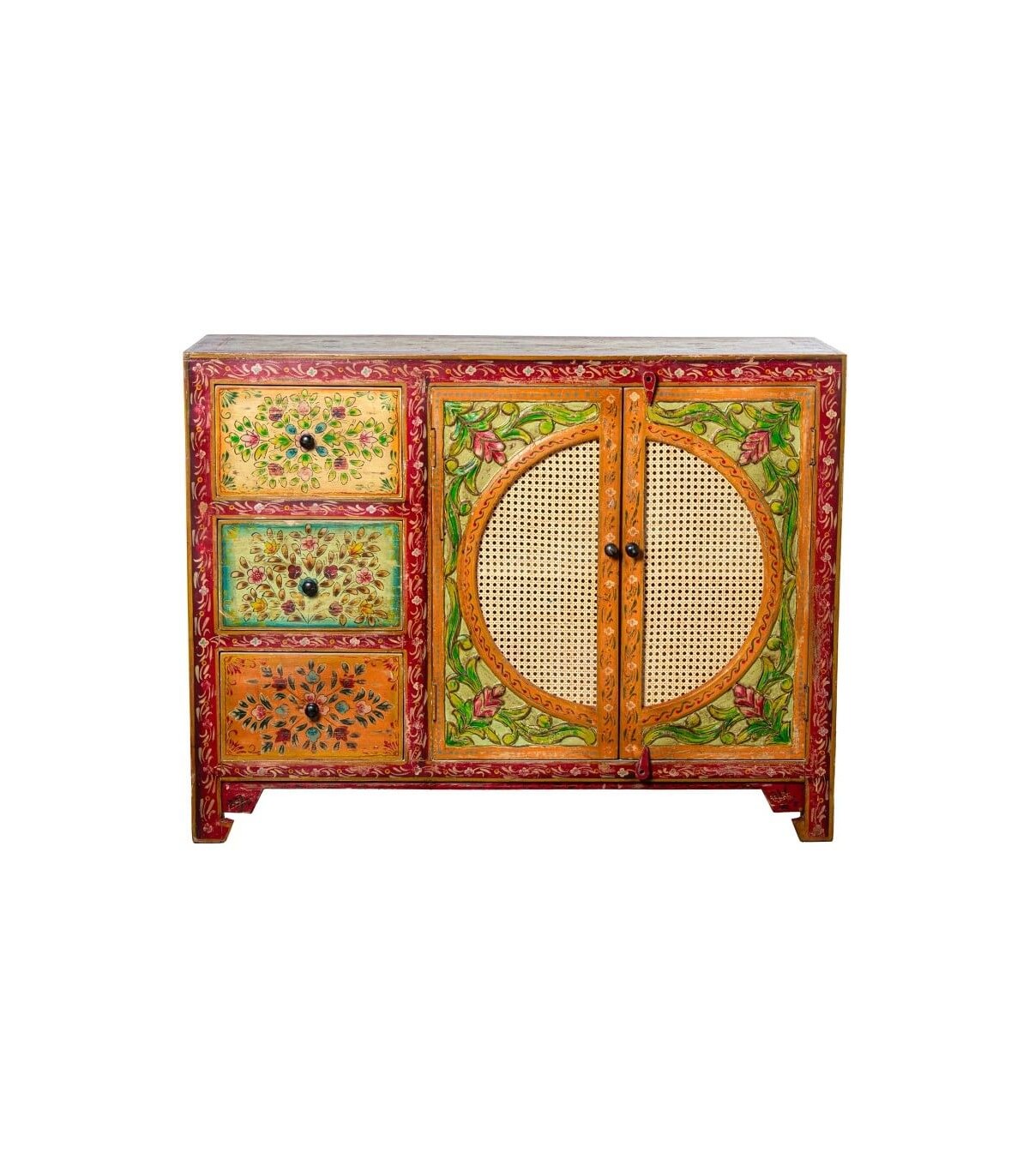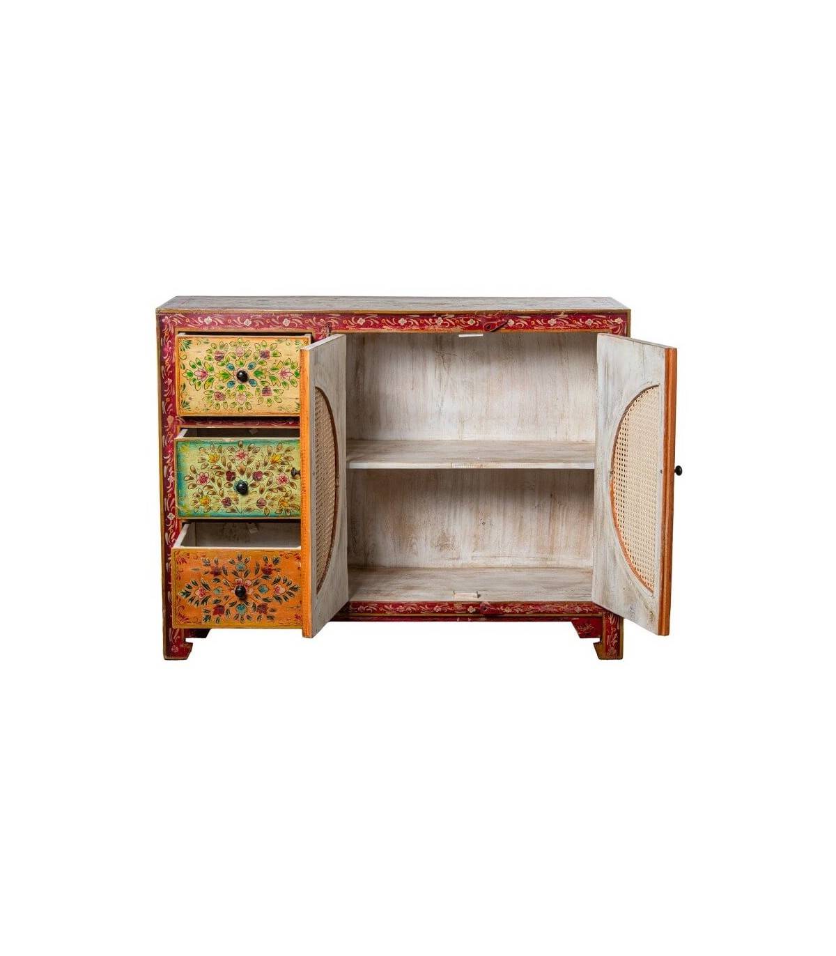 Aparador con 2 puertas y 3 cajones realizado en madera tallada y decorada a mano combinada con ratán y el interior decapado en blanco, una colección de importación realizada en la india, un mueble de buena calidad trabajado en madera maciza y con todos los detalles pintados a mano, una colección perfecta para quien quiere darle un toque étnico a su decoración.