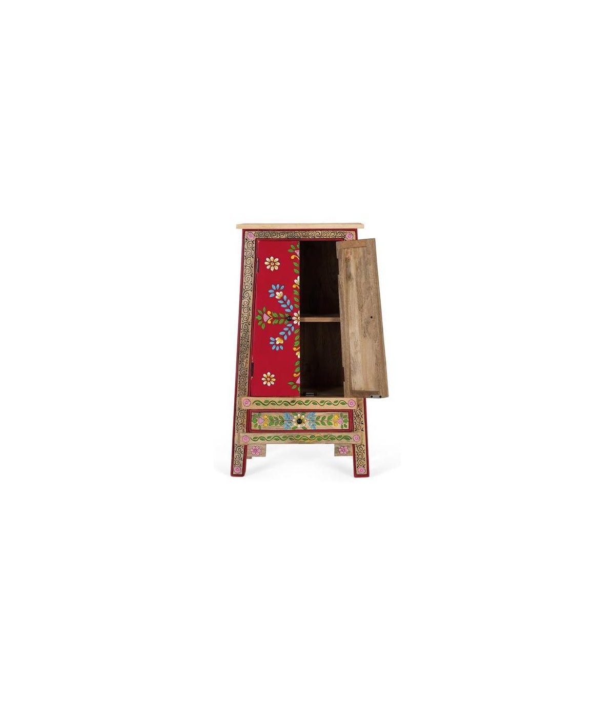 Dale vida a cualquier rincón con este armario bajo de madera de mango, decorado a mano con motivos florales sobre fondo rojo lacado. Su estructura trapezoidal, la puerta con estantes interiores y el cajón con tiradores metálicos negros lo convierten en una pieza funcional y artística.