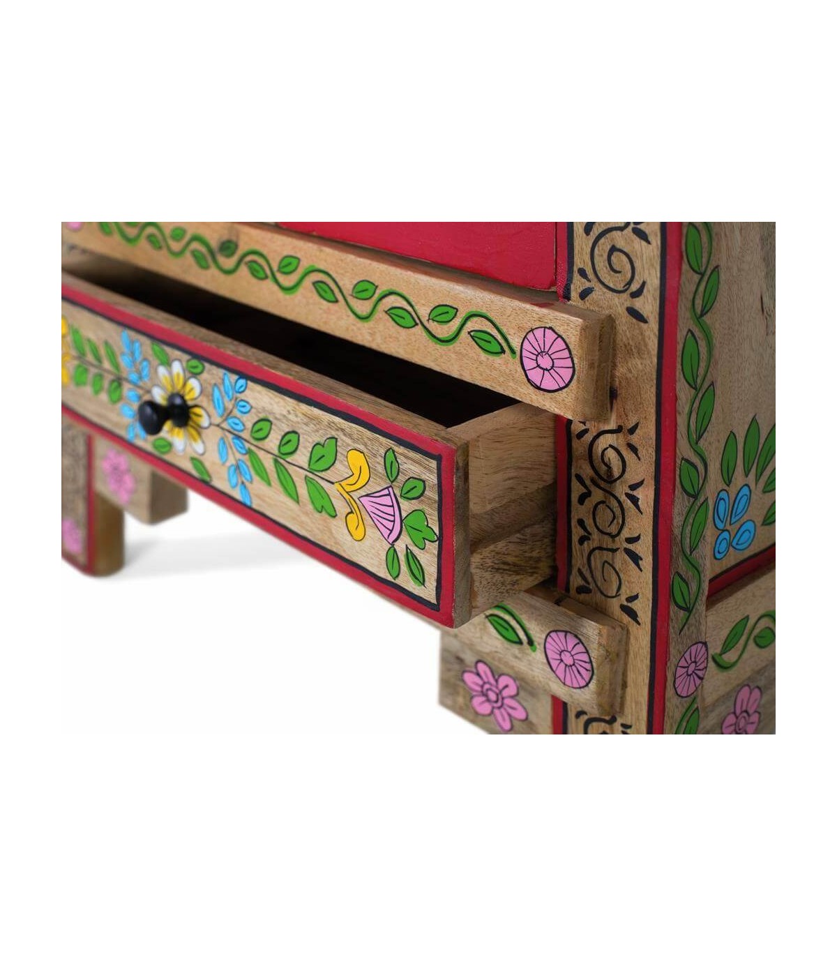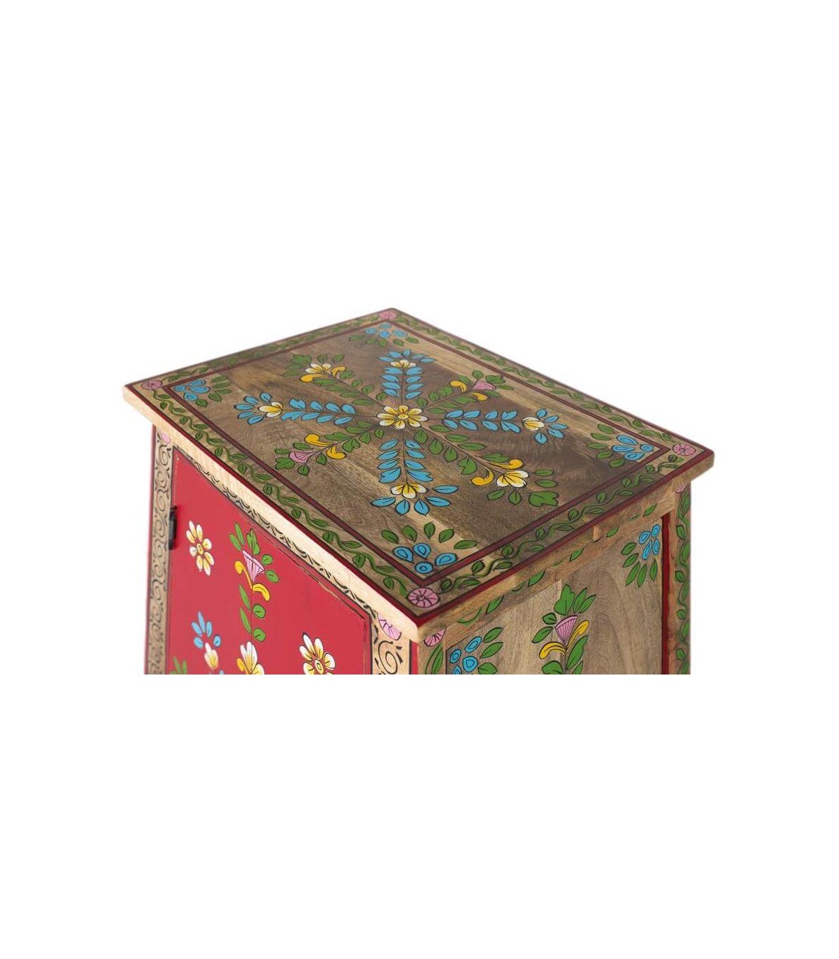 Los laterales y la parte superior también están cuidadosamente ilustrados, destacando su acabado artesanal. Un mueble con aire bohemio y étnico, perfecto para dar color y personalidad a tu decoración.
