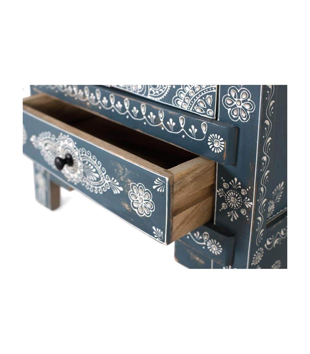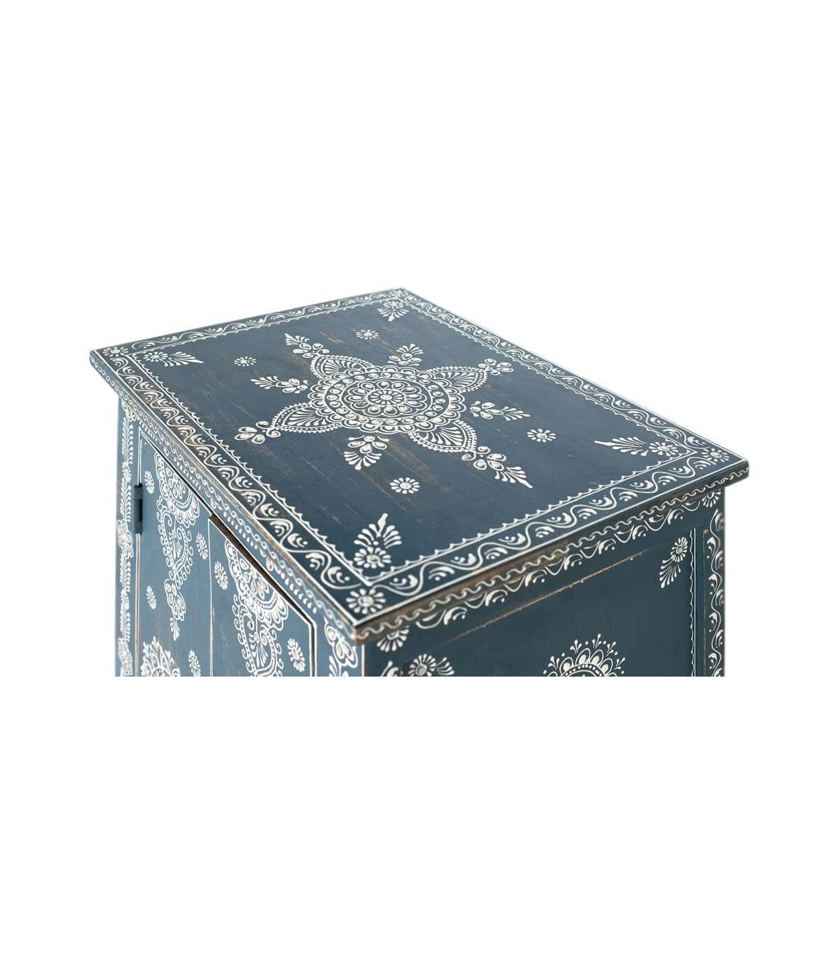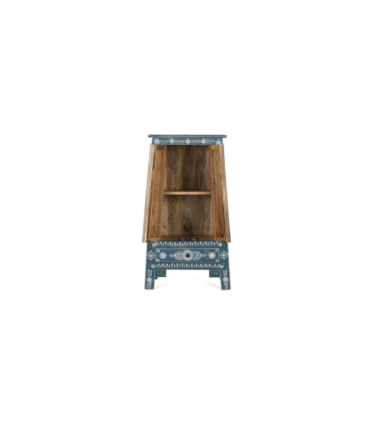 Realizado en madera de mango en un vibrante color azul y adornado con detalles blancos pintados a mano, este mueble auxiliar destaca por sus rasgos étnicos y su diseño único. Ideal para espacios bohemios o contemporáneos, aporta carácter y funcionalidad en cualquier rincón de tu hogar.