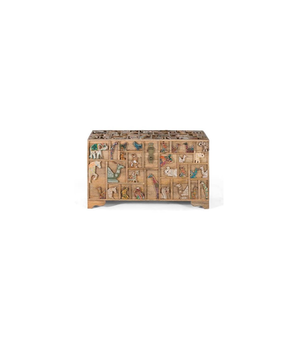 Baúl realizado en madera maciza de mango natural, con todos los detalles tallados y pintados a mano, un baúl original que sin duda será el centro de atención.