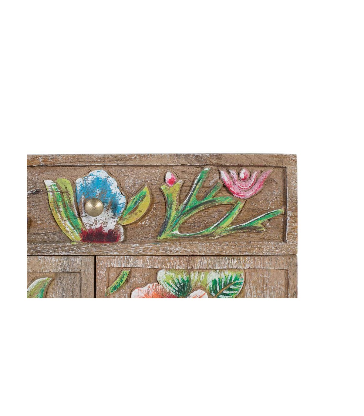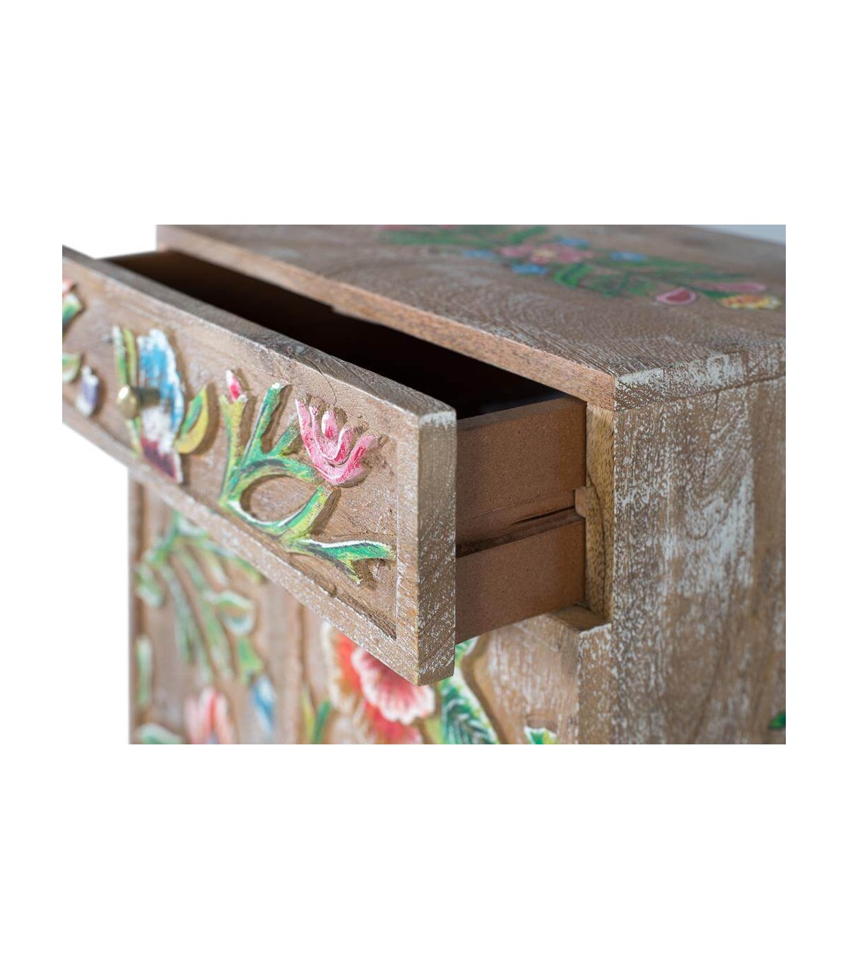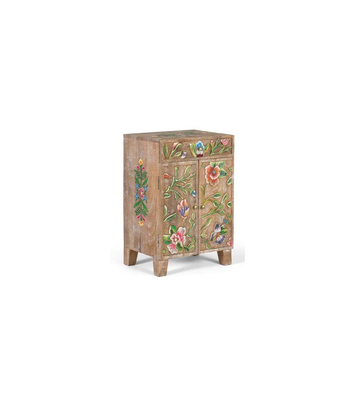 Dale un toque artesanal y lleno de color a tu dormitorio con esta encantadora mesita de noche de estilo étnico. Realizada en madera maciza de mango, presenta un diseño floral tallado en relieve y decorado a mano en vibrantes tonos verdes, rojos, rosas y azules.