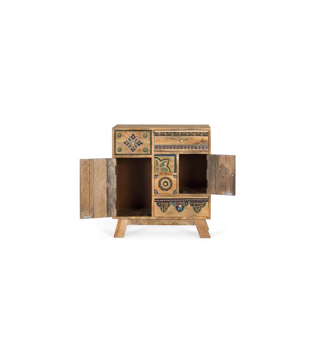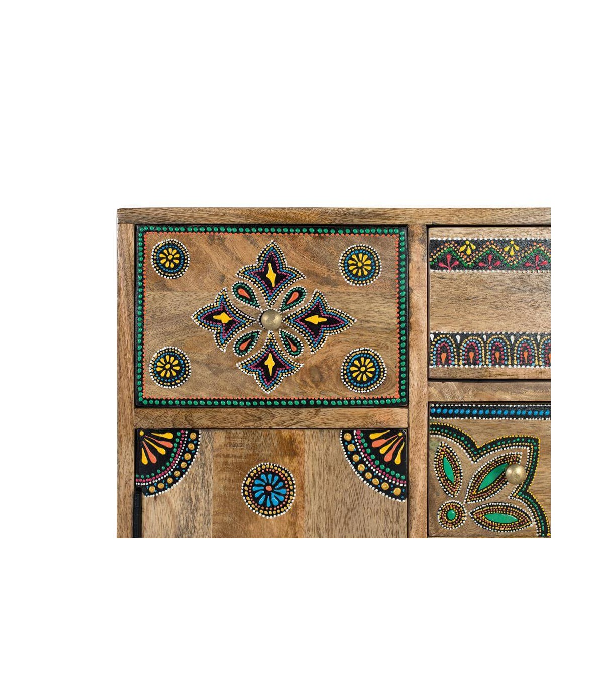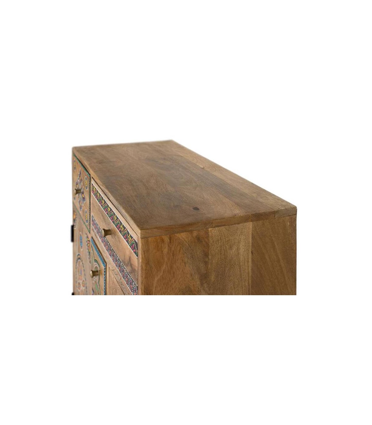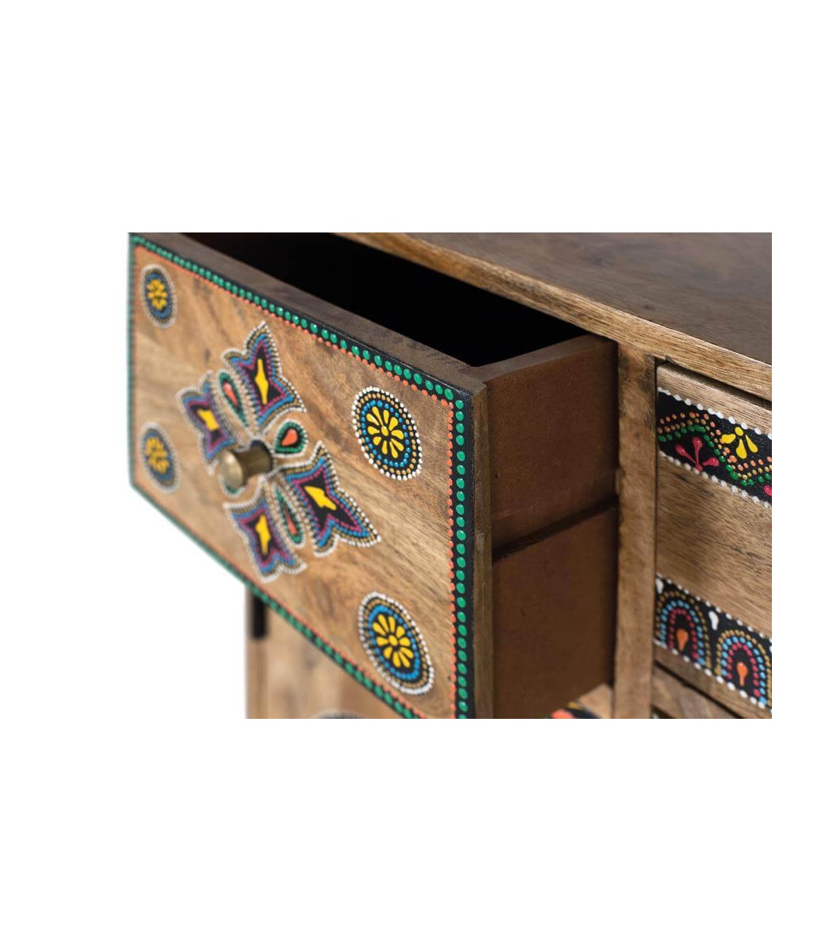 Taquillón de nuestra colección de muebles Arapea, una colección de importación realizada en la india, un mueble de buena calidad trabajado en madera maciza y con todos los detalles pintados a mano, una colección perfecta para quien quiere darle un toque étnico a su decoración.