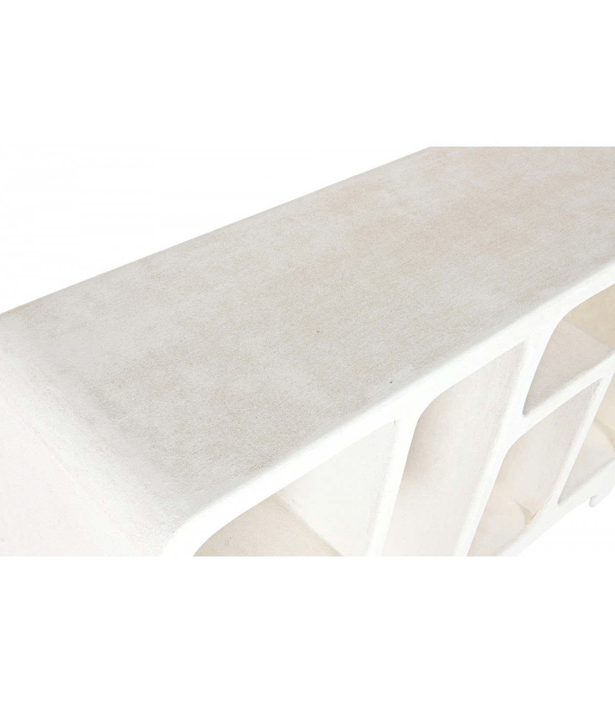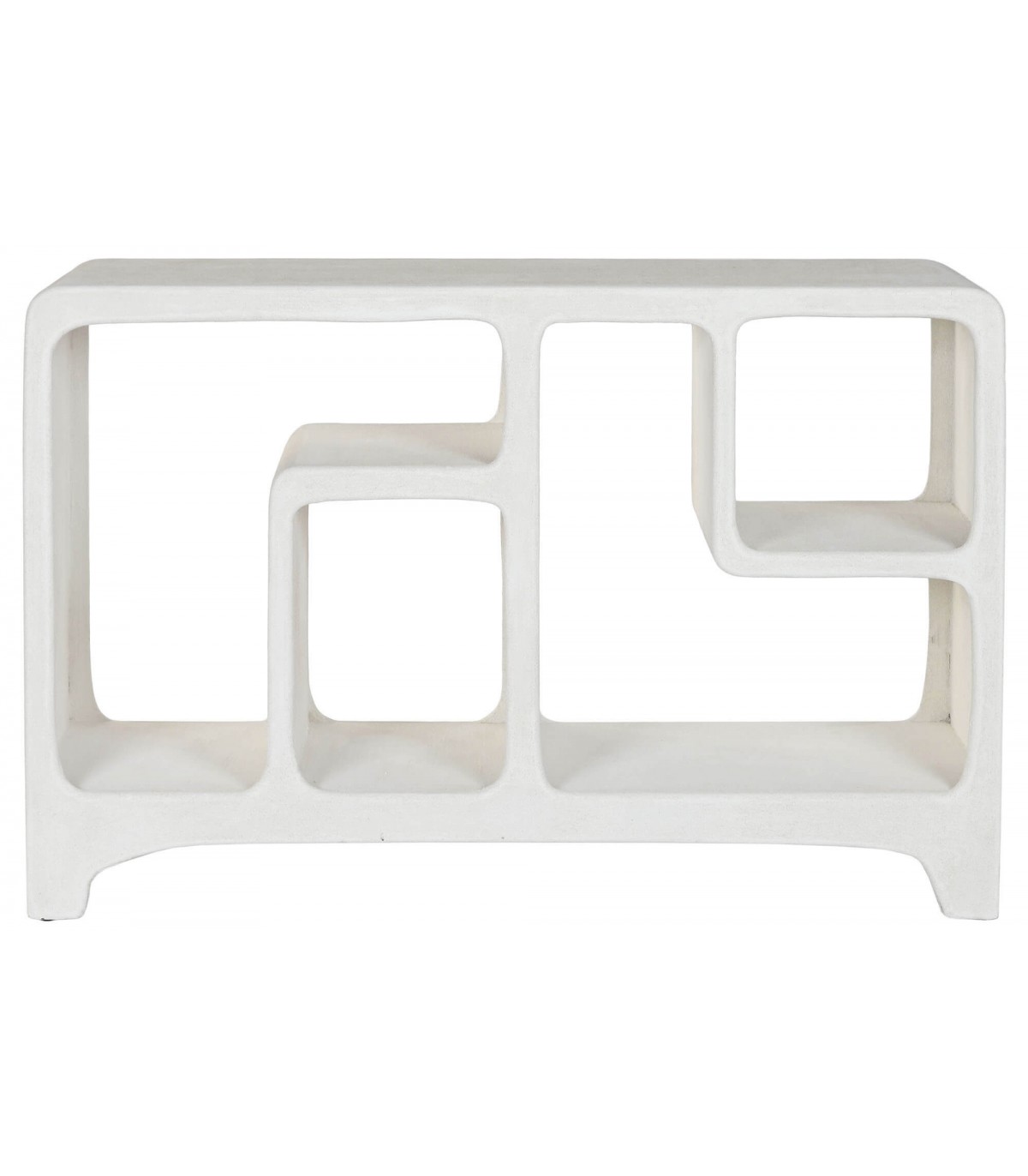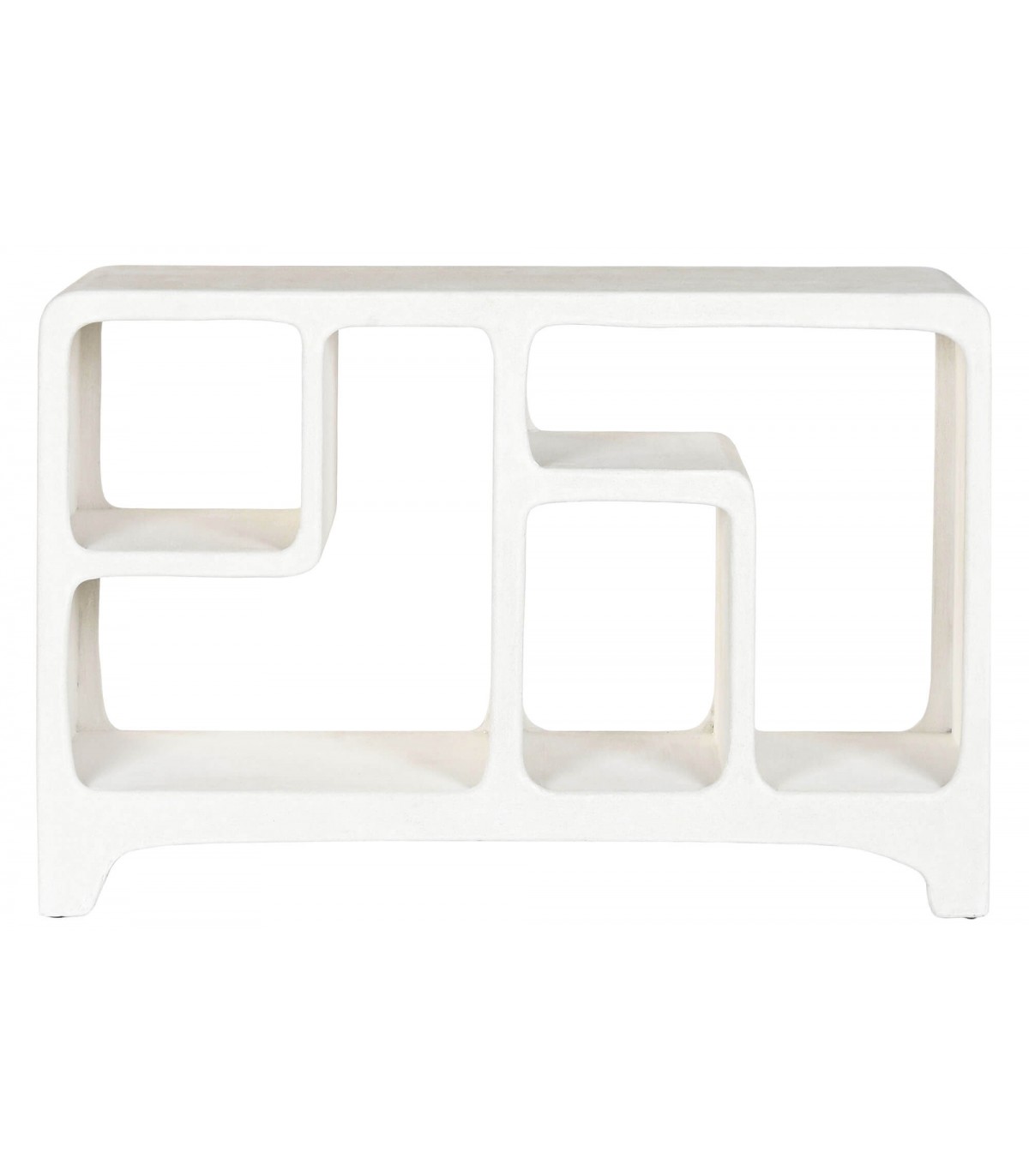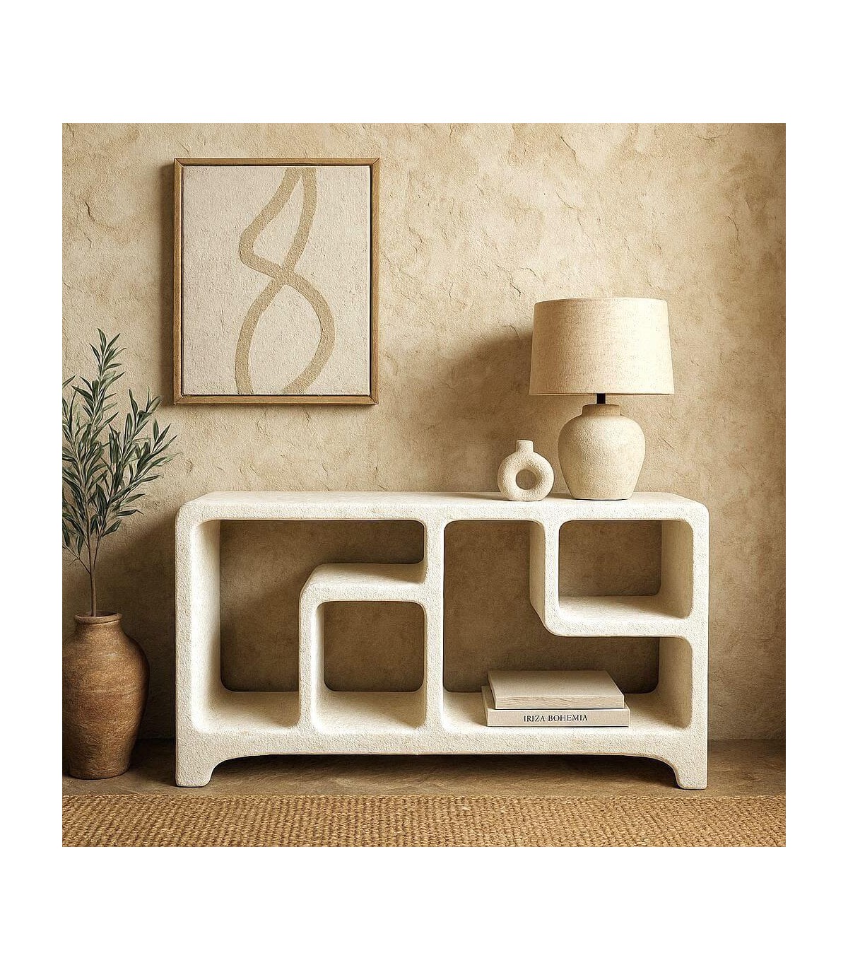 Esta pieza impactante fusiona la funcionalidad de una consola con el carácter escultórico de una estantería baja. Su diseño orgánico, con huecos fluidos y líneas curvas, evoca la arquitectura mediterránea más pura.