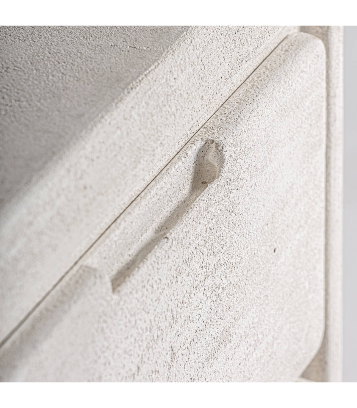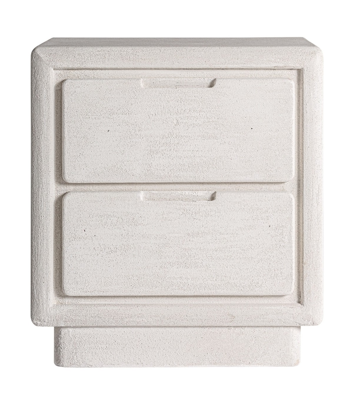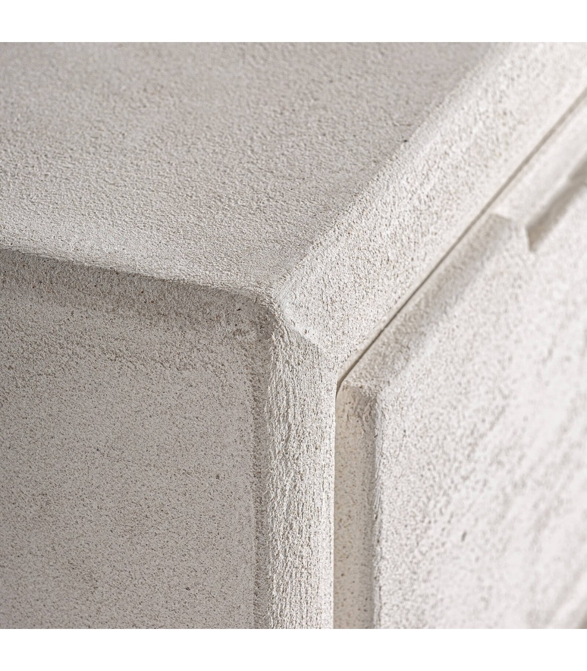 Mesita de noche, realizada en madera dm efecto yeso blanco roto, un mueble de estilo ibicenco que le dará frescura y luminosidad a tu decoración con sus formas redondeadas.