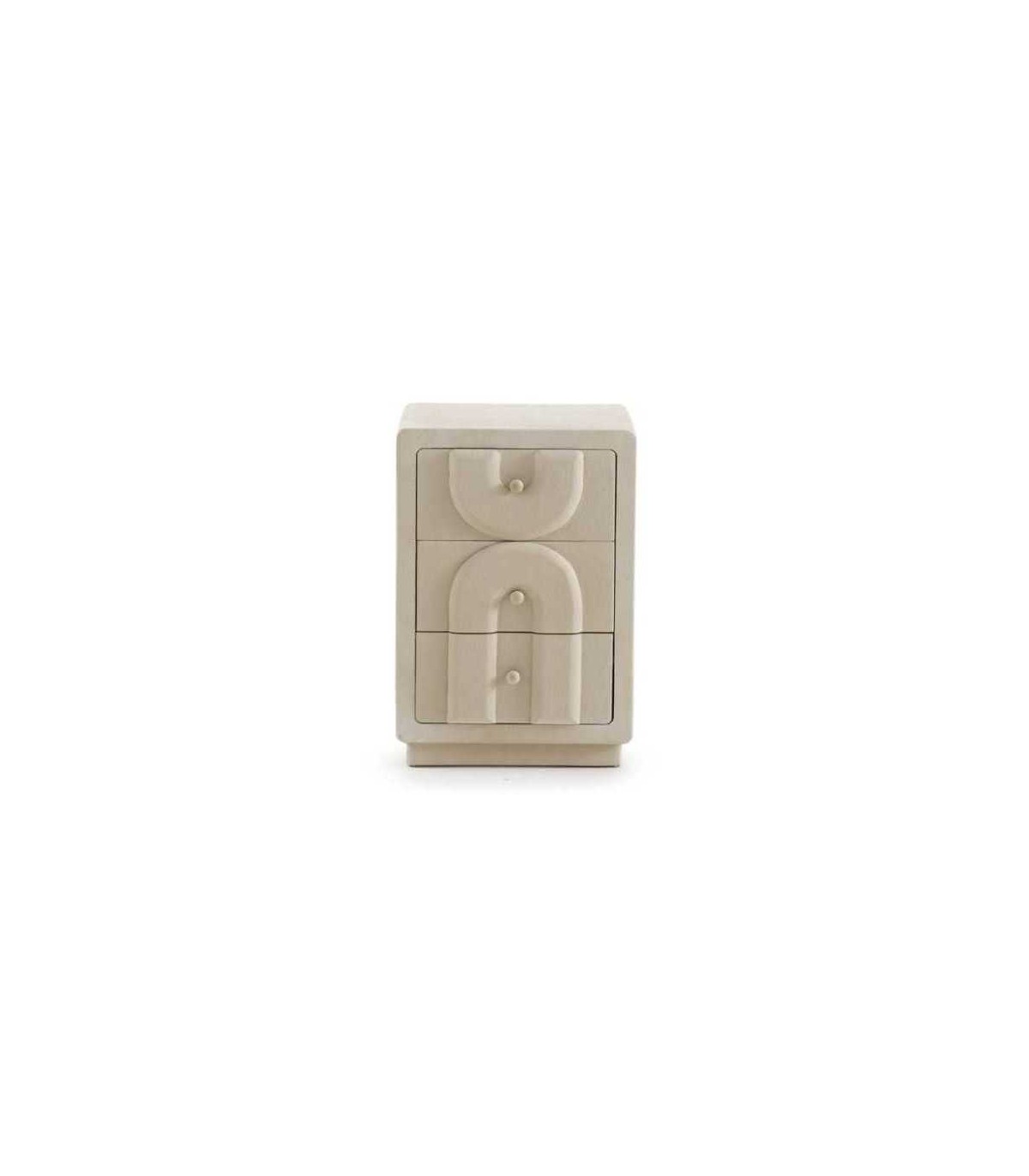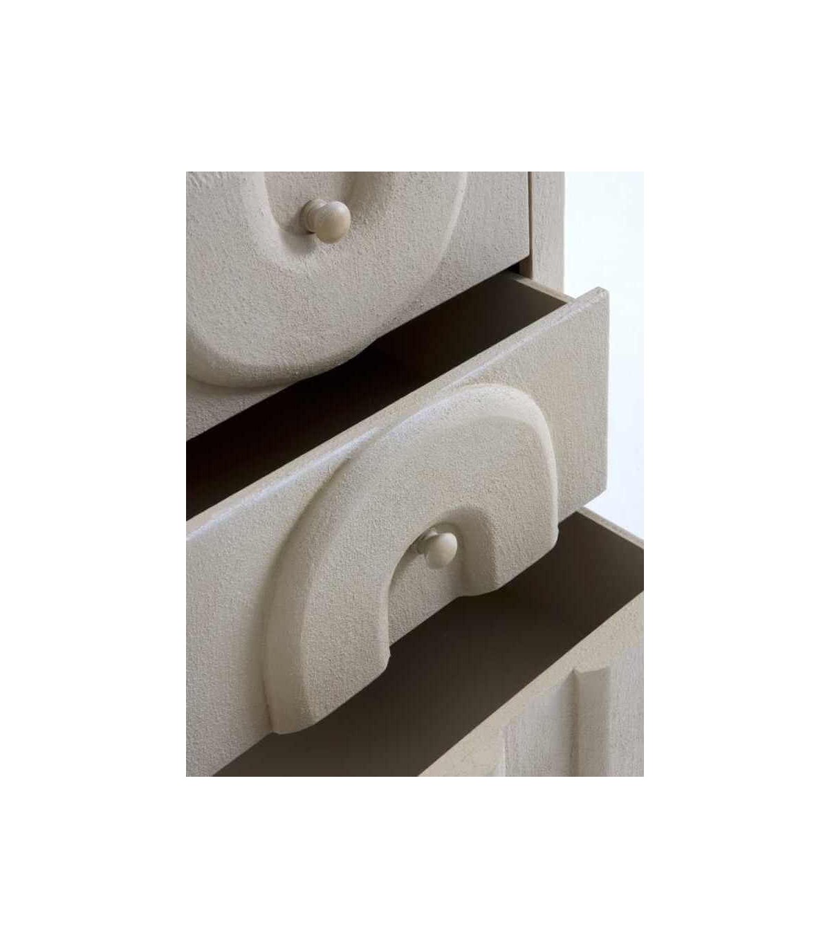 El acabado beige con efecto yeso y textura mate refuerza su carácter natural y artesanal, integrándose con facilidad en ambientes luminosos y relajados. Su formato equilibrado permite acompañar la cama sin recargar el espacio, aportando funcionalidad básica con una fuerte identidad visual.