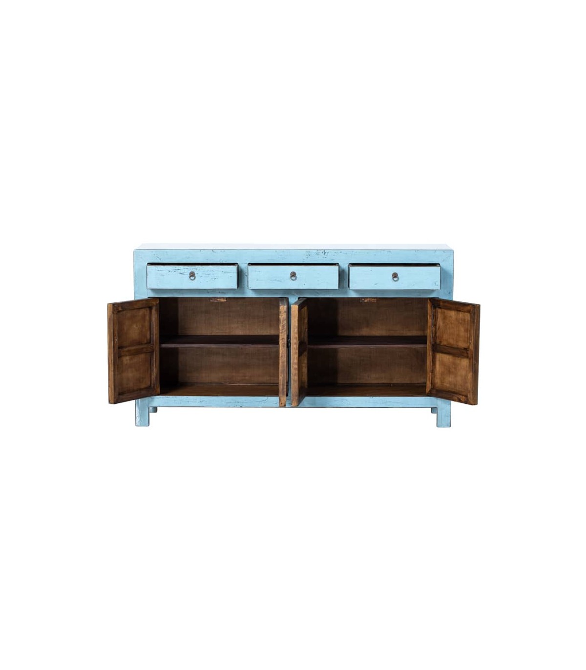 Dale un toque exclusivo y sofisticado a tu hogar con este aparador de estilo oriental, fabricado en madera maciza de olmo y lacado artesanalmente en azul brillo. Su diseño único lo convierte en un elemento decorativo excepcional.