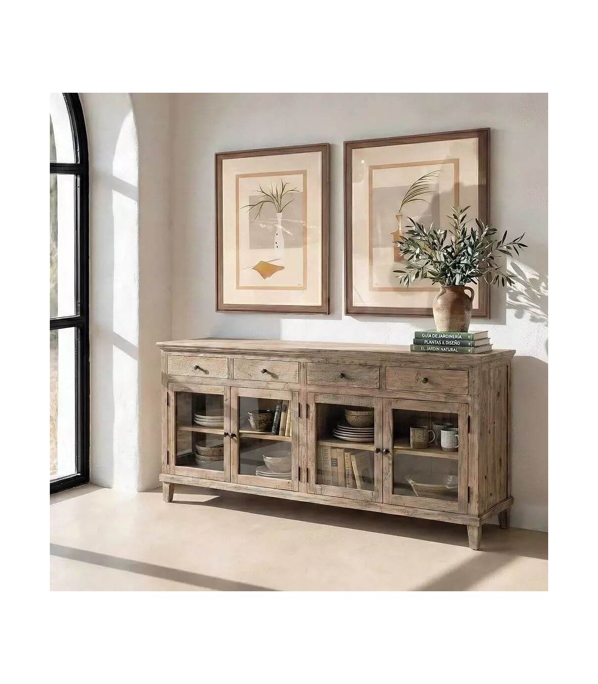 Aparador de estilo boho con una estética cálida y natural pensada para espacios amplios. Fabricado en madera maciza de pino reciclado, aporta carácter y autenticidad al ambiente. Incorpora cuatro puertas de cristal que permiten exhibir vajilla u objetos decorativos manteniendo el orden visual.