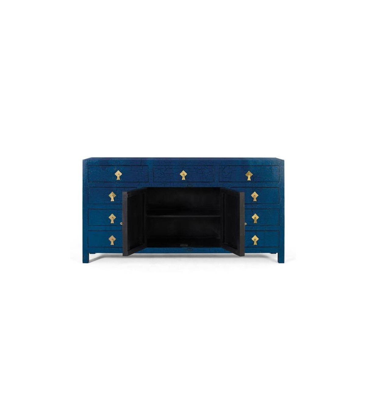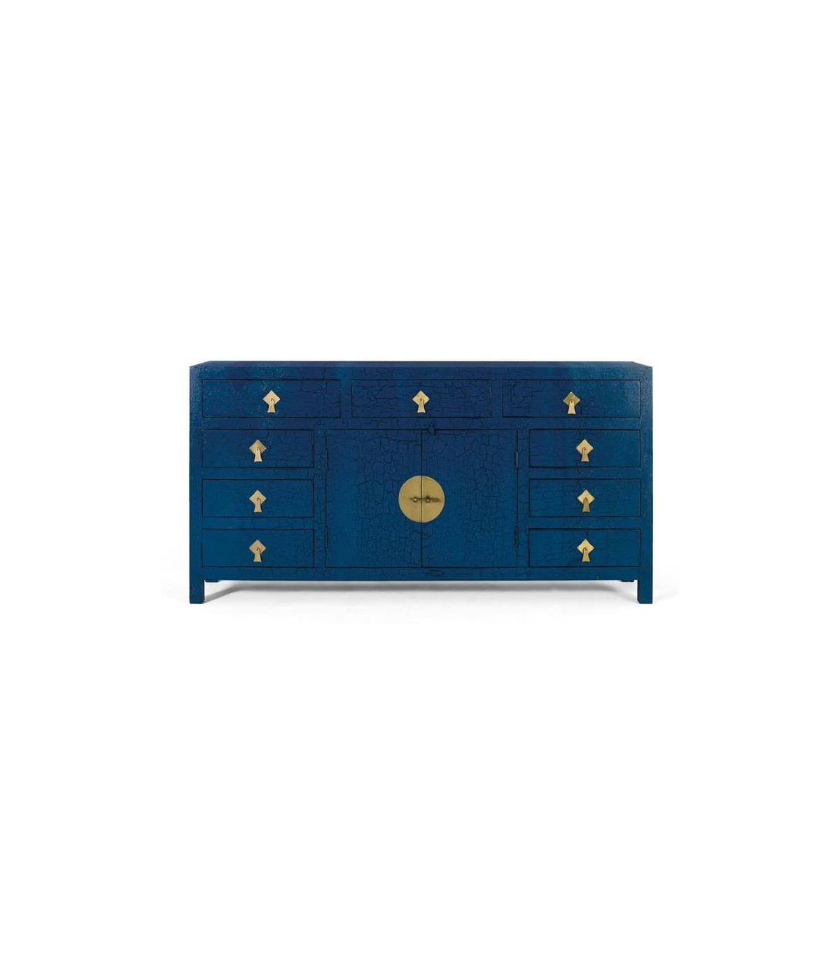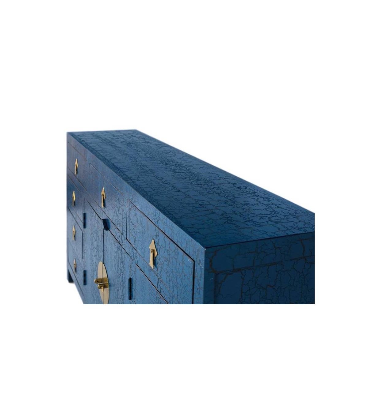 Aparador de estilo oriental con un elegante acabado lacado en color azul distressed que le confiere a la superficie un efecto desgastado.