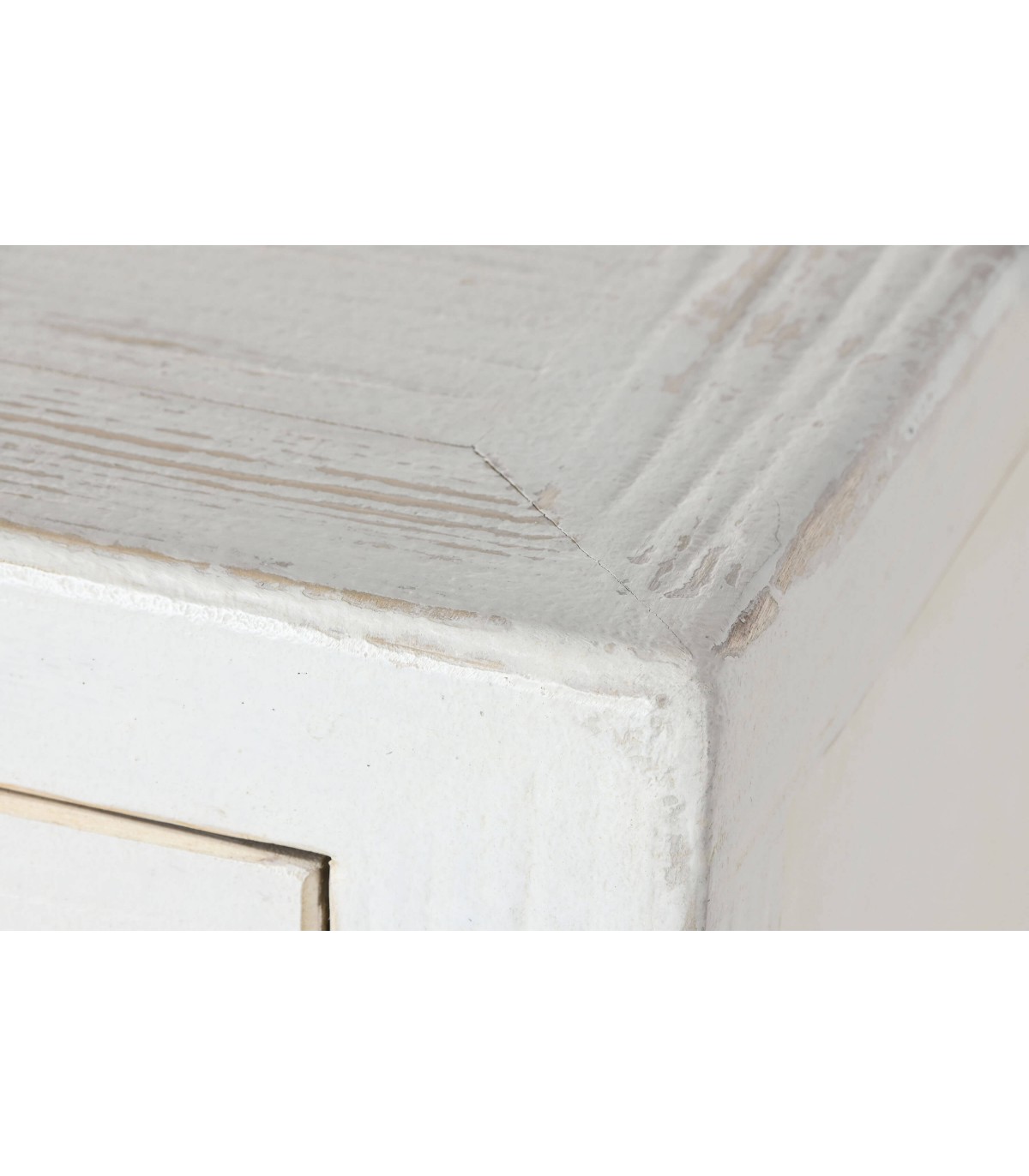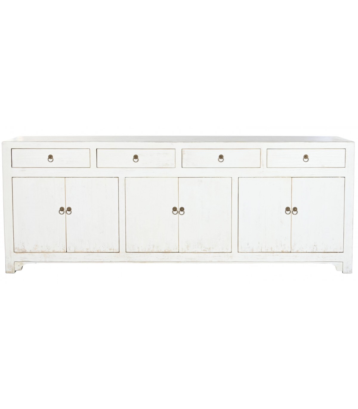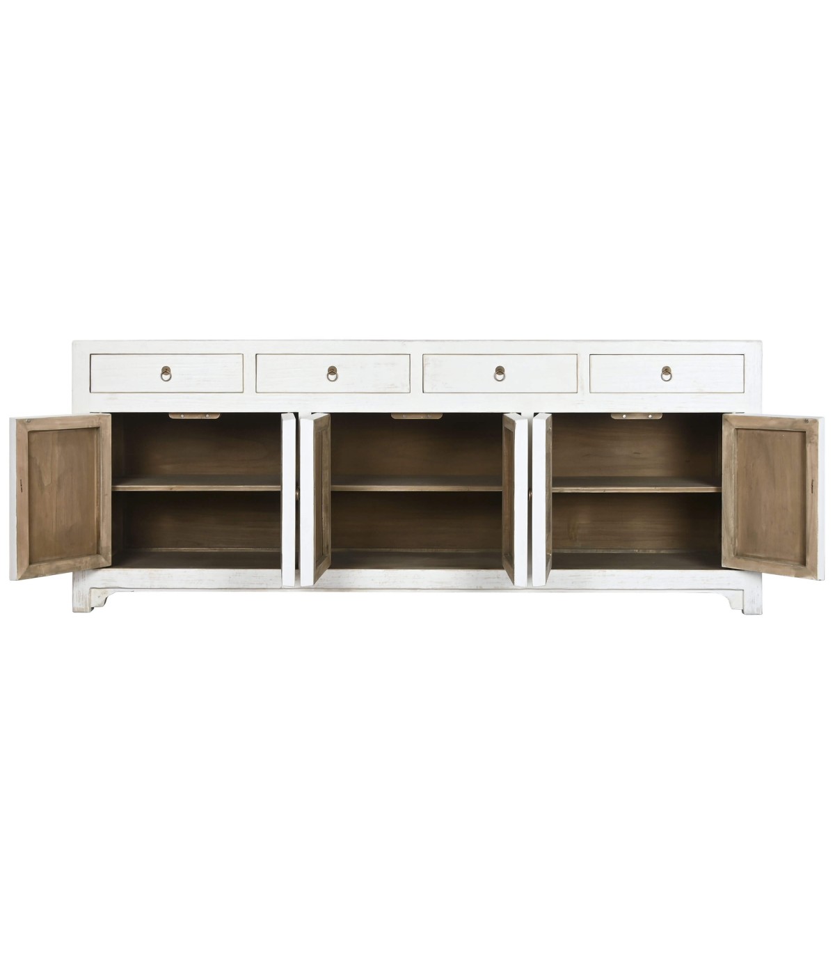 Organiza con elegancia cualquier estancia amplia gracias a este aparador de madera maciza con acabado blanco rozado a poro abierto. Su diseño rectilíneo, inspirado en la estética oriental, transmite serenidad y equilibrio visual.