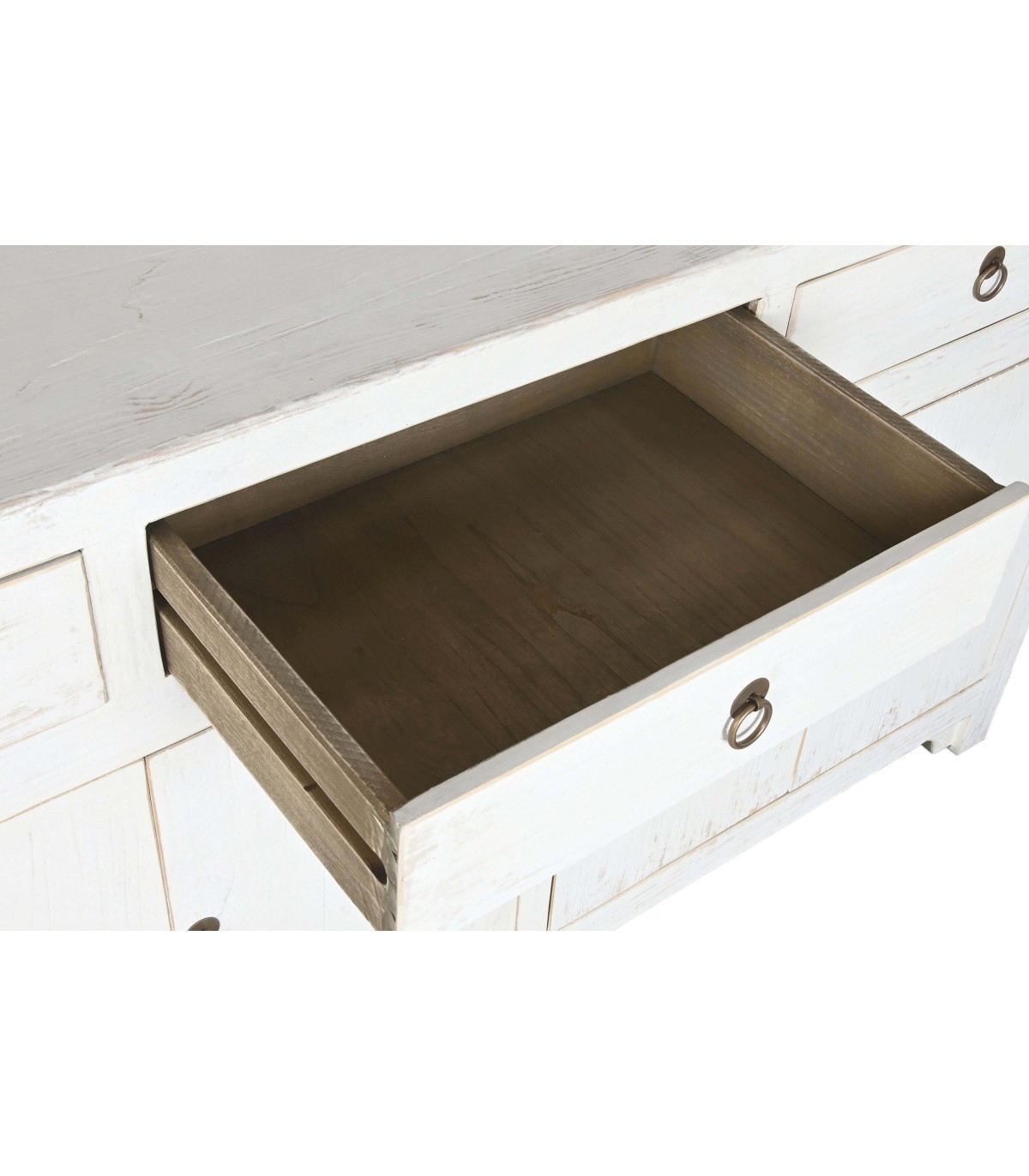 Dispone de seis amplias puertas dobles y cuatro cajones superiores con tiradores metálicos tipo anilla. Su gran capacidad lo convierte en una pieza funcional y decorativa para salones, comedores o espacios abiertos. Es perfecto para ambientes serenos, contemporáneos o étnicos donde se busque un toque de pureza y orden.