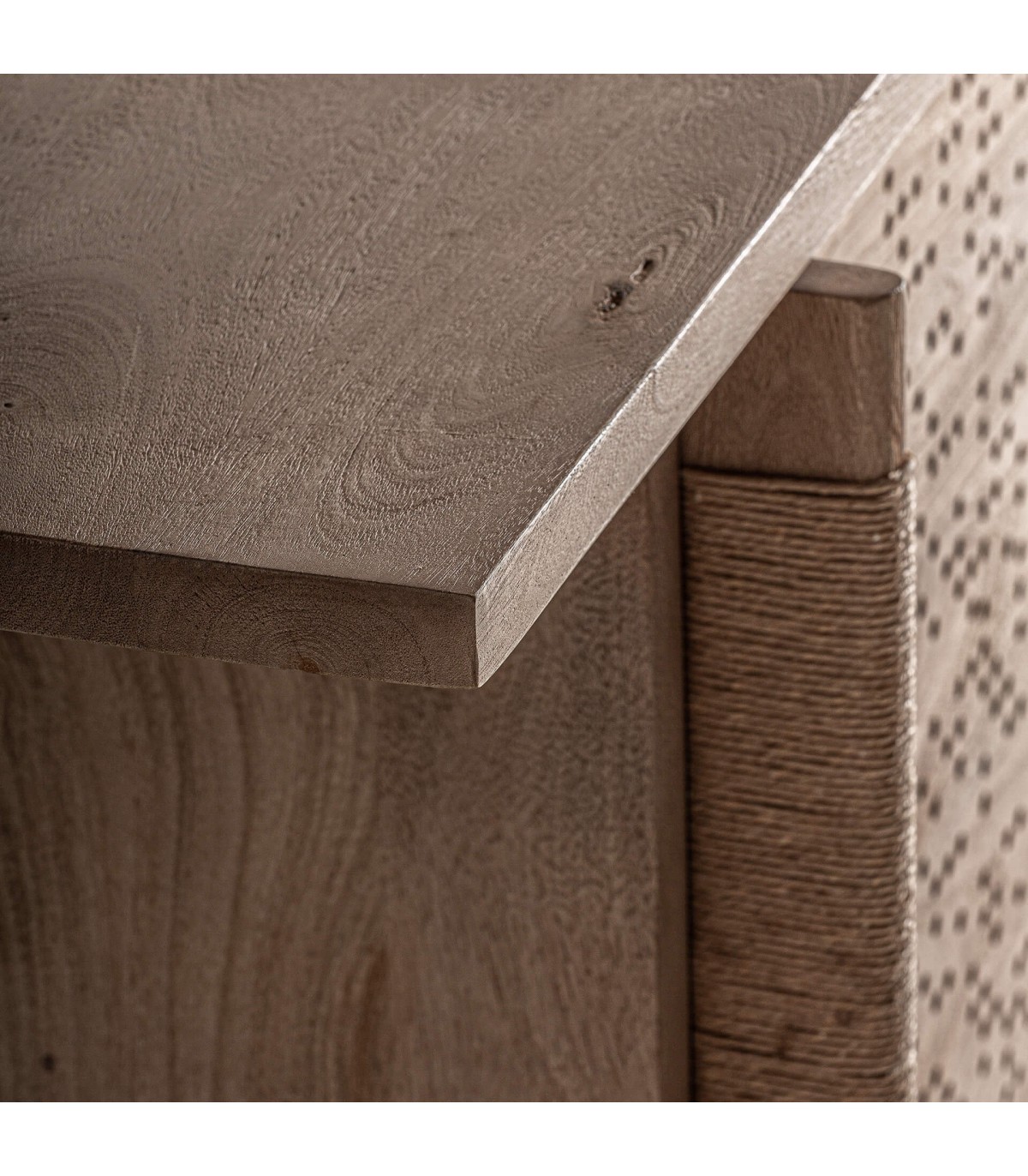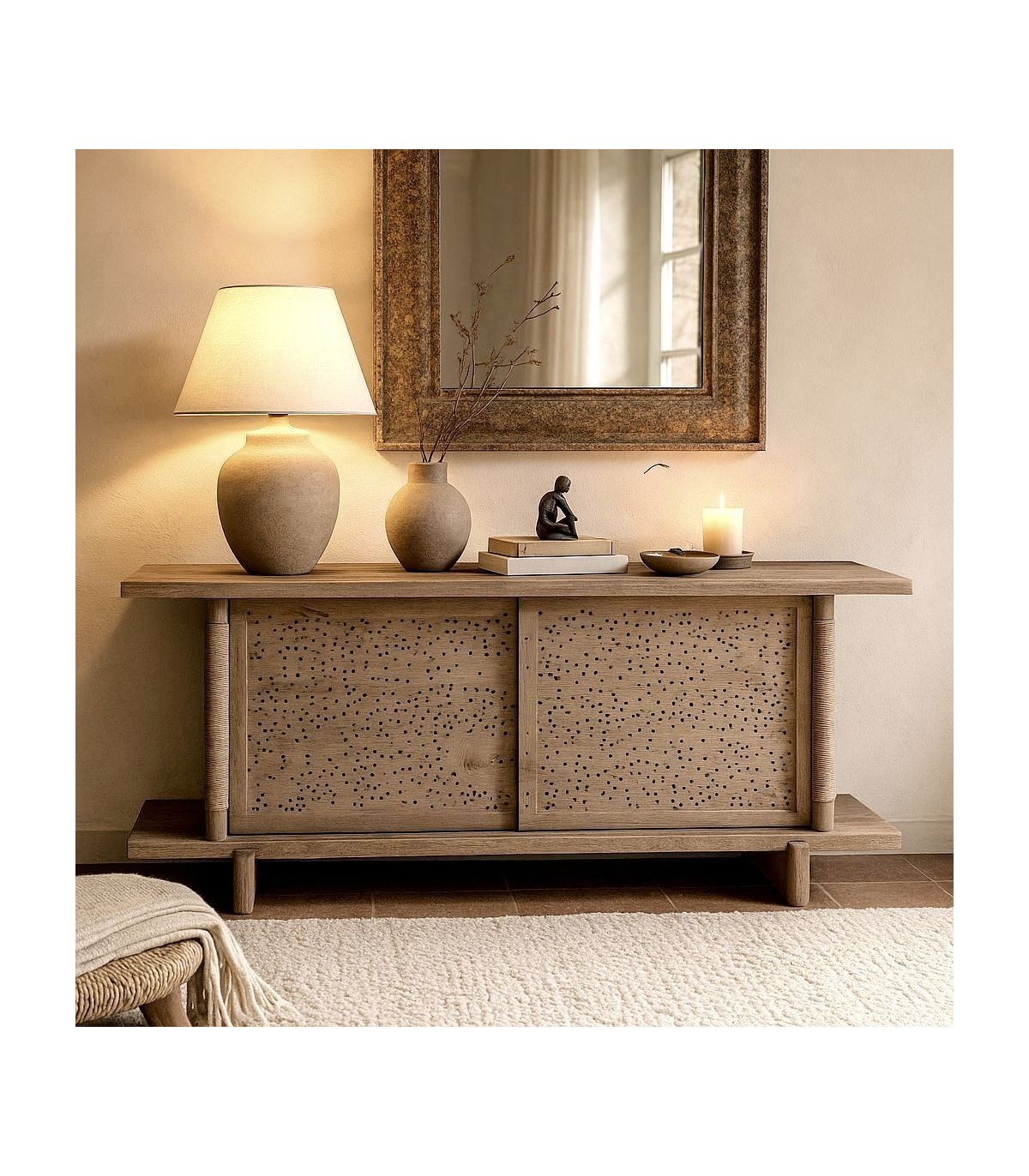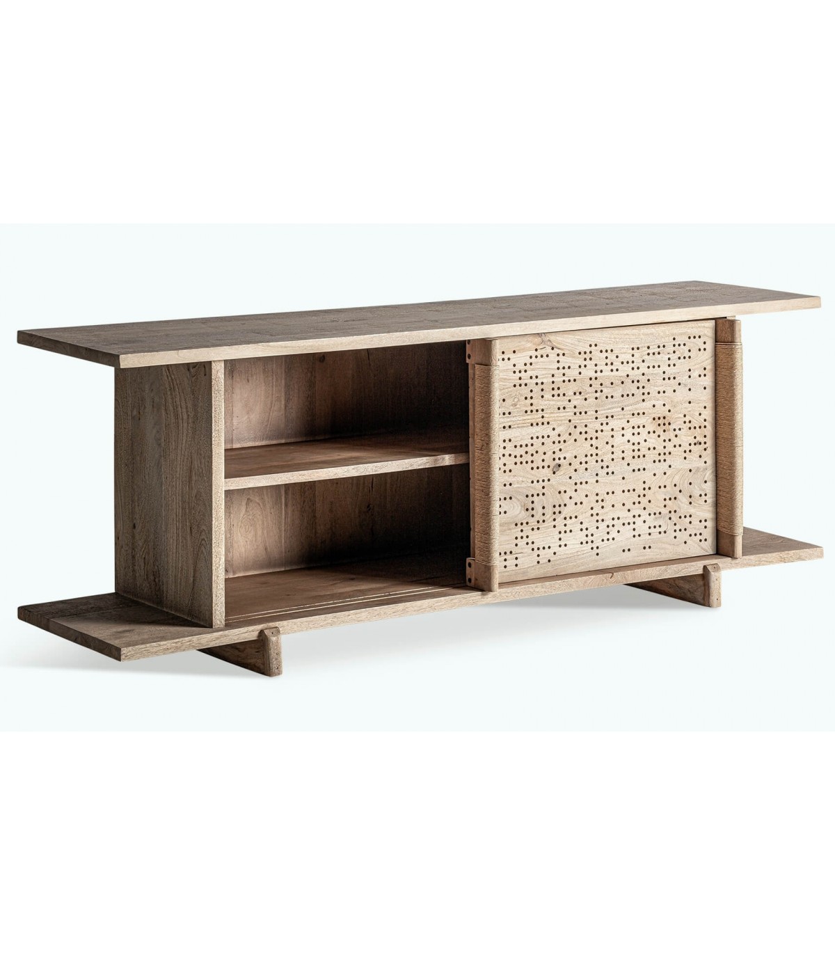 El aparador grande con puertas correderas destaca por su diseño sobrio y contemporáneo, donde la madera maciza de mango se une al cáñamo natural en una fusión cálida y equilibrada que transmite carácter sin renunciar a la armonía.