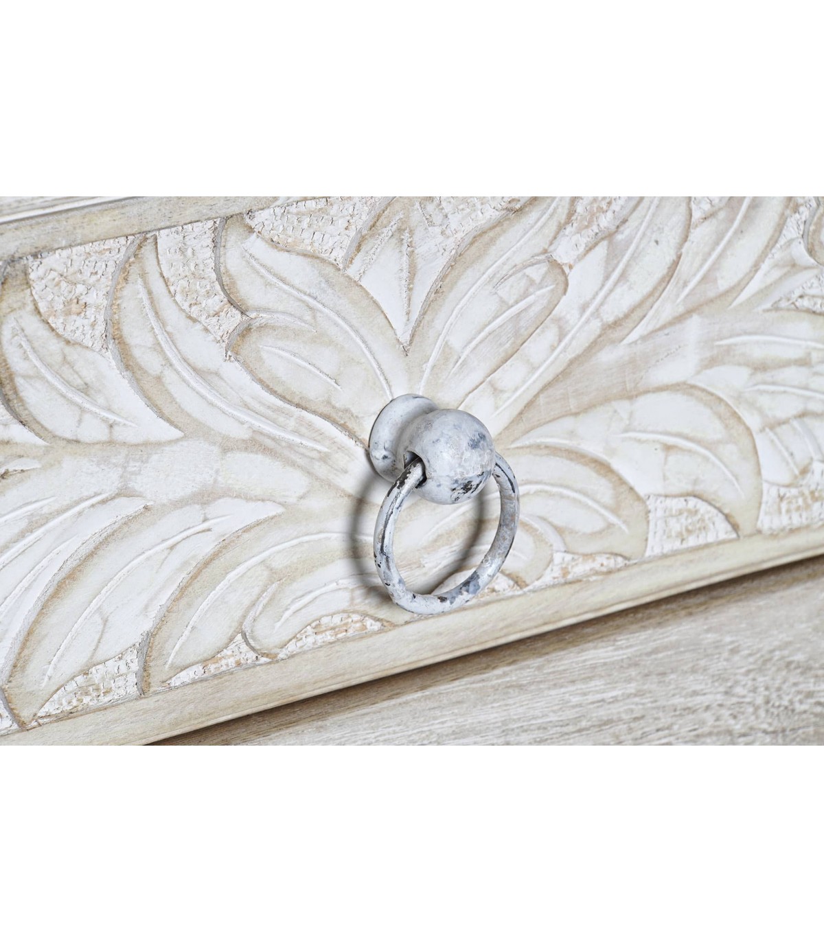 Acabado, madera maciza con los frentes de las puertas y los cajones tallados acabado blanqueado, tiradores en metal patinados a juego. Fabricación artesanal. entendemos las variaciones de tonalidad, tamaño y forma o ciertas imperfecciones (grietas, nudos, marcas) como un valor añadido que la convierten en pieza única.