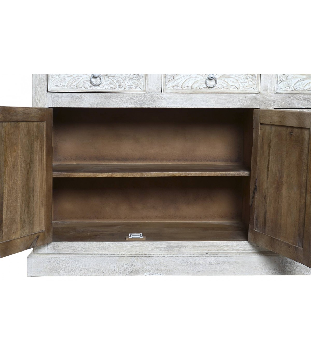 Añade estilo y capacidad de almacenamiento a tu hogar con este aparador robusto de madera maciza de mango. Destacan sus frentes tallados en las puertas y cajones con un acabado blanqueado que resalta la belleza natural de la madera. Sus tiradores en metal patinados a juego le aportan un toque vintage y sofisticado.