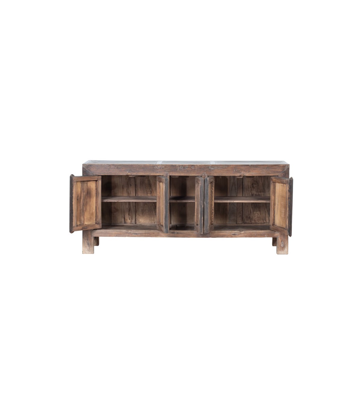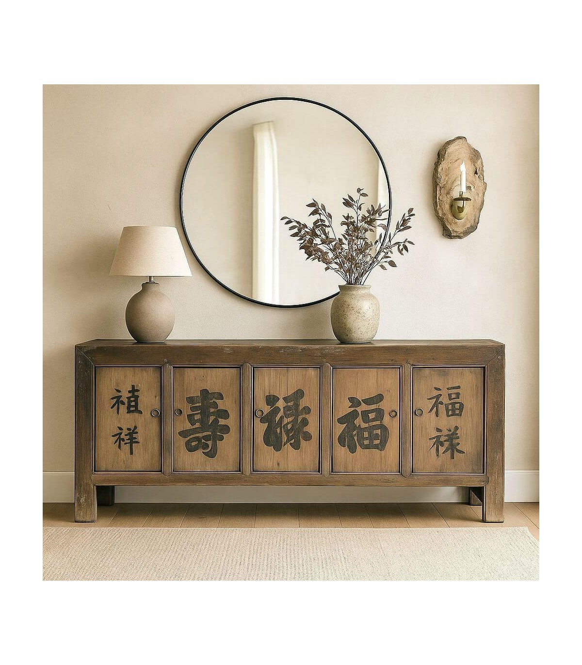 Este impresionante aparador de inspiración oriental evoca la autenticidad de las piezas antiguas del norte de China. Con una estructura robusta de madera de olmo envejecida en dos tonos, destaca por sus cinco puertas frontales decoradas a mano con caracteres tradicionales, que le aportan un aire místico y simbólico.