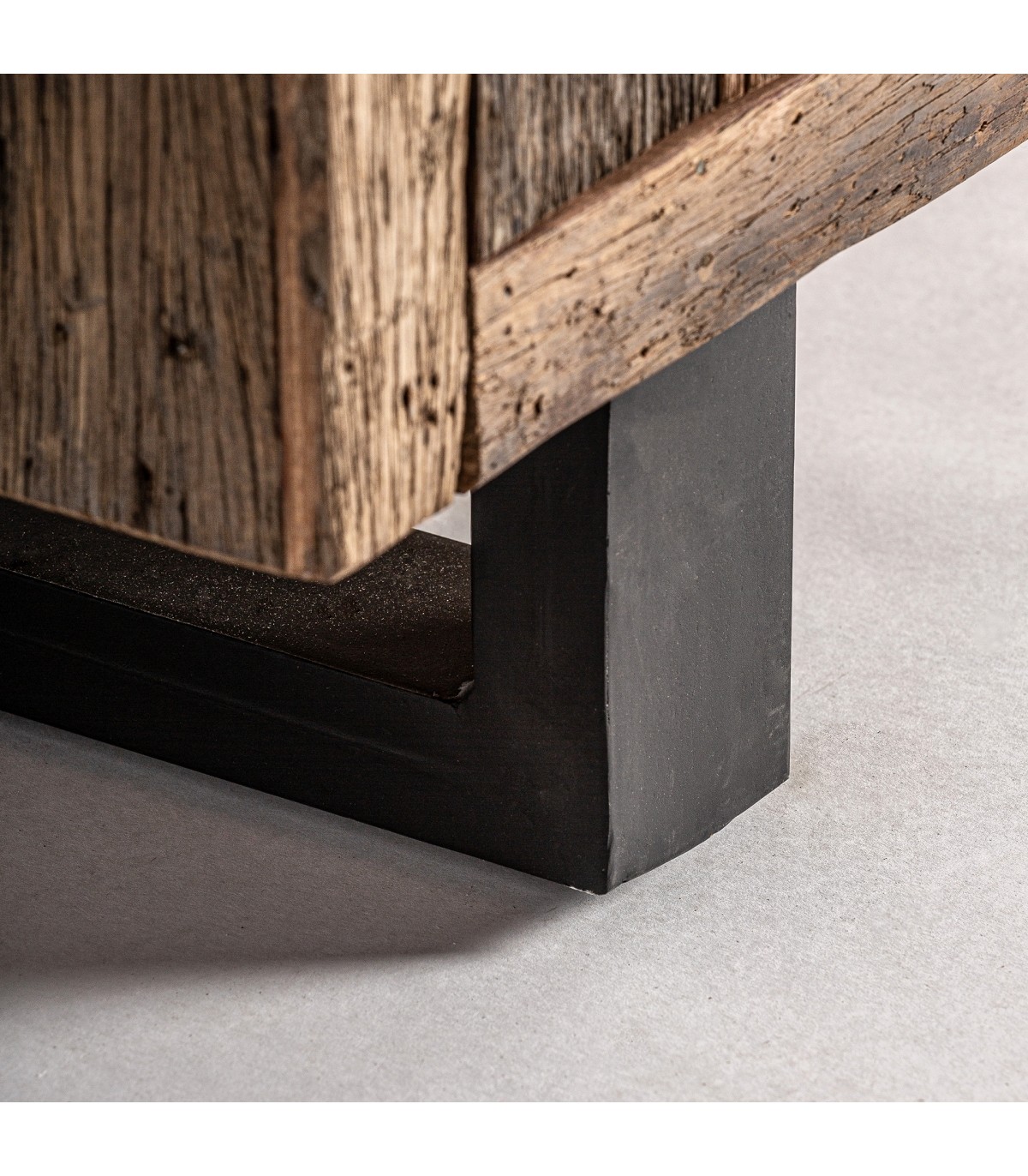 Los tiradores y patas metálicas en acabado óxido oscuro aportan fuerza visual y un contraste sofisticado. Ideal como pieza protagonista en salones, comedores o recibidores donde se valore la calidez de lo auténtico con un punto industrial.
