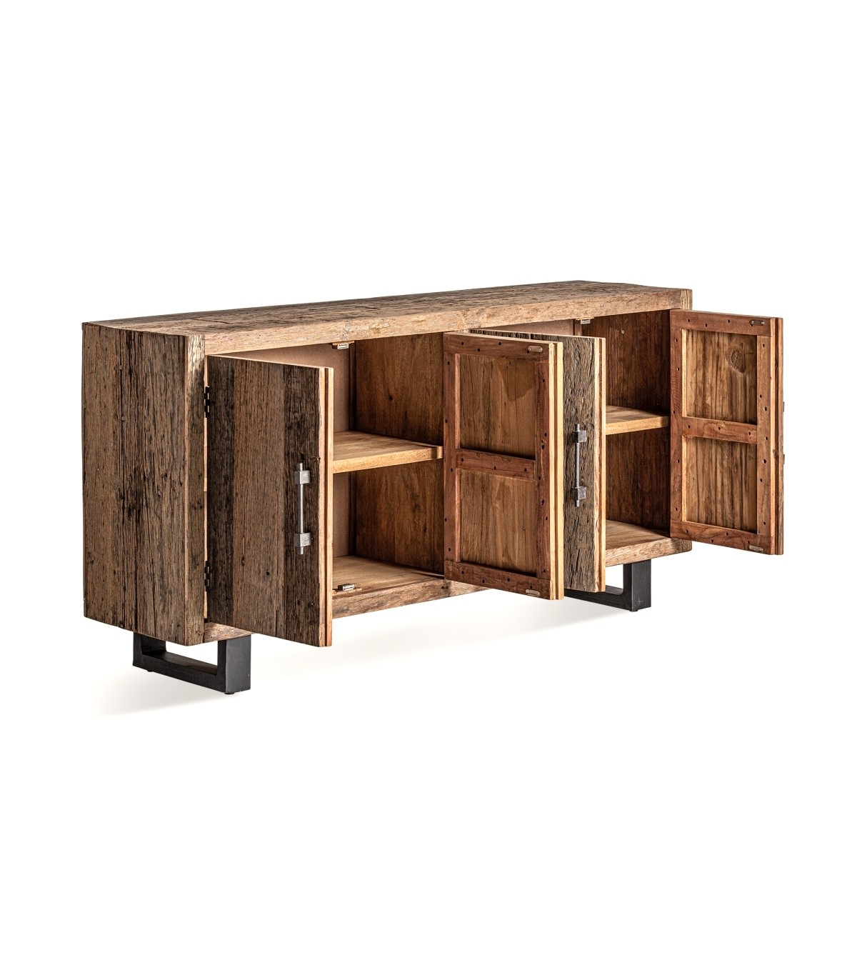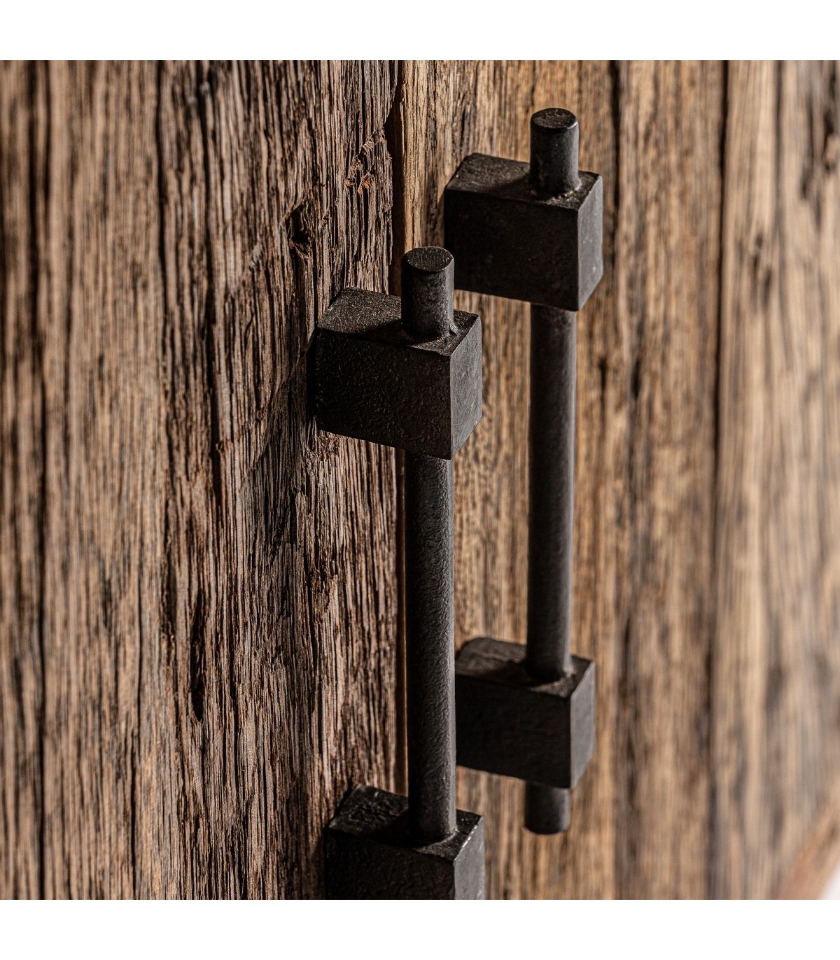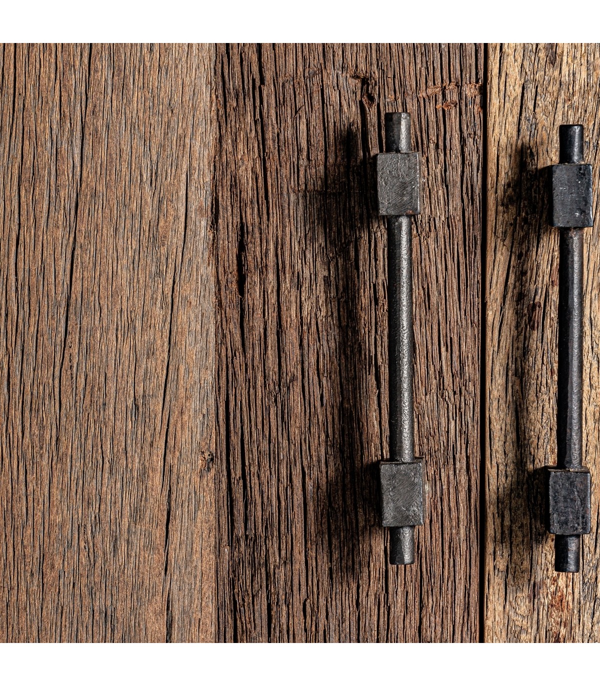 Este aparador de líneas robustas y presencia rotunda combina la nobleza de la madera de pino con el carácter del hierro forjado, evocando el encanto del mobiliario colonial auténtico. Sus puertas están realizadas con tablones macizos de pino reciclado, tratados artesanalmente para conservar su textura original, vetas marcadas y un aspecto envejecido único.