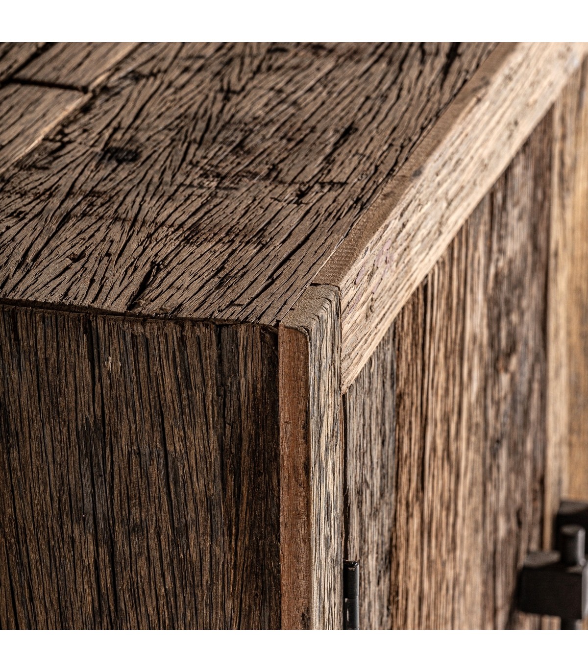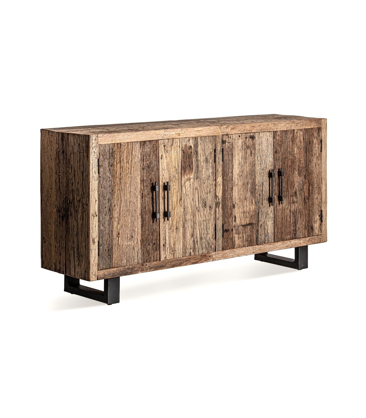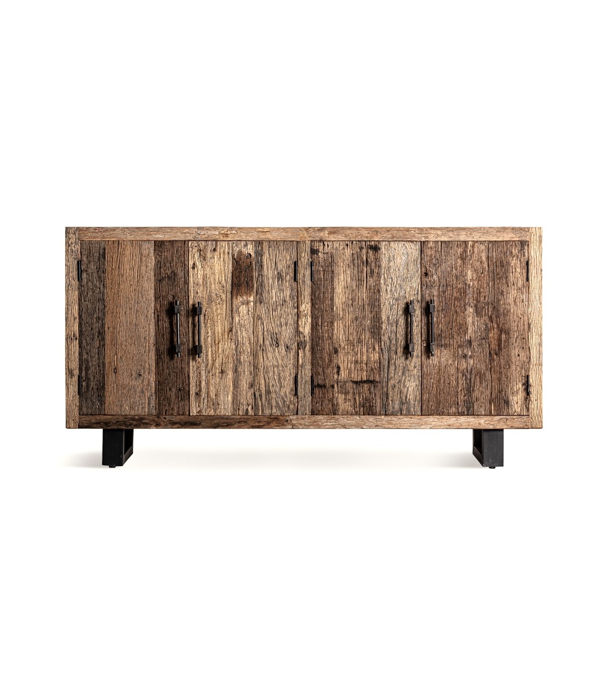 Este aparador de líneas robustas y presencia rotunda combina la nobleza de la madera de pino con el carácter del hierro forjado, evocando el encanto del mobiliario colonial auténtico. Sus puertas están realizadas con tablones macizos de pino reciclado, tratados artesanalmente para conservar su textura original, vetas marcadas y un aspecto envejecido único.