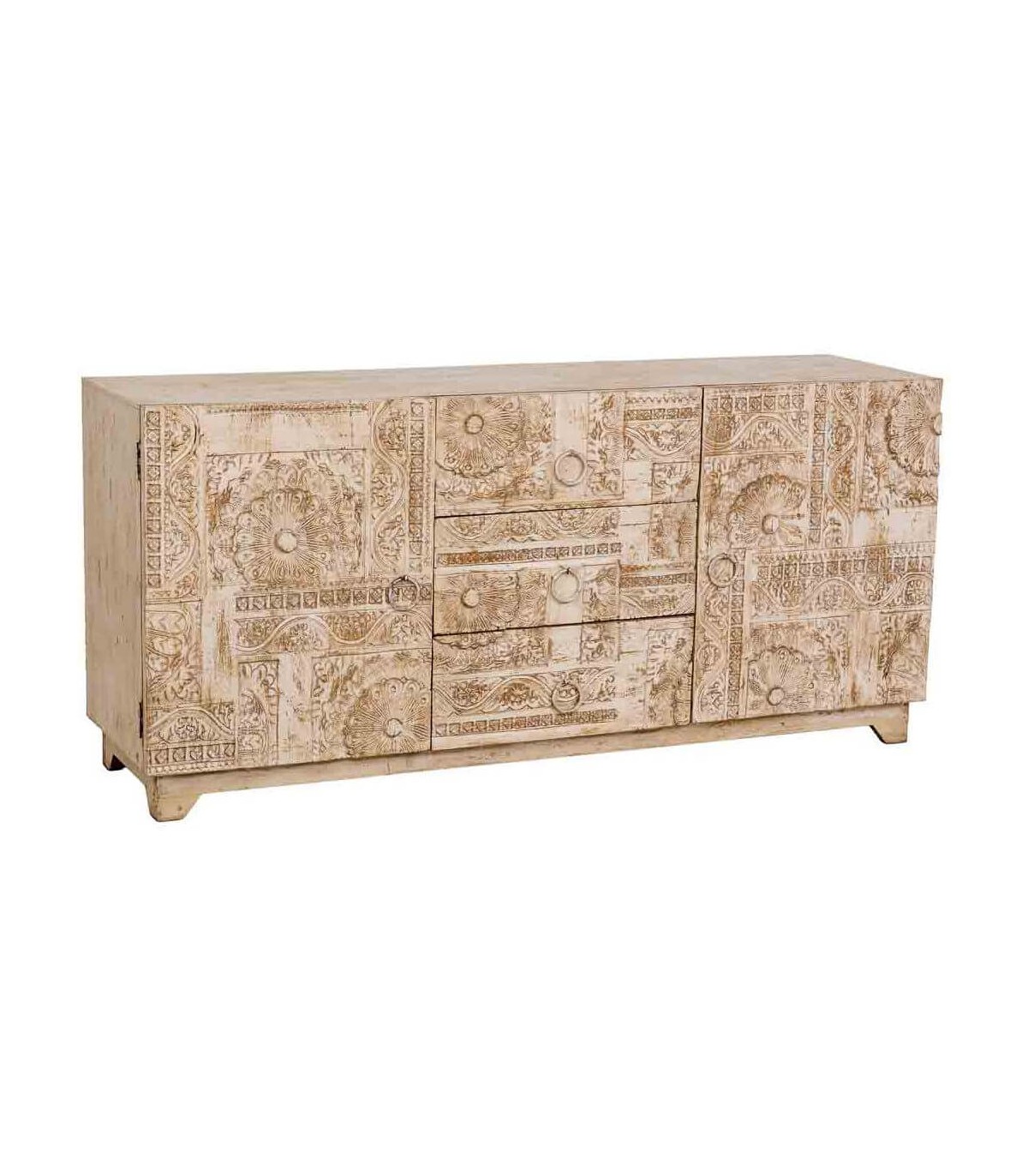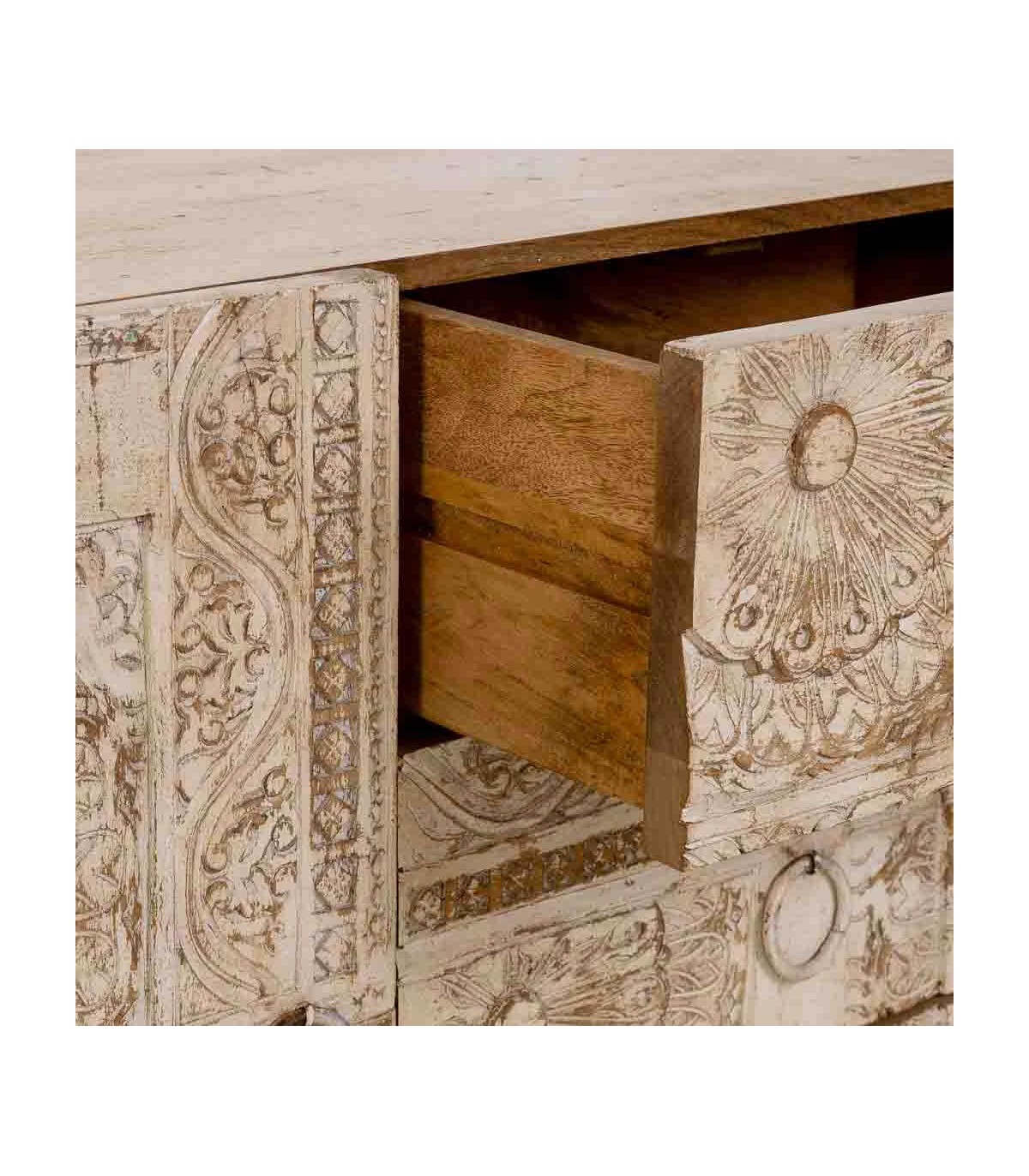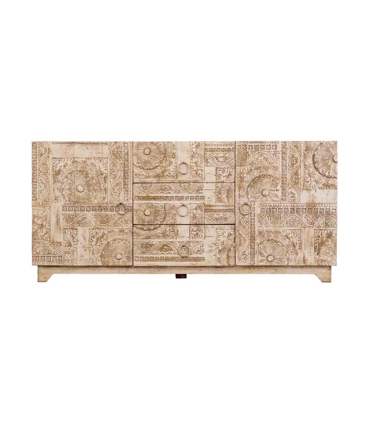 Aparador de inspiración étnica elaborado en madera maciza que aporta una presencia cálida y artesanal a espacios con personalidad. El acabado crema decapado y patinado deja ver la riqueza de la talla manual, creando un juego de relieves que transmite autenticidad sin resultar recargado.